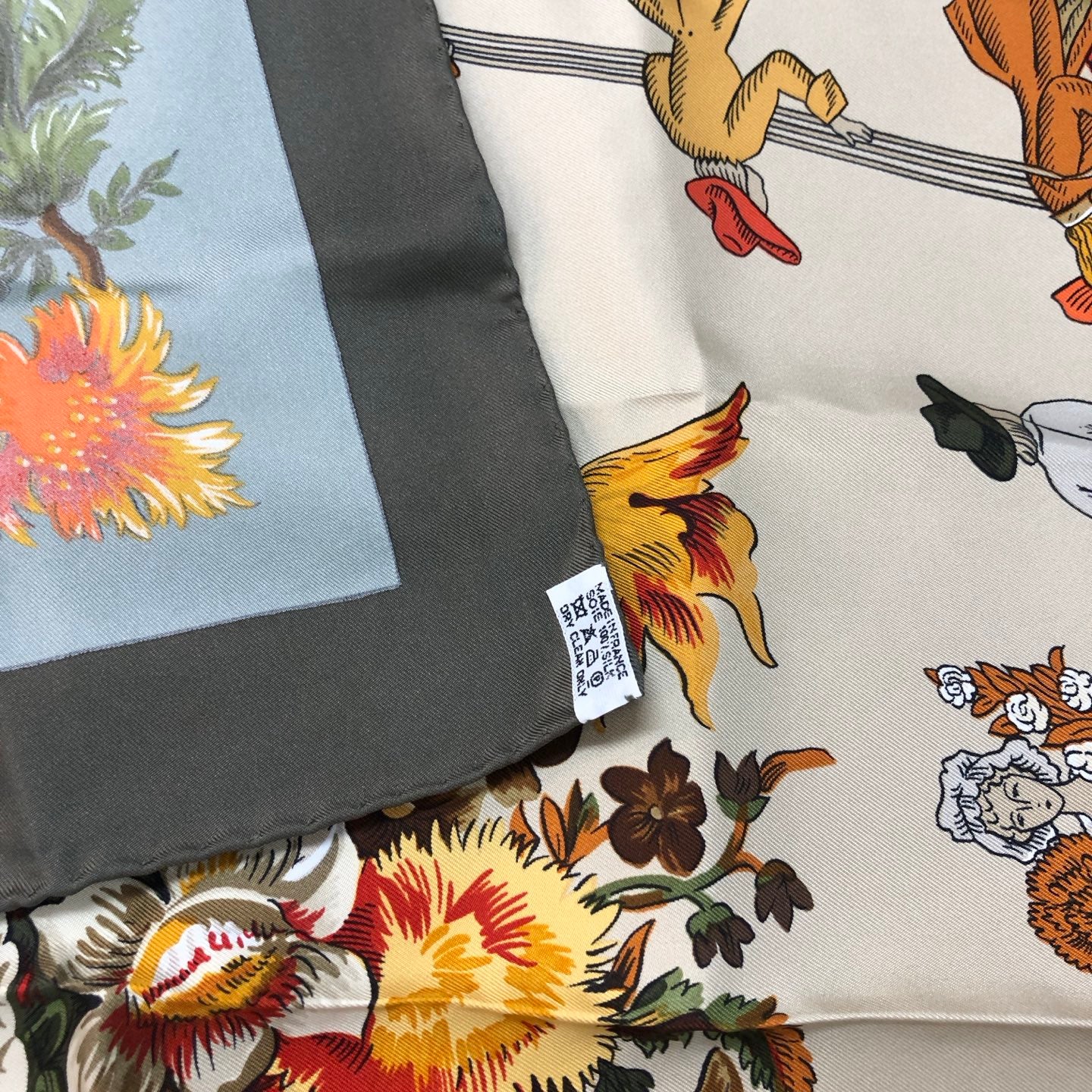 Superbe carré Hermès 90×90 cm en soie naturelle, orné du motif iconique “Les Jardiniers du Roy”. Ce dessin rend hommage aux jardins royaux et à l’art botanique français, illustré avec la précision et la finesse propres à la Maison Hermès.