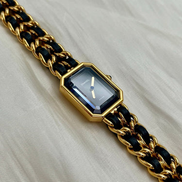 Raffinée montre Chanel La première (mouvement quartz)dans une élégante combinaison noir et or. Ce modèle emblématique reflète l’esthétique iconique de la Maison  minimalisme, féminité et élégance absolue.
