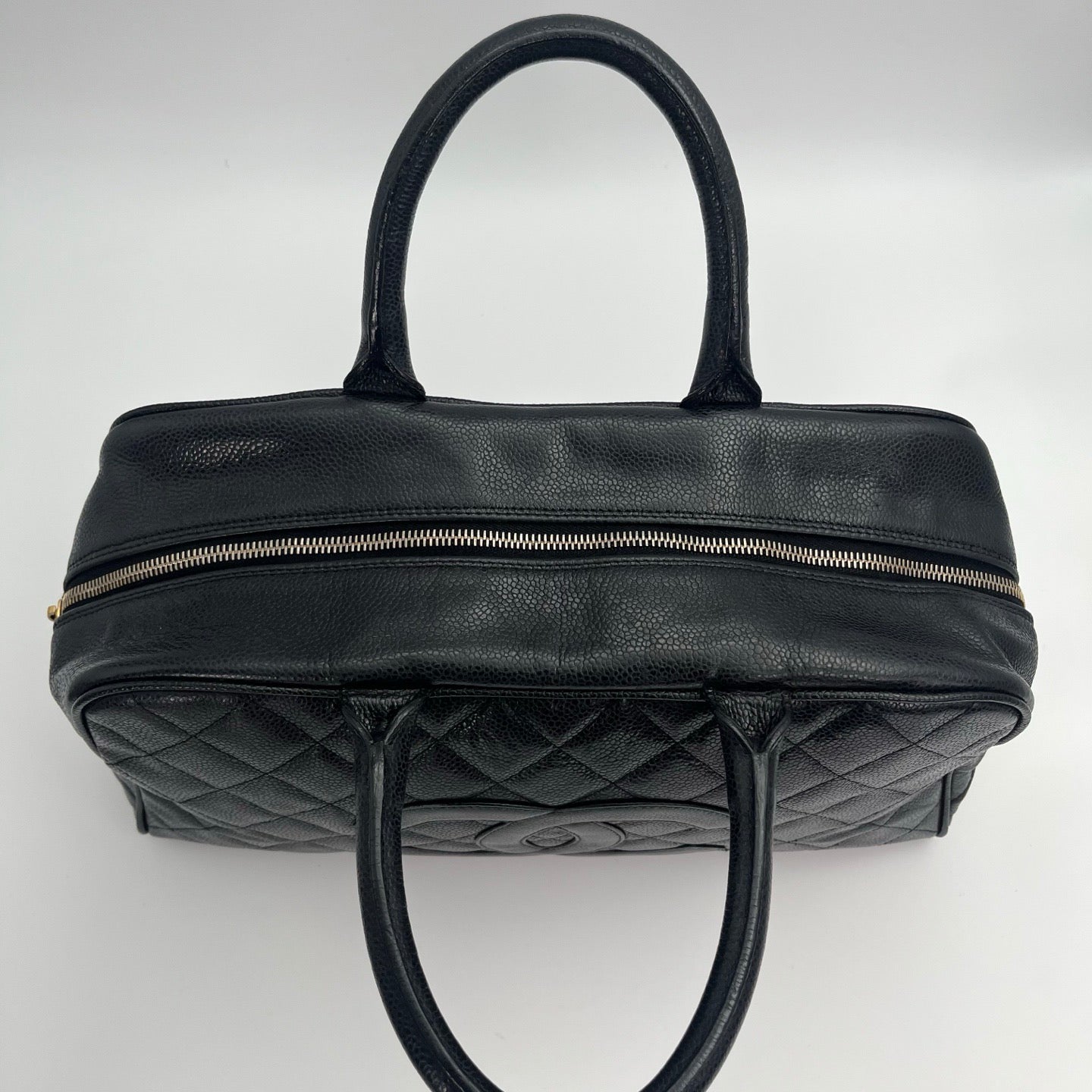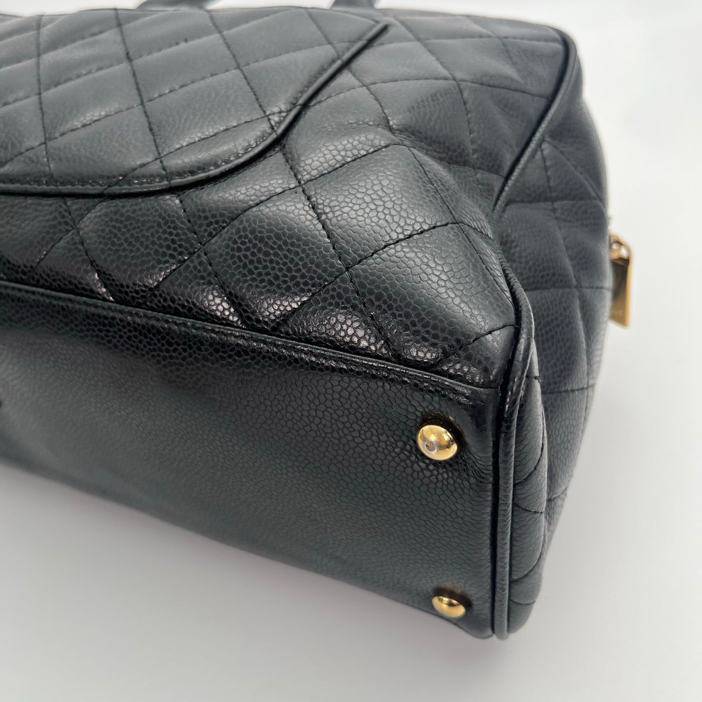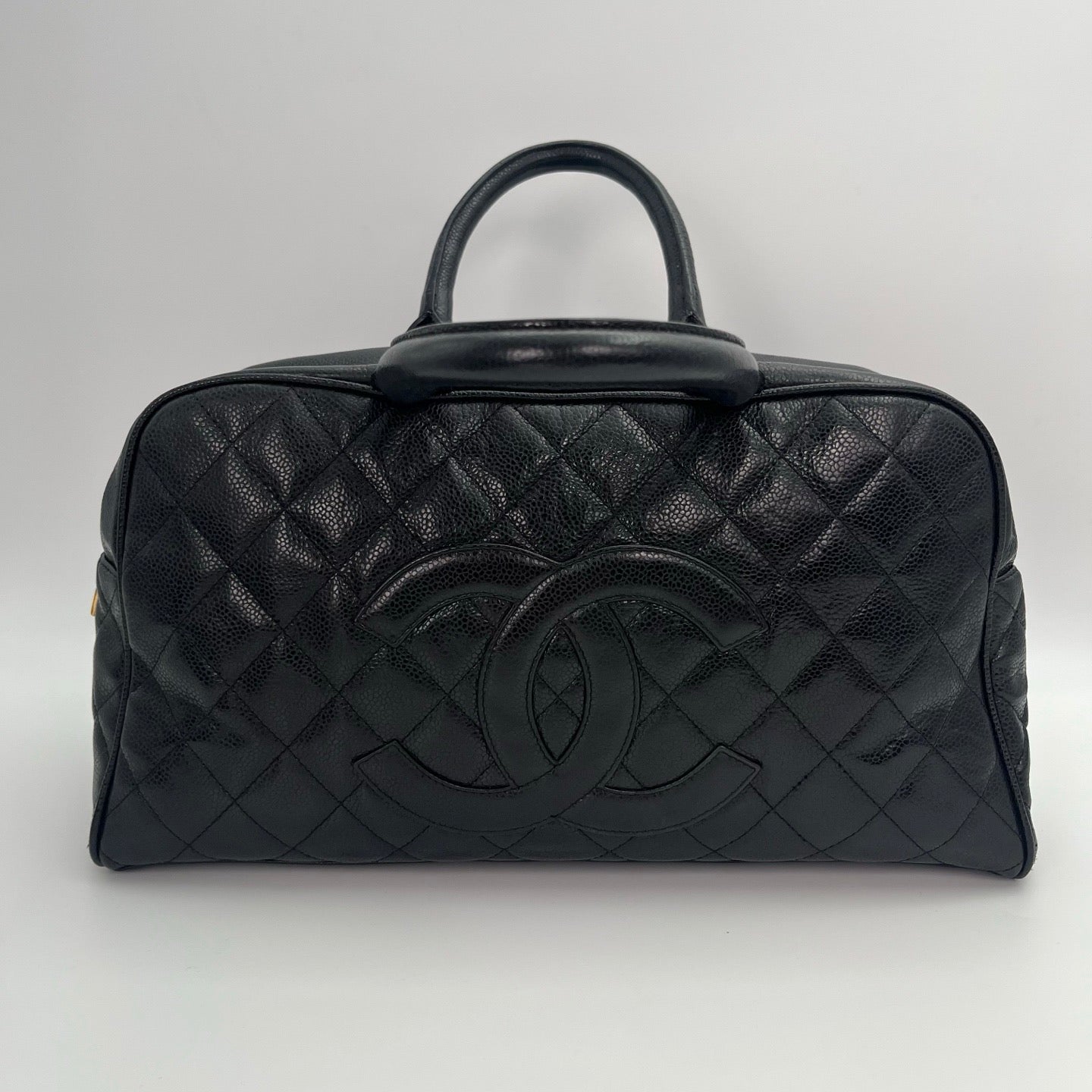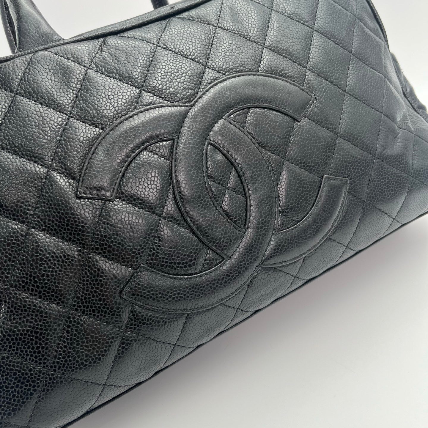 Sac bowling Chanel en cuir noir, logo XXL embossé et finitions noir-doré. Format compact parfait pour le quotidien, silhouette arrondie, allure chic et discrète. Modèle recherché et difficile à trouver.