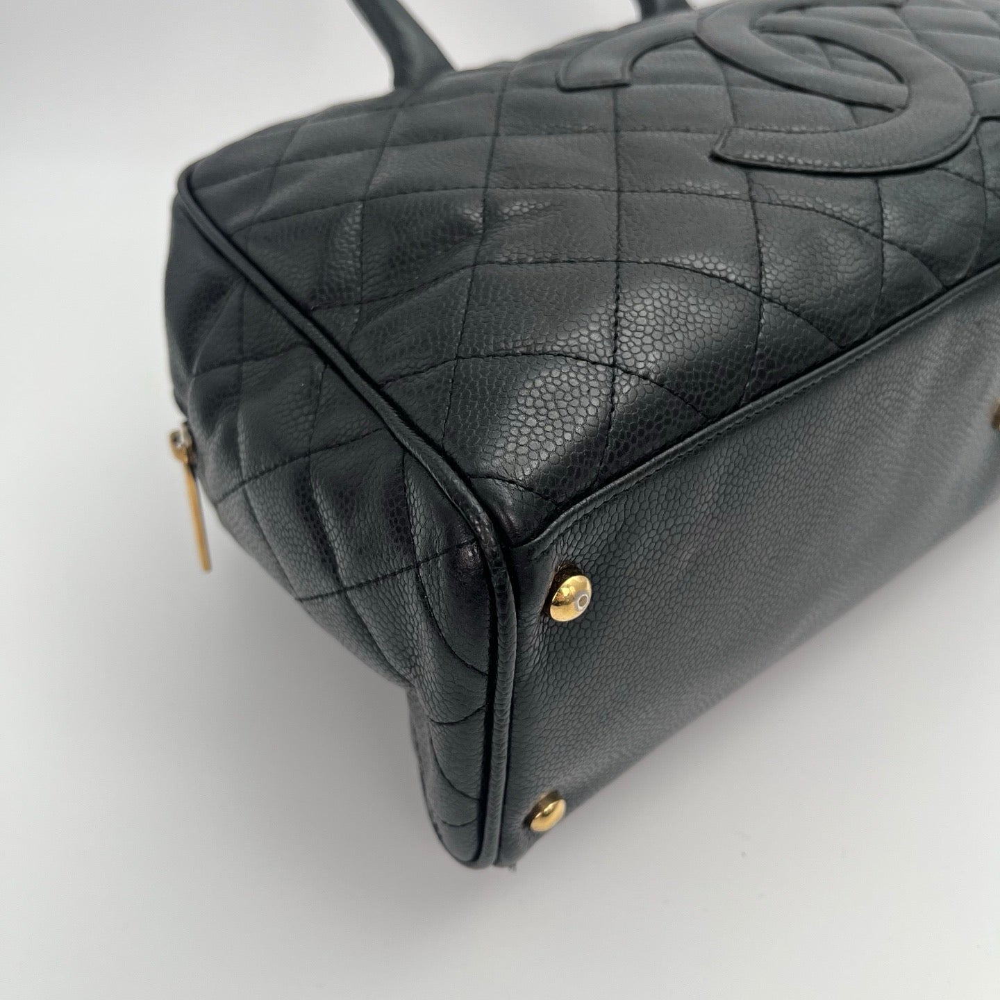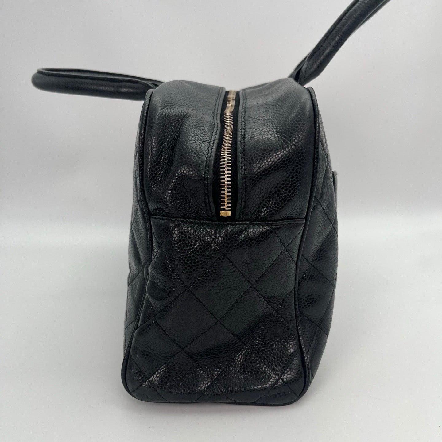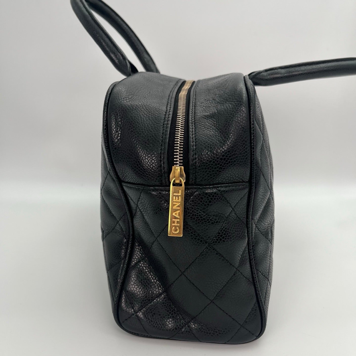 Sac bowling Chanel en cuir noir, logo XXL embossé et finitions noir-doré. Format compact parfait pour le quotidien, silhouette arrondie, allure chic et discrète. Modèle recherché et difficile à trouver.