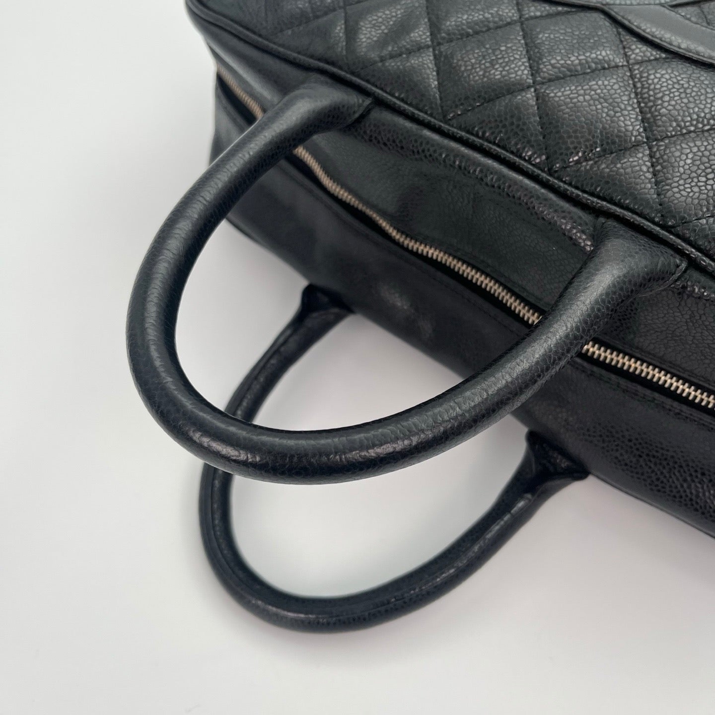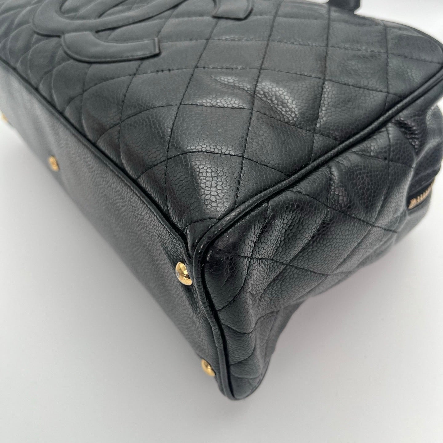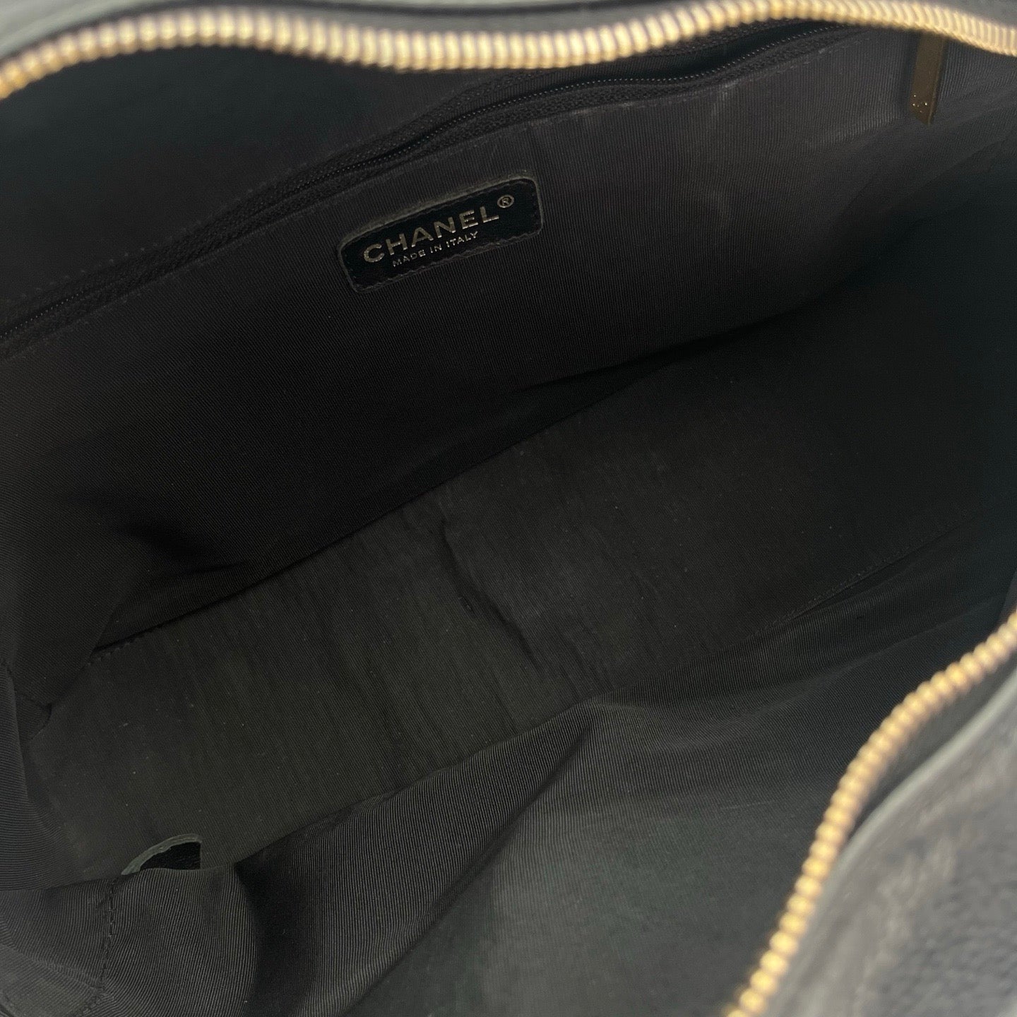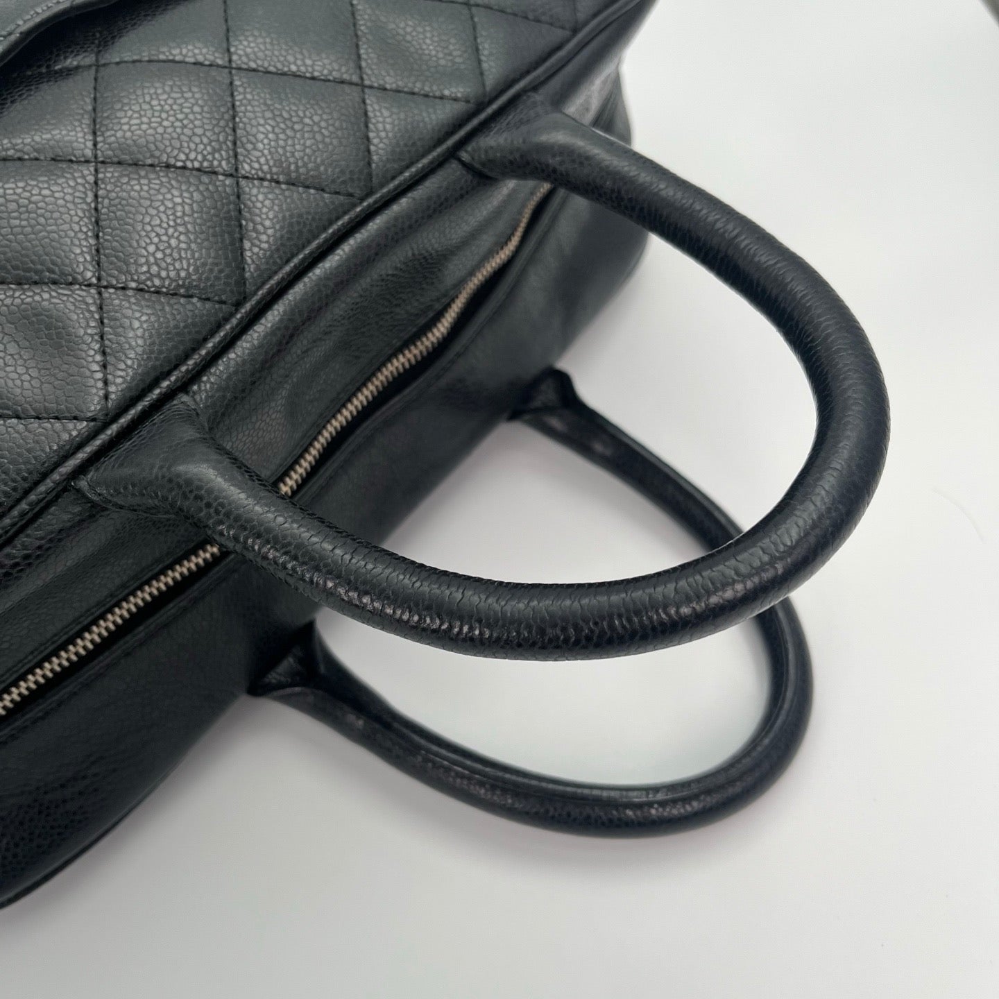 Sac bowling Chanel en cuir noir, logo XXL embossé et finitions noir-doré. Format compact parfait pour le quotidien, silhouette arrondie, allure chic et discrète. Modèle recherché et difficile à trouver.