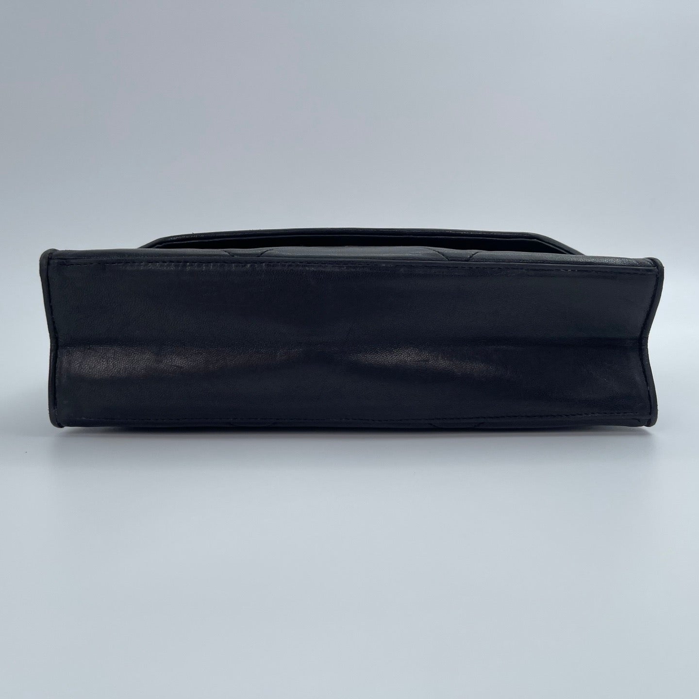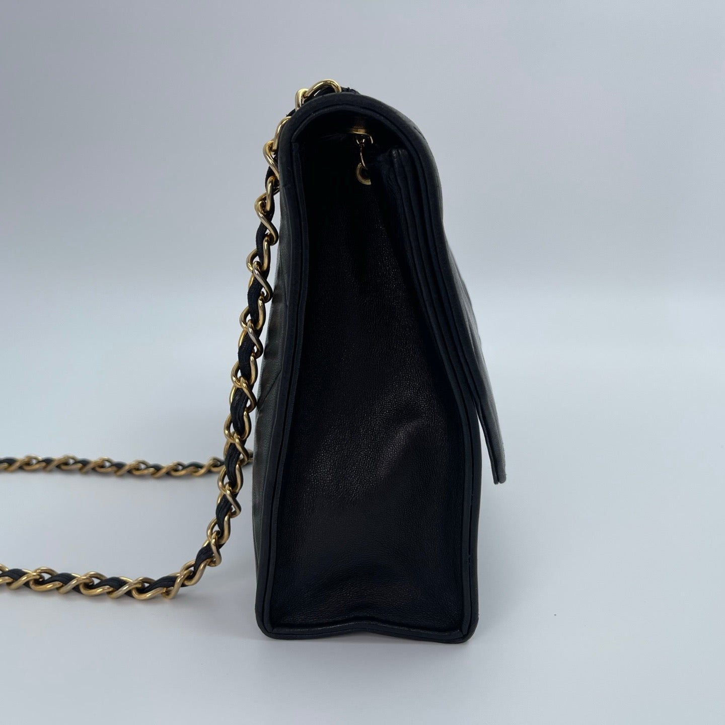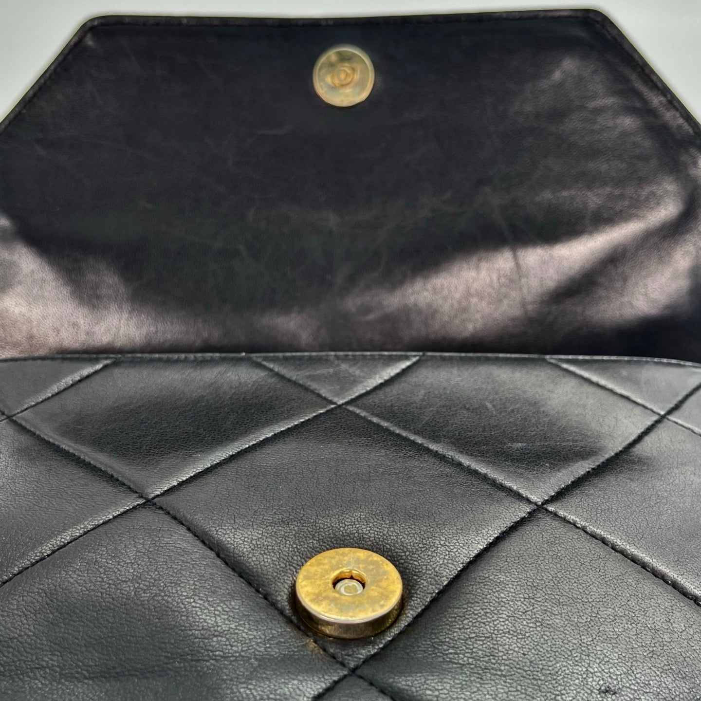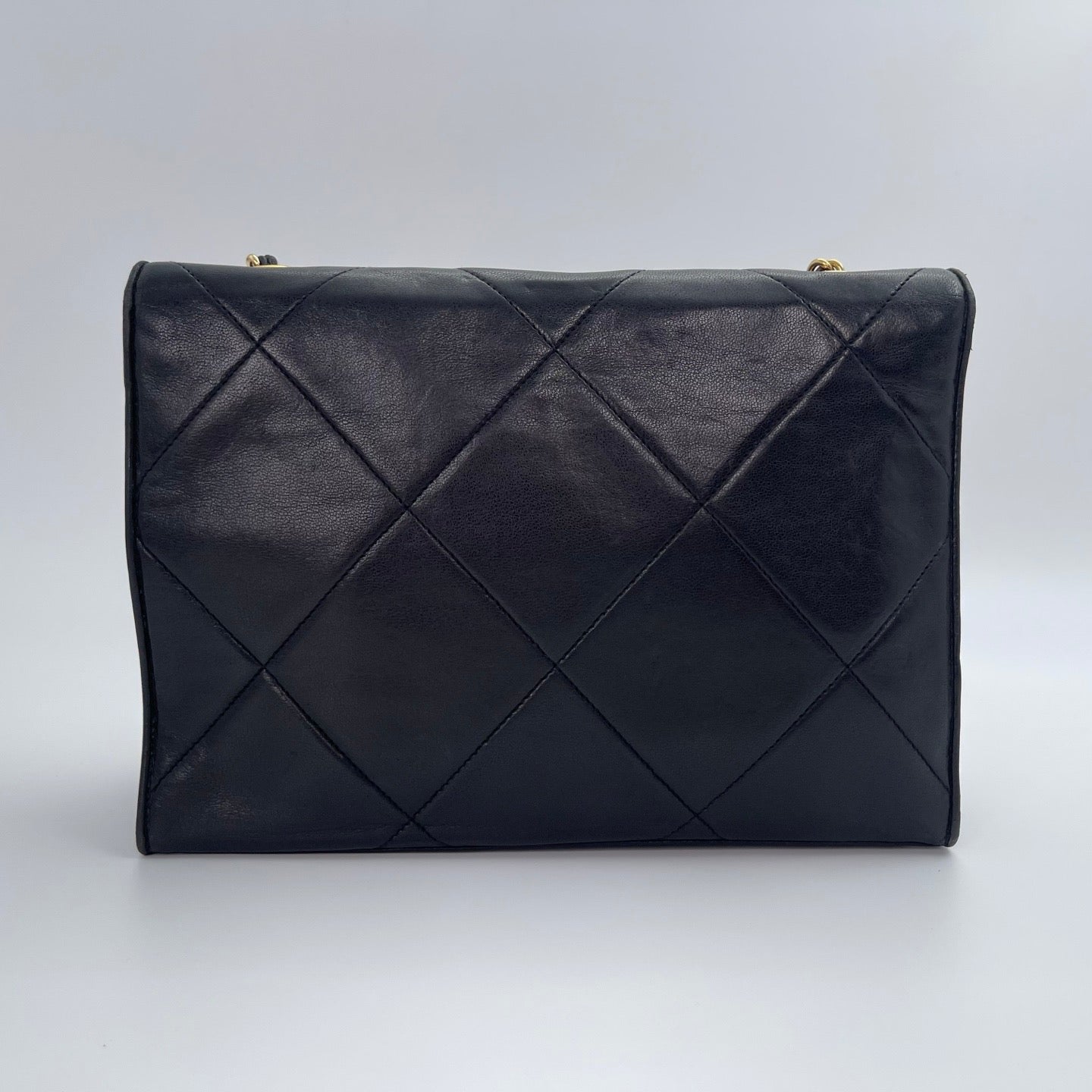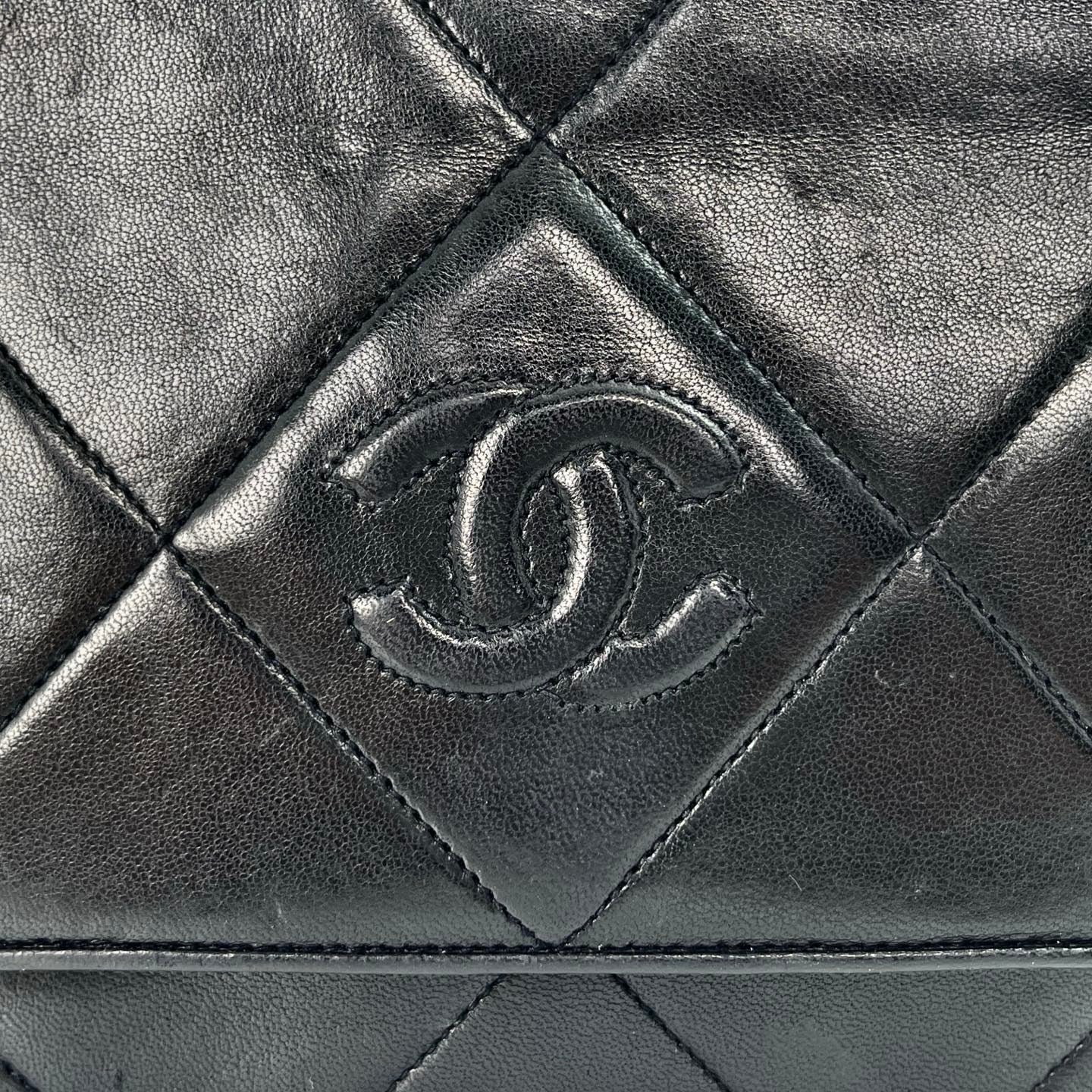 Exceptionnel Chanel Camera Bag vintage en cuir d’agneau noir matelassé, orné du logo Chanel embossé sur le rabat et d’une chaîne dorée entrelacée de cuir.
