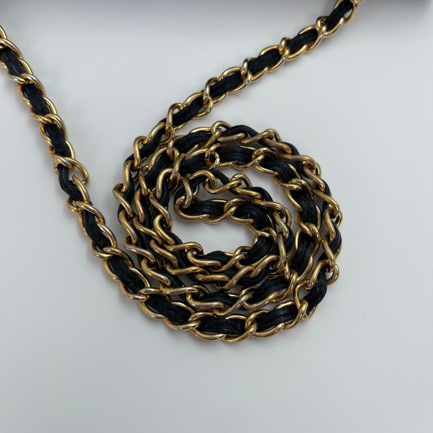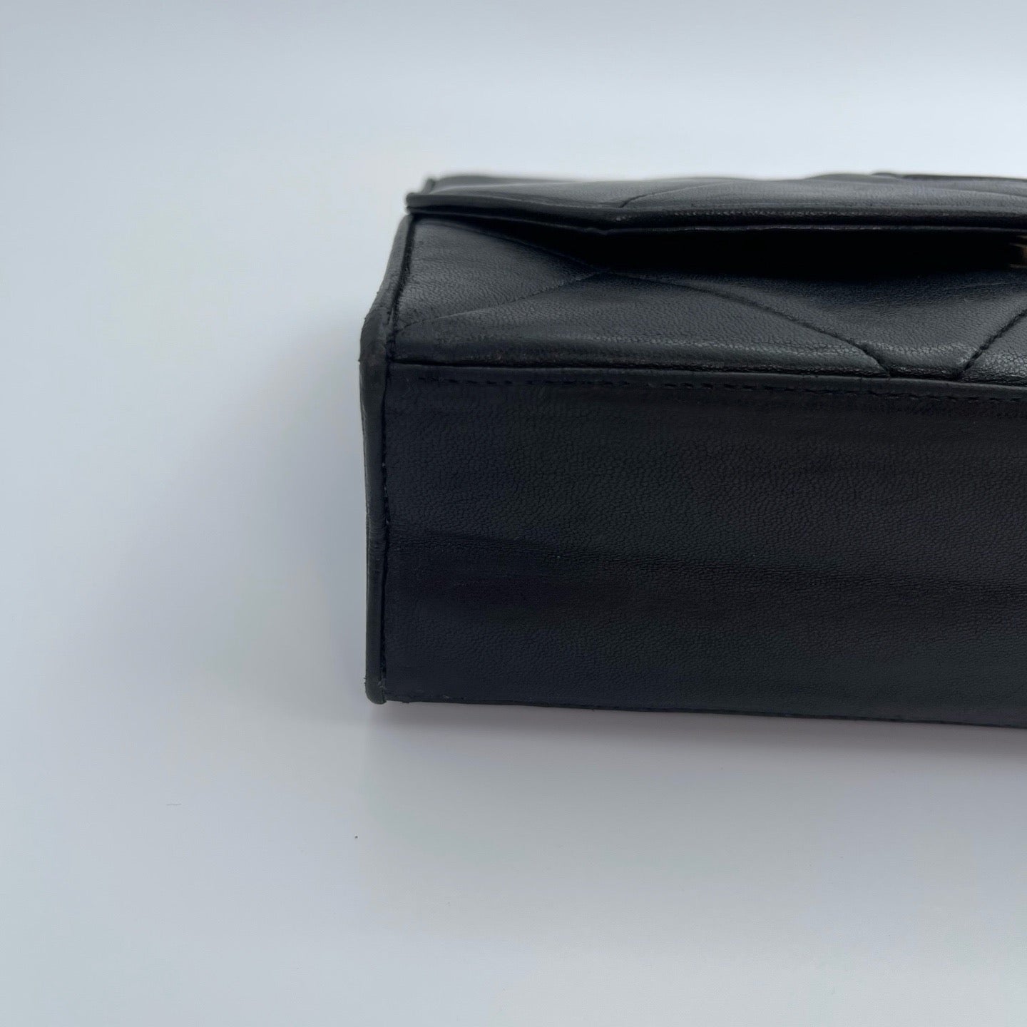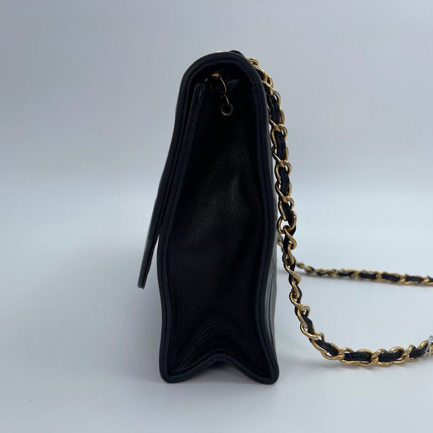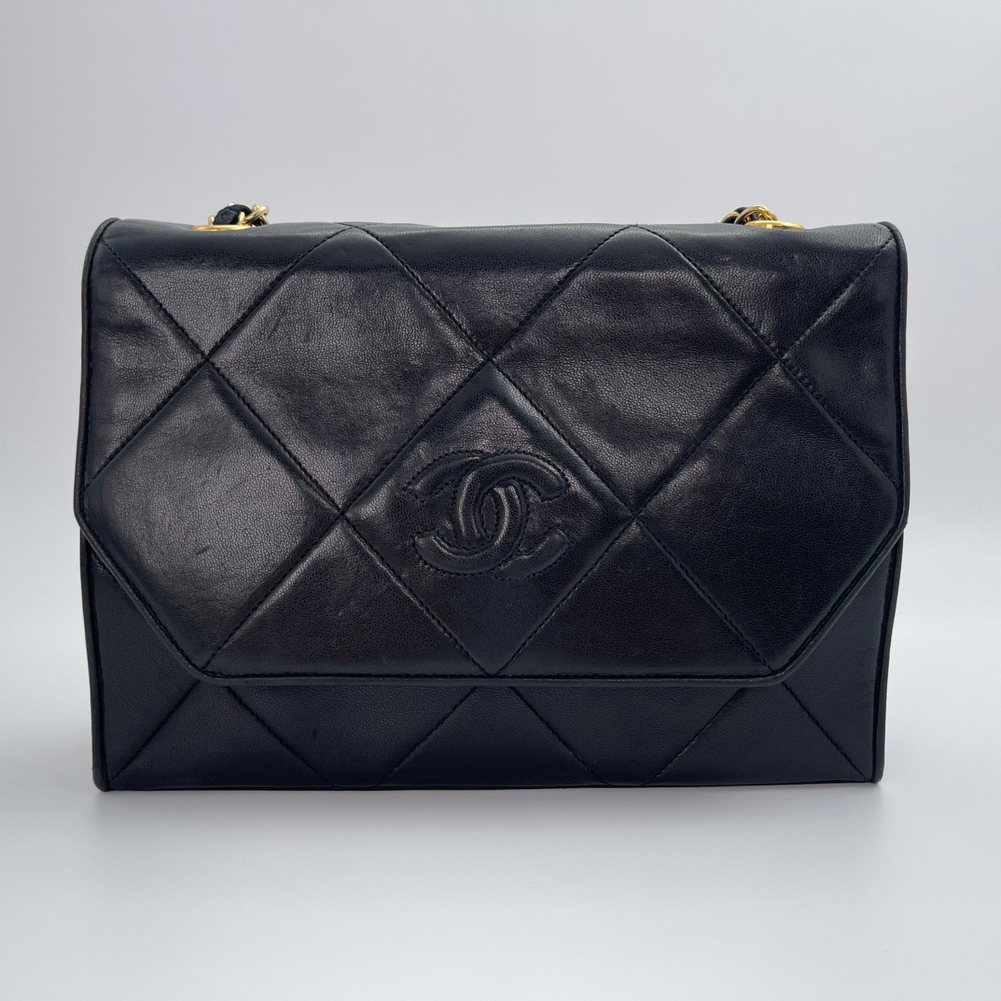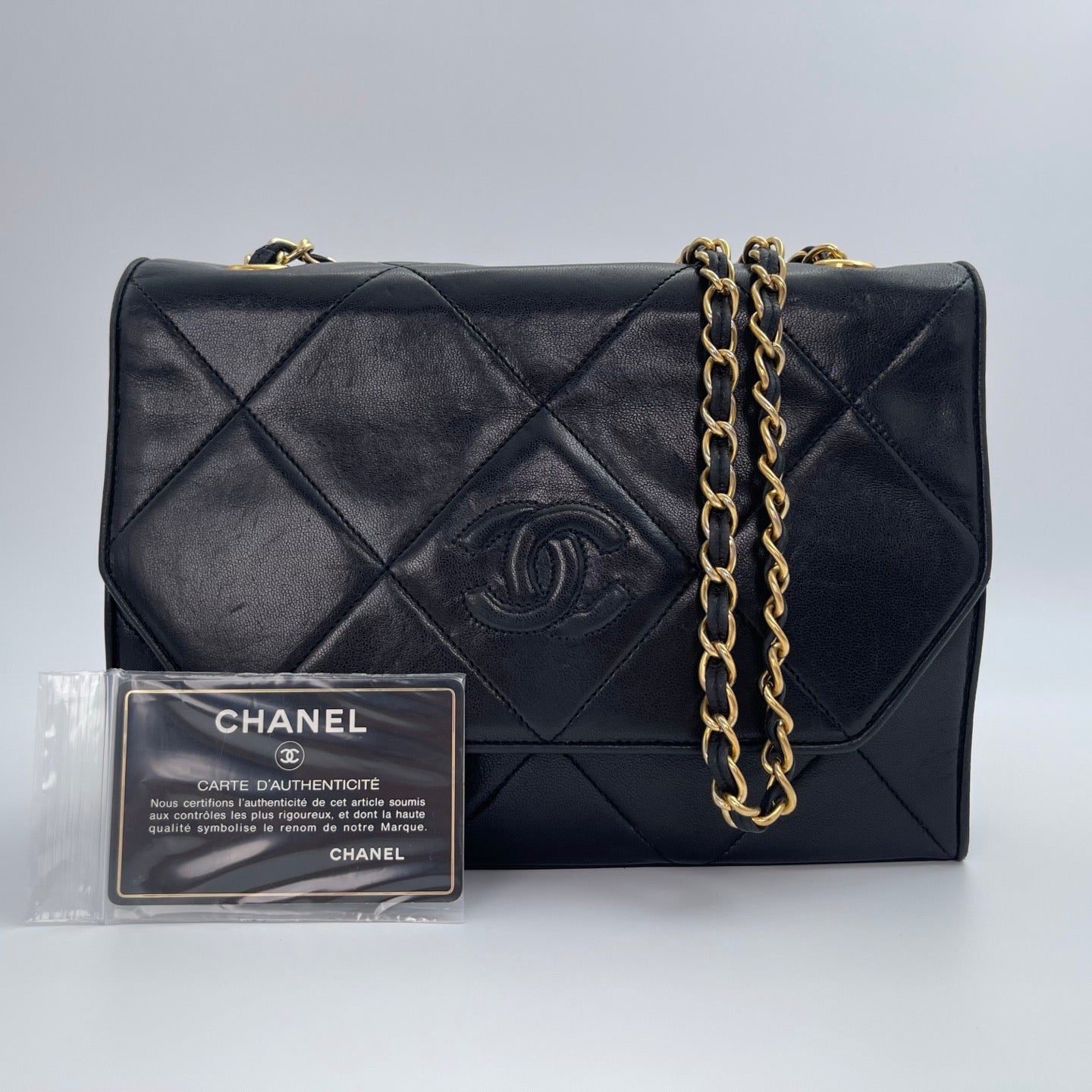 Exceptionnel Chanel Camera Bag vintage en cuir d’agneau noir matelassé, orné du logo Chanel embossé sur le rabat et d’une chaîne dorée entrelacée de cuir.