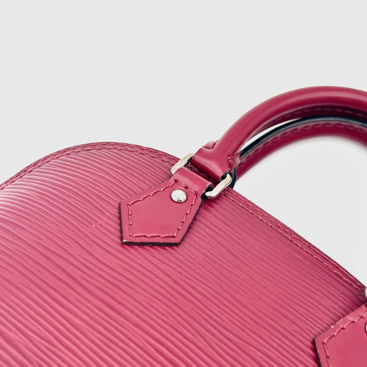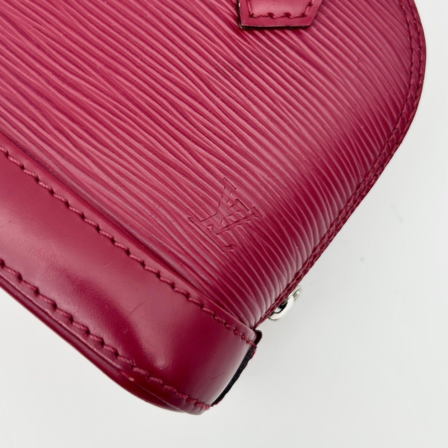 Réalisé en cuir Épi framboise (rose fuchsia), ce modèle compact reprend les codes du sac Alma classique : lignes arrondies, structure rigide et finitions métalliques argentées.