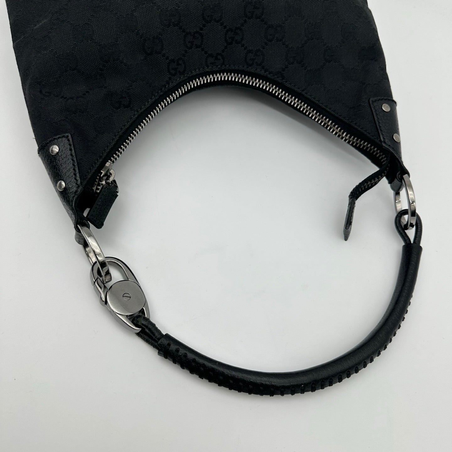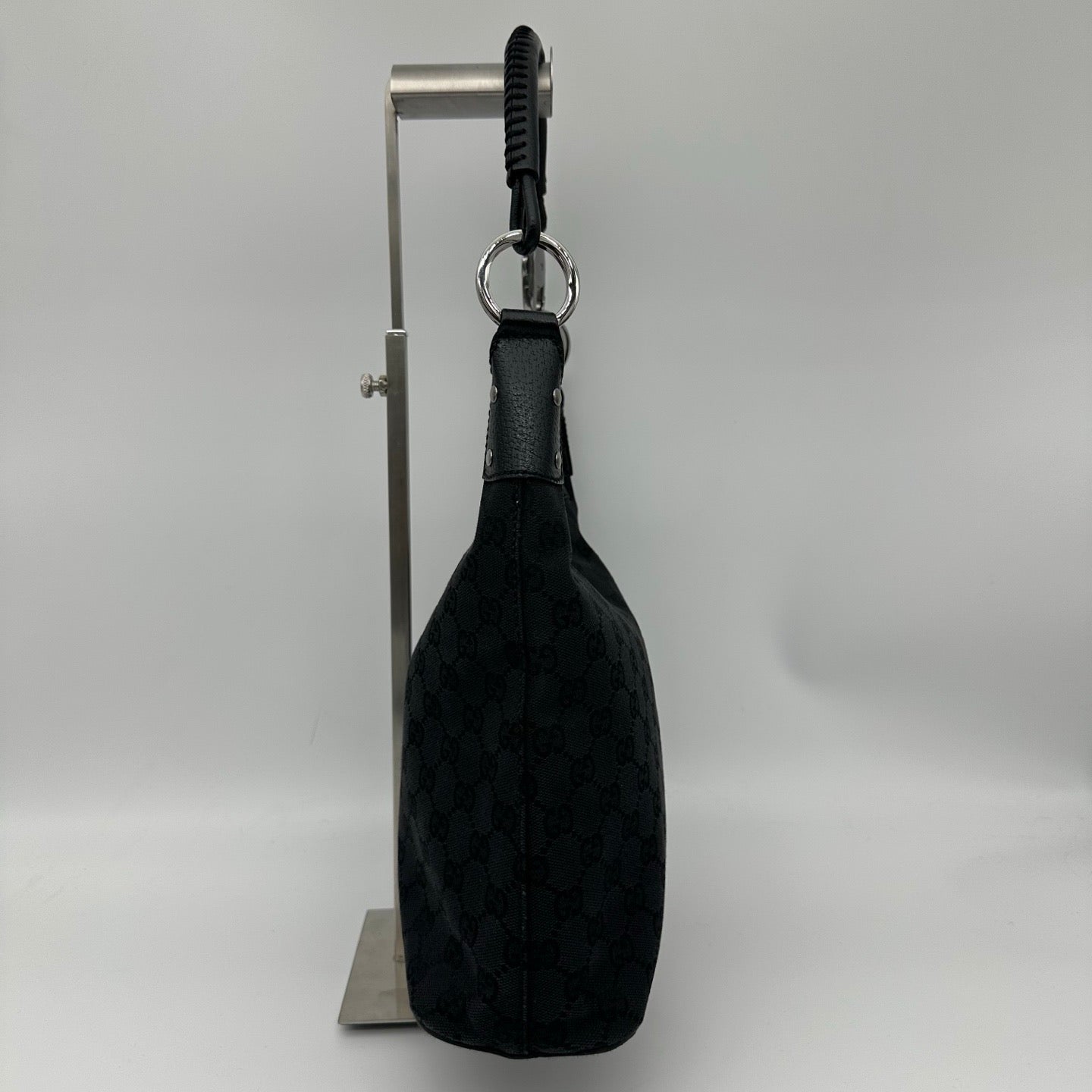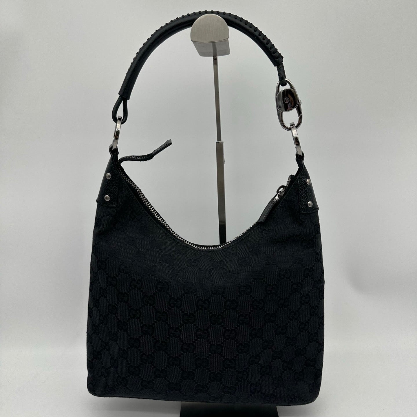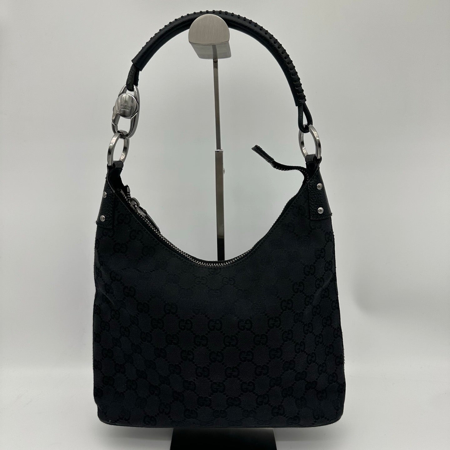 Superbe sac hobo Gucci vintage en toile GG noire et argentée, sublimé de détails en cuir lisse et de métalleries argentées brillantes. Son design en forme de corne (ou “cornet”) lui confère une silhouette fluide et moderne, typique du style Gucci du début des années 2000.