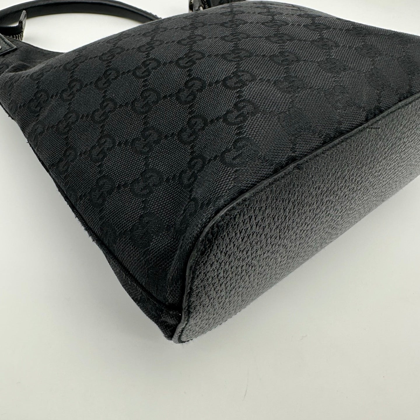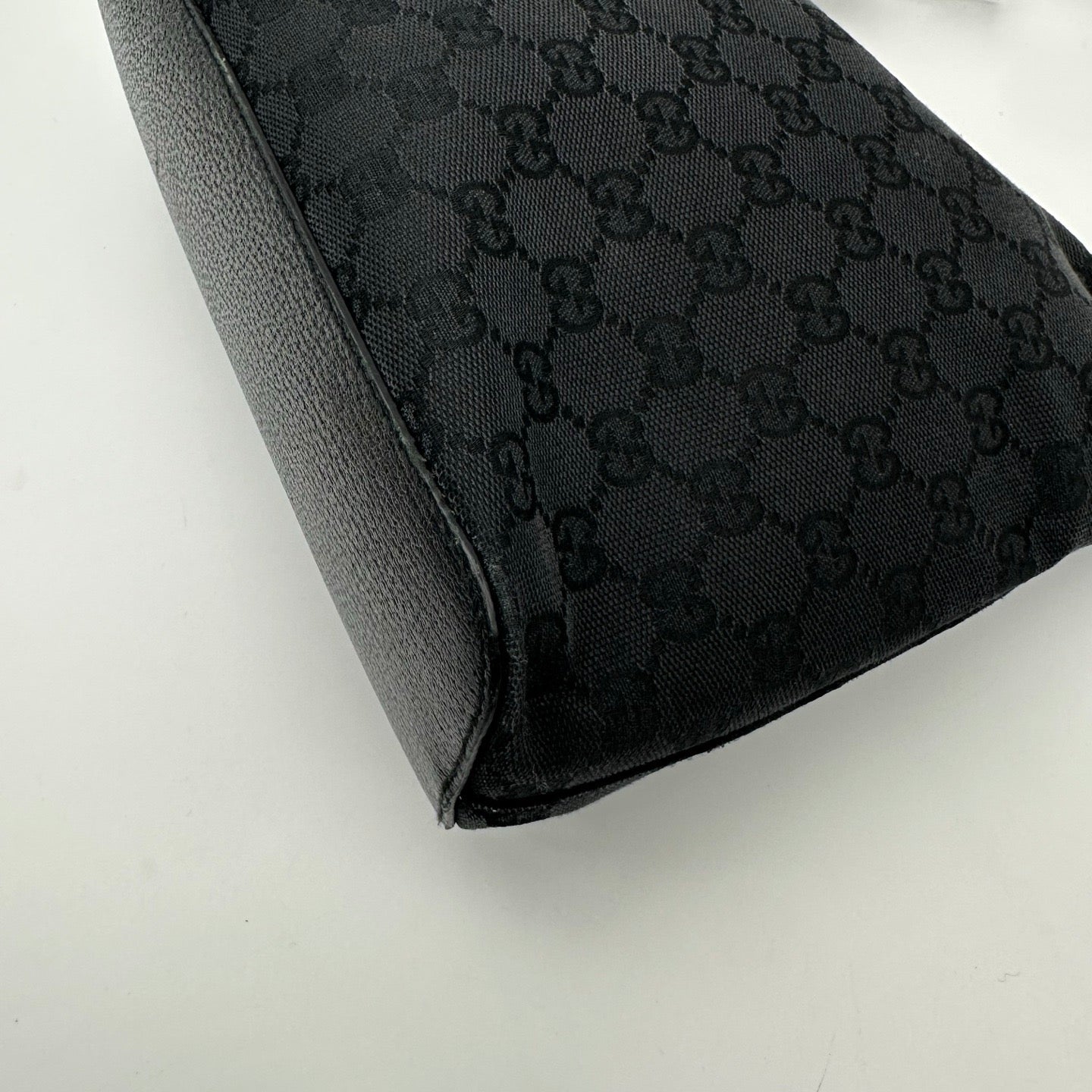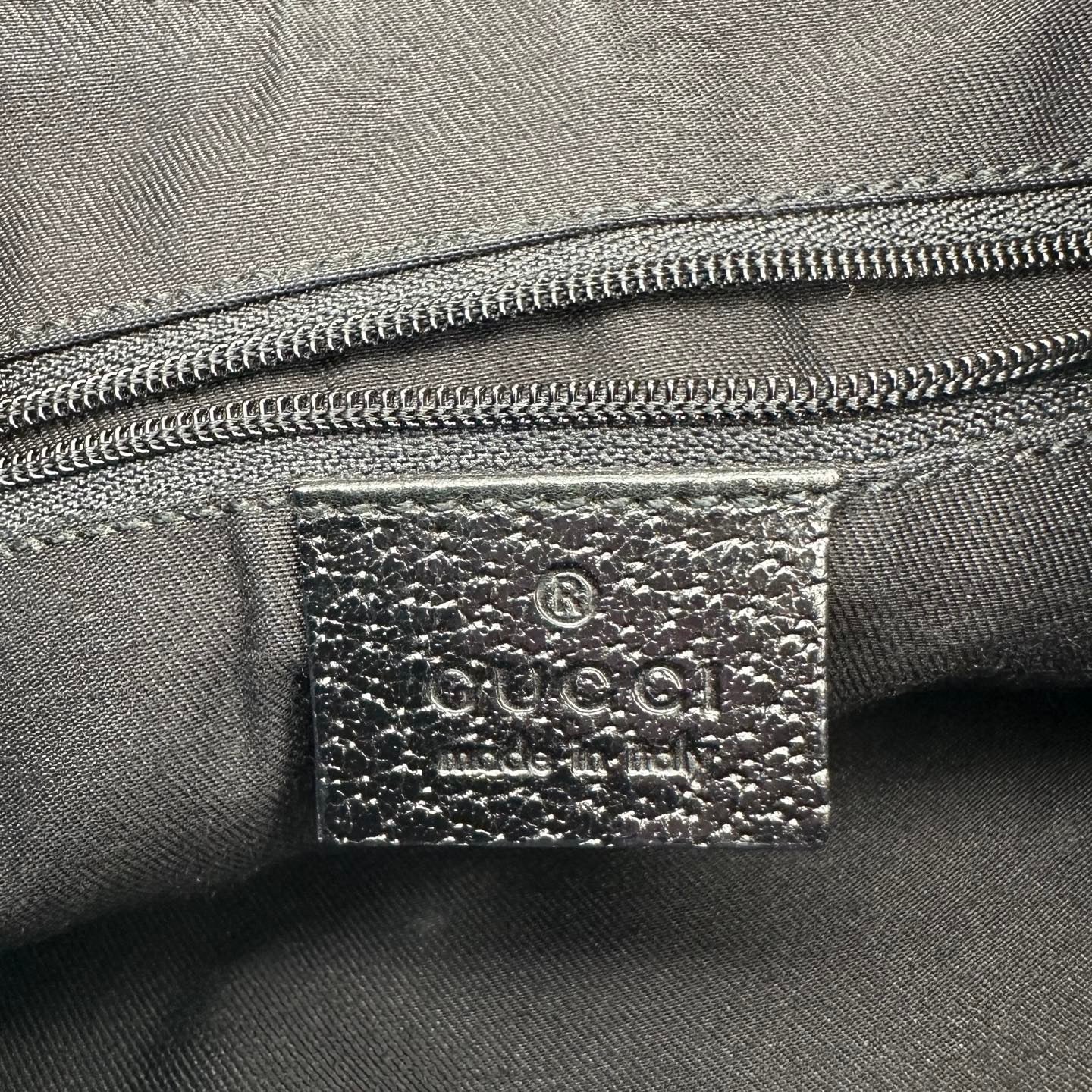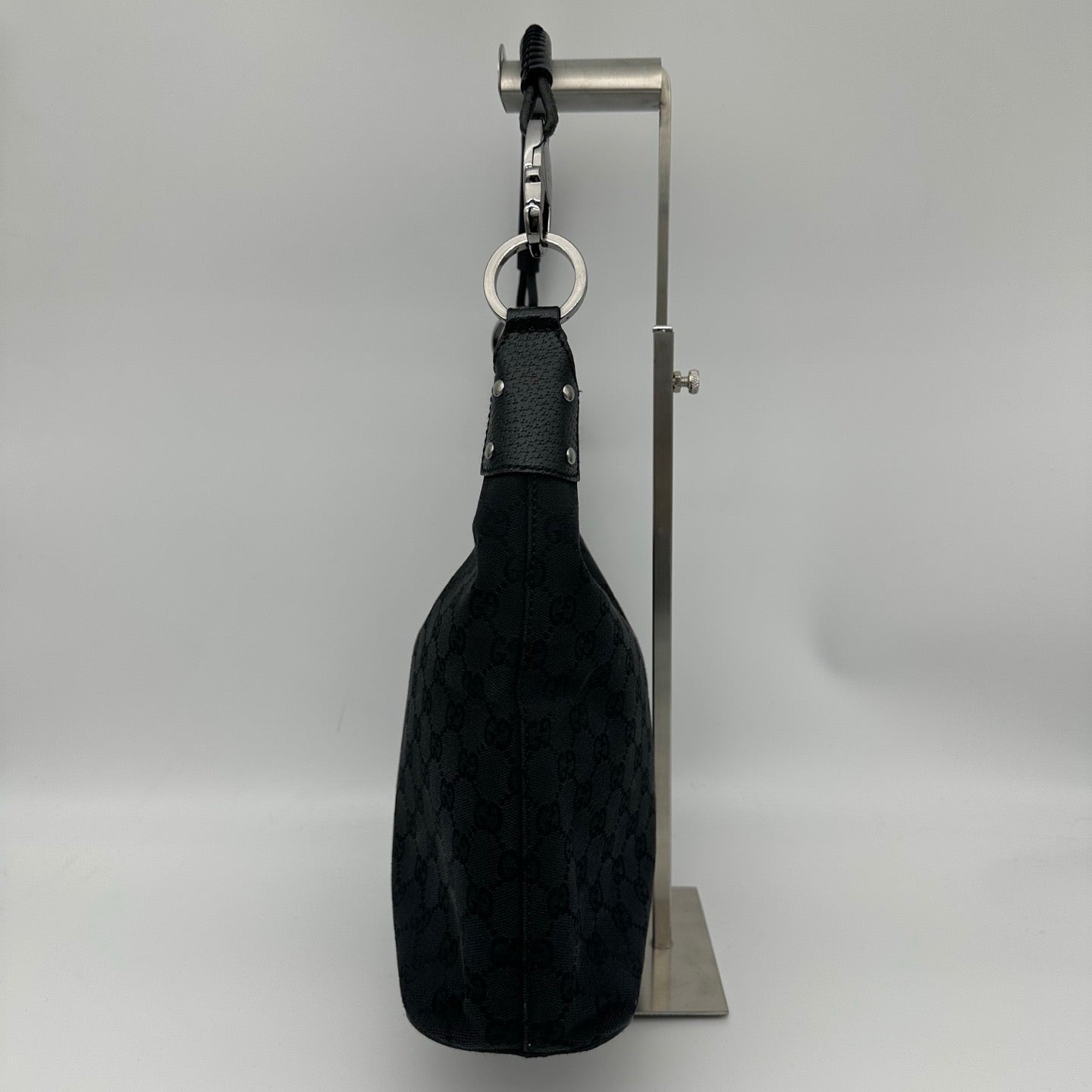 Superbe sac hobo Gucci vintage en toile GG noire et argentée, sublimé de détails en cuir lisse et de métalleries argentées brillantes. Son design en forme de corne (ou “cornet”) lui confère une silhouette fluide et moderne, typique du style Gucci du début des années 2000.