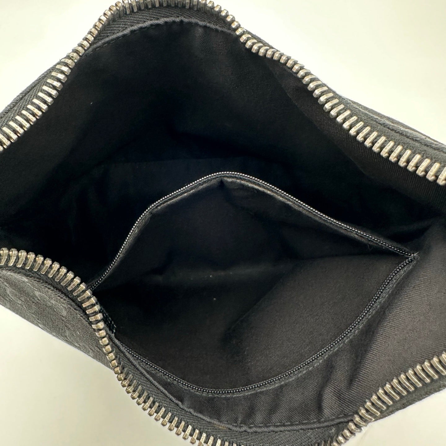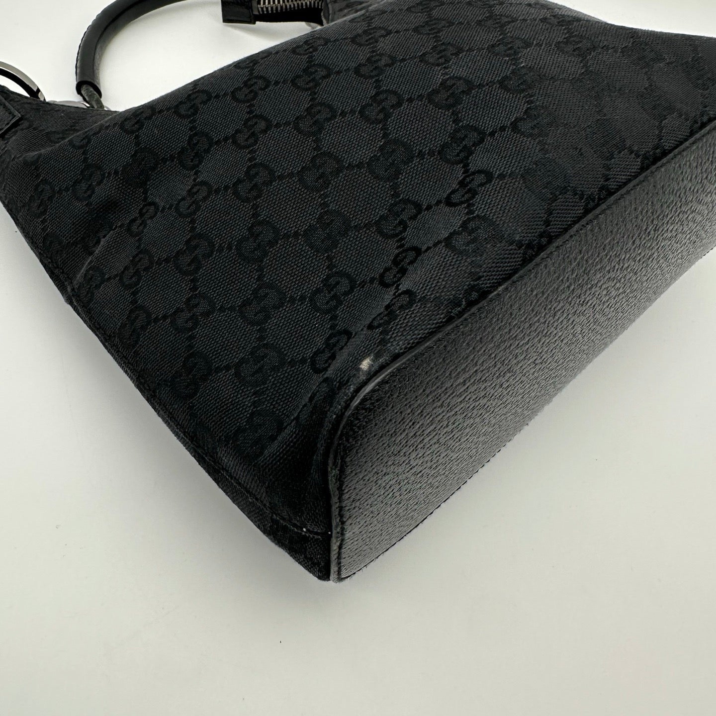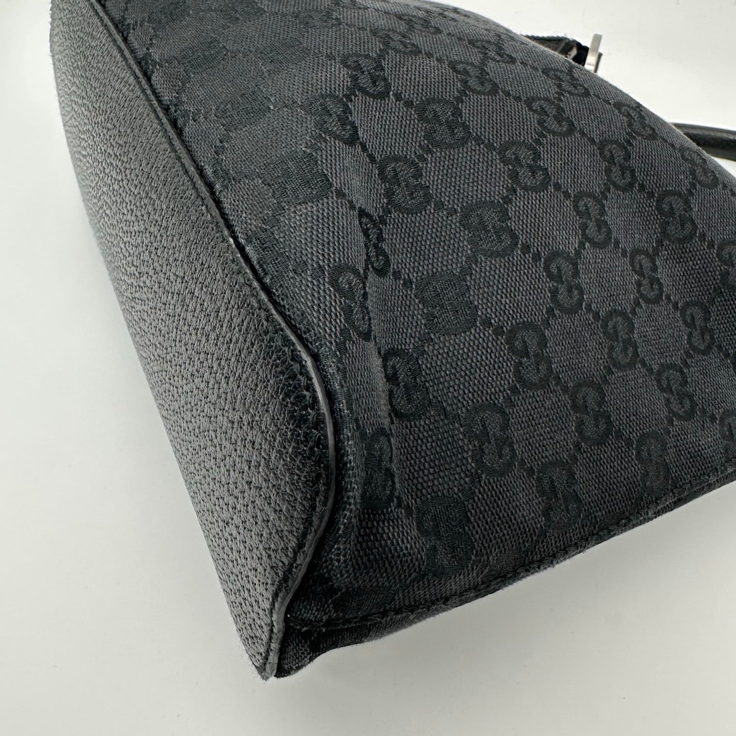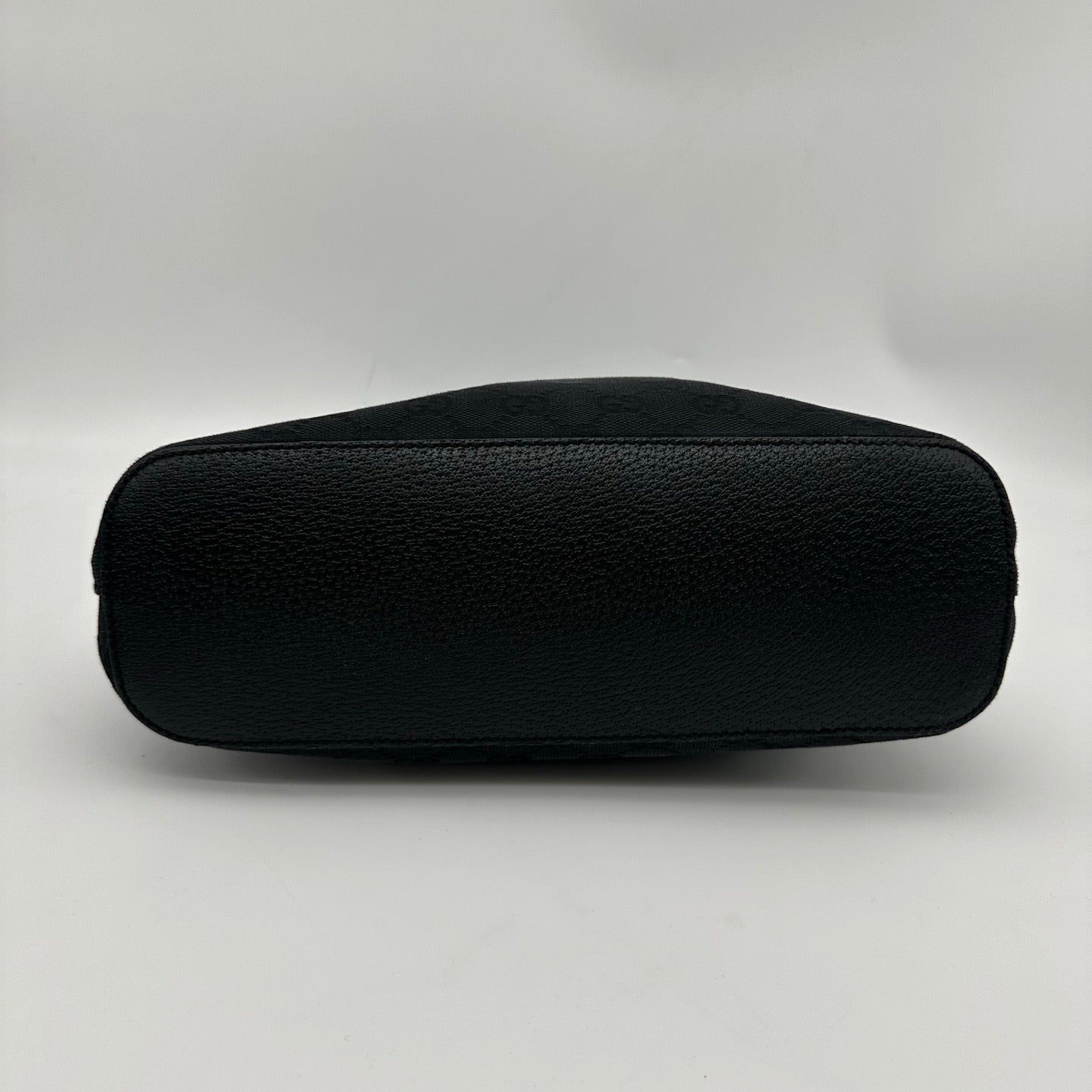 Superbe sac hobo Gucci vintage en toile GG noire et argentée, sublimé de détails en cuir lisse et de métalleries argentées brillantes. Son design en forme de corne (ou “cornet”) lui confère une silhouette fluide et moderne, typique du style Gucci du début des années 2000.