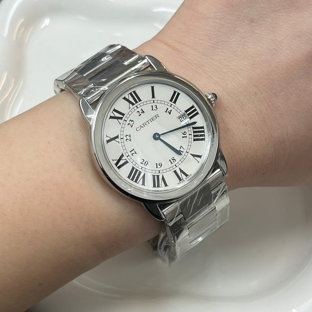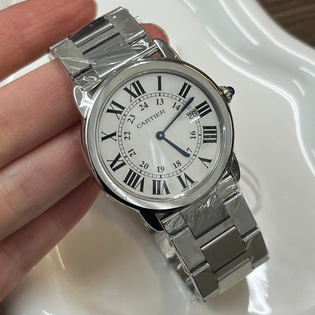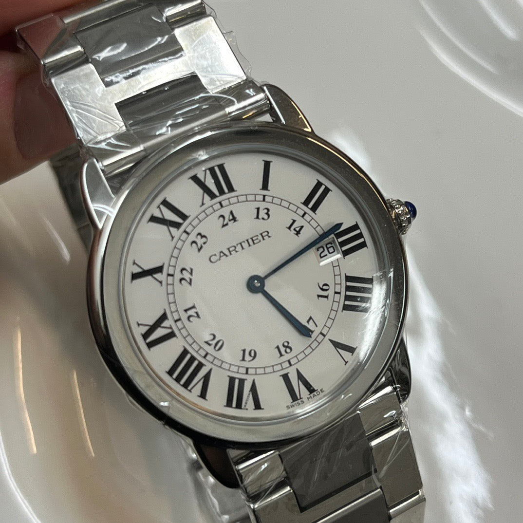 Montre Cartier Ronde en acier, élégante et intemporelle, au design signature de la Maison française. Son cadran épuré et ses chiffres romains emblématiques en font une pièce classique, parfaite pour un usage quotidien ou des occasions habillées.