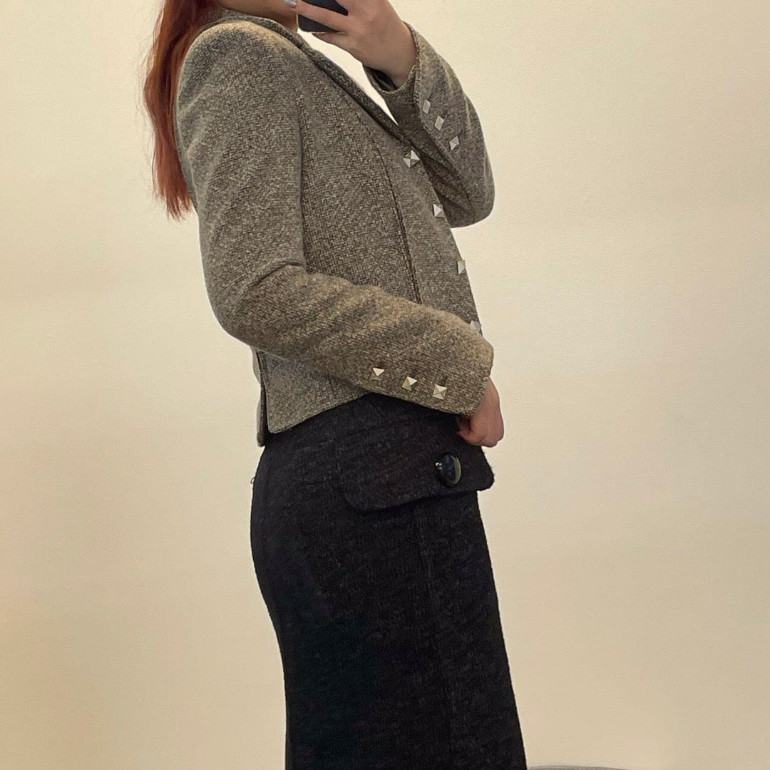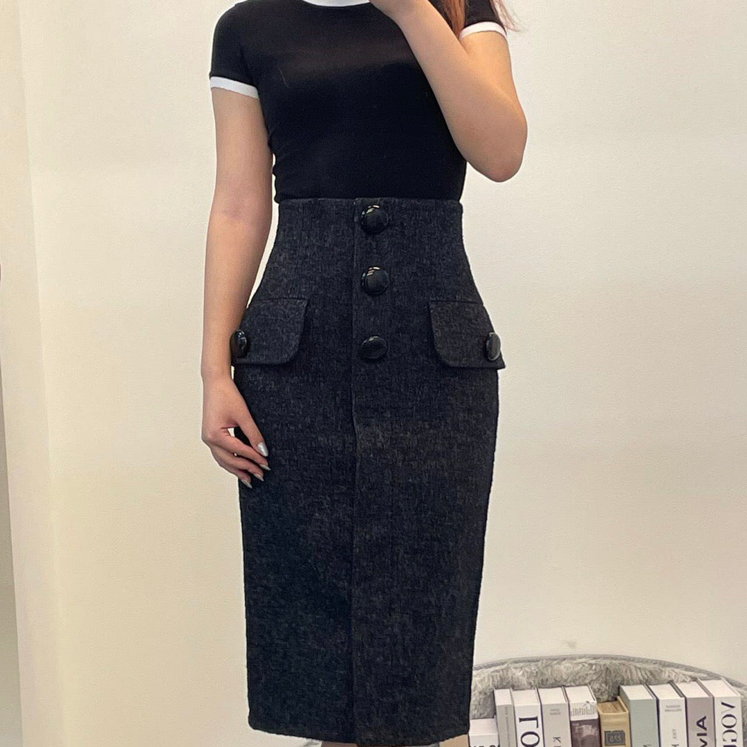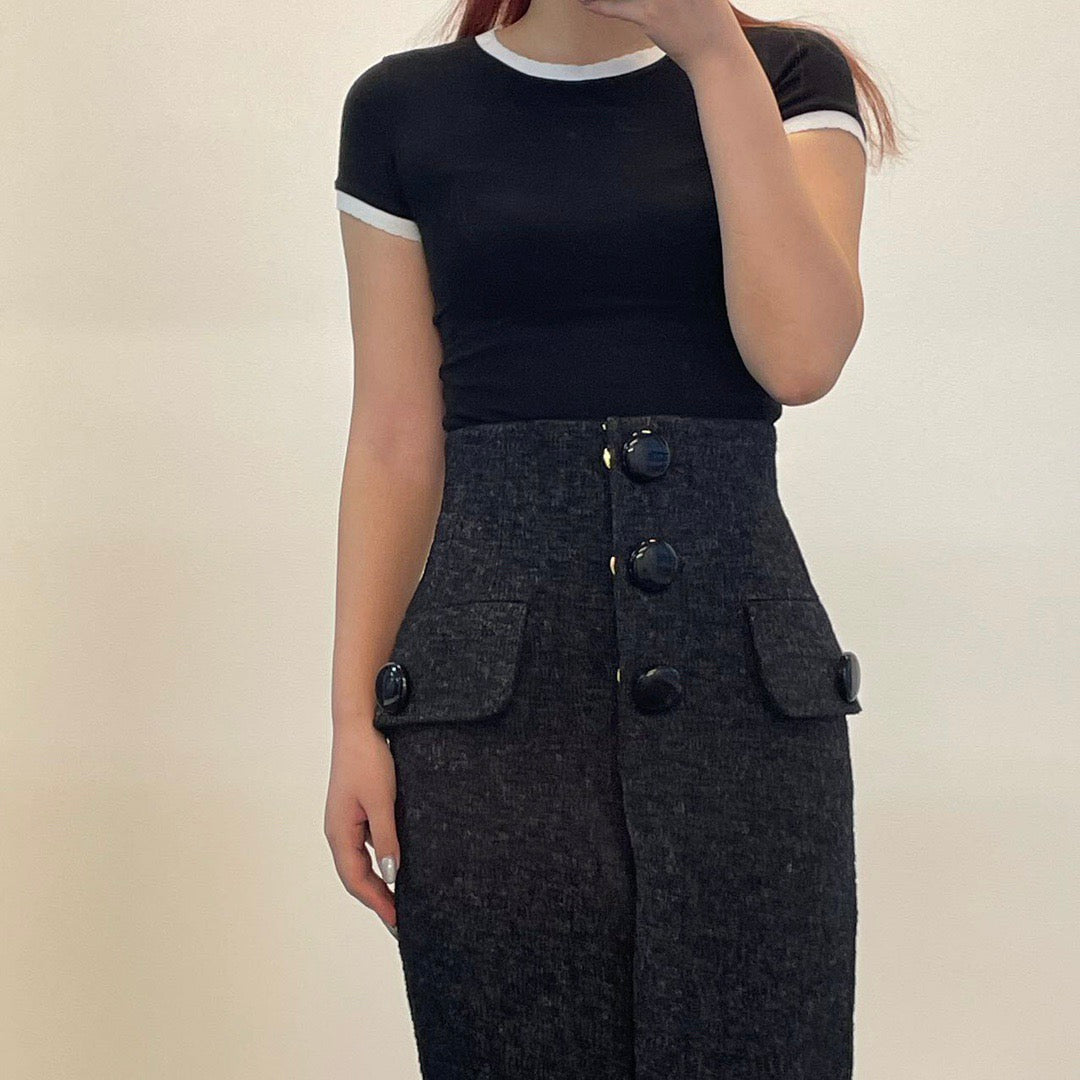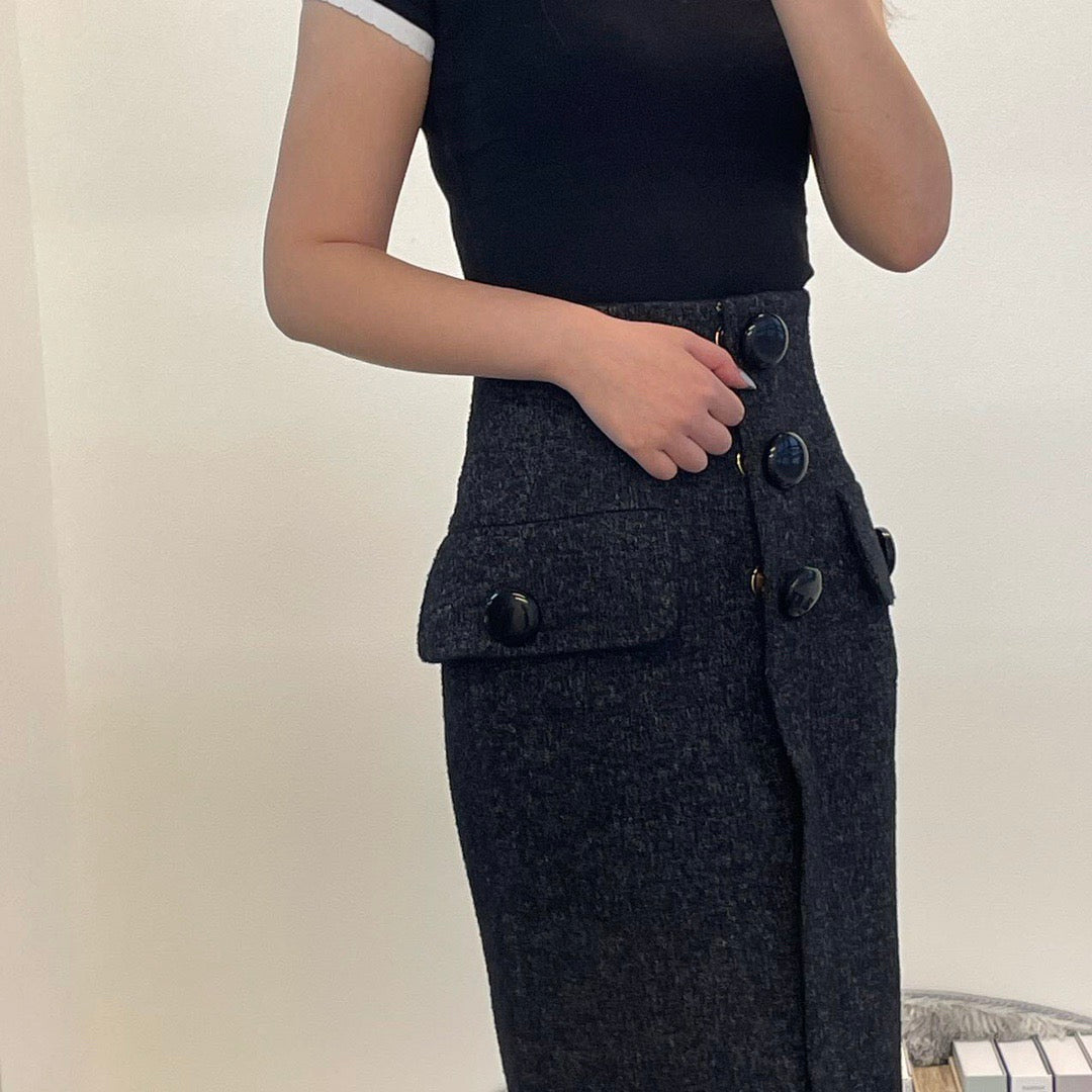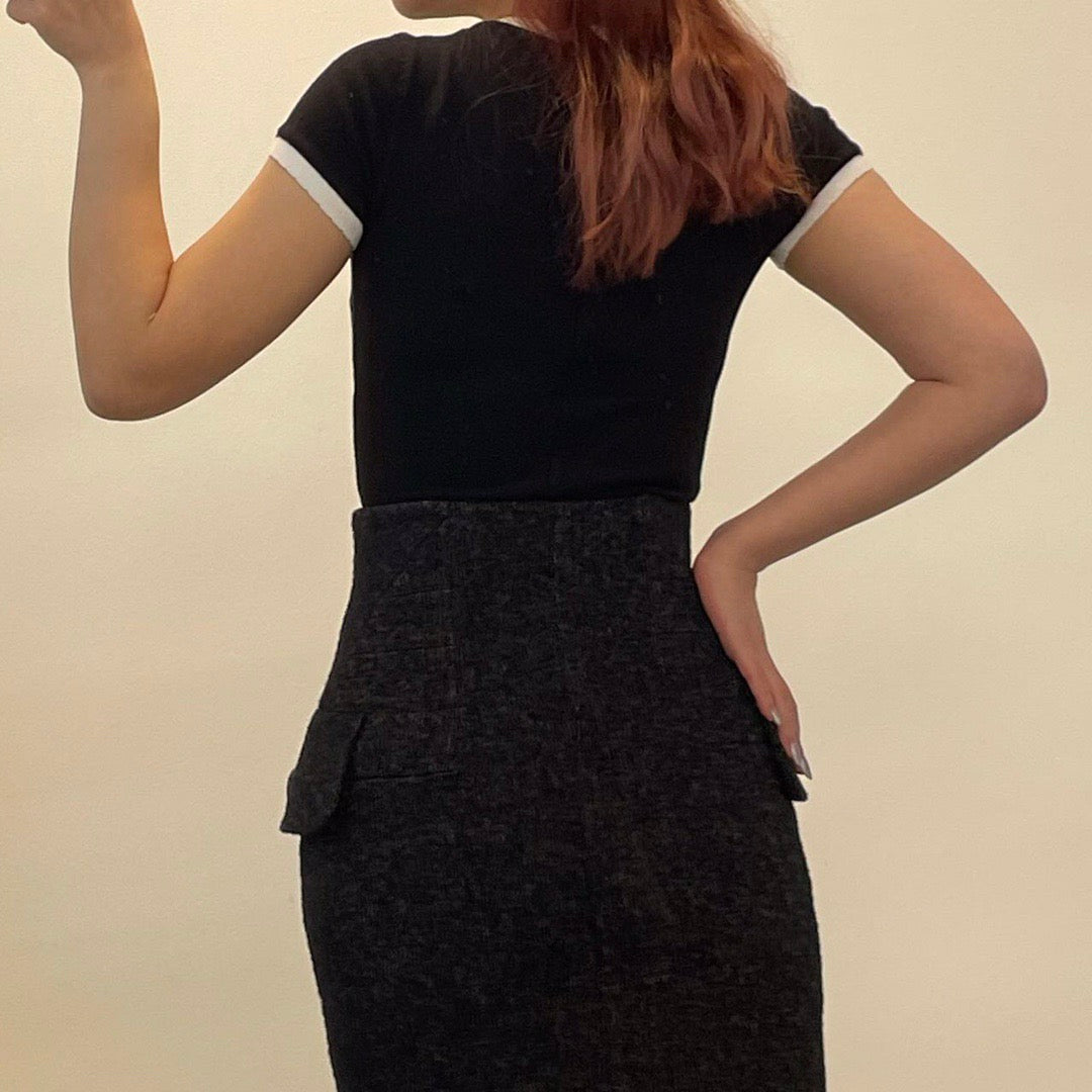 Élégante jupe taille haute Louis Vuitton en laine noire, légèrement cintrée à la taille pour une silhouette féminine et structurée.