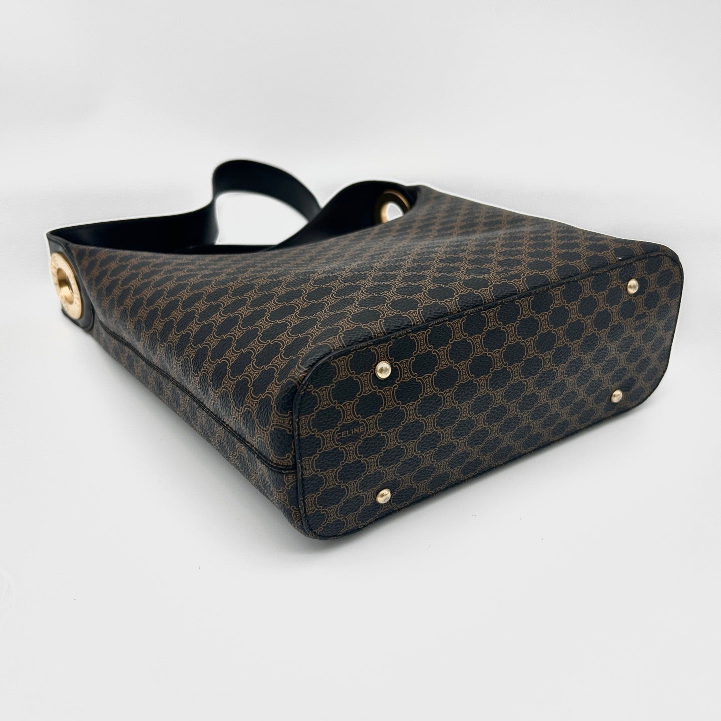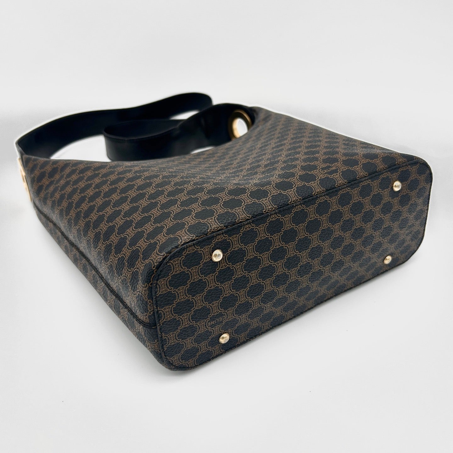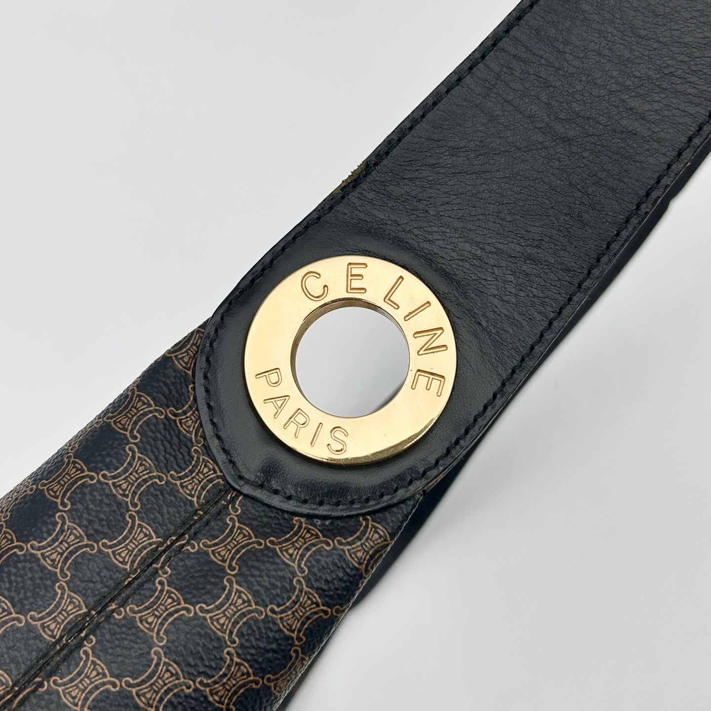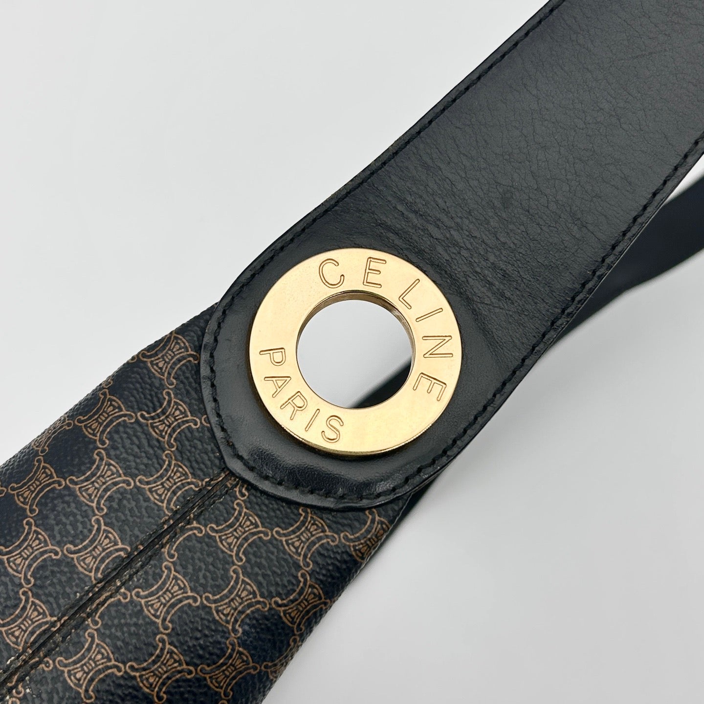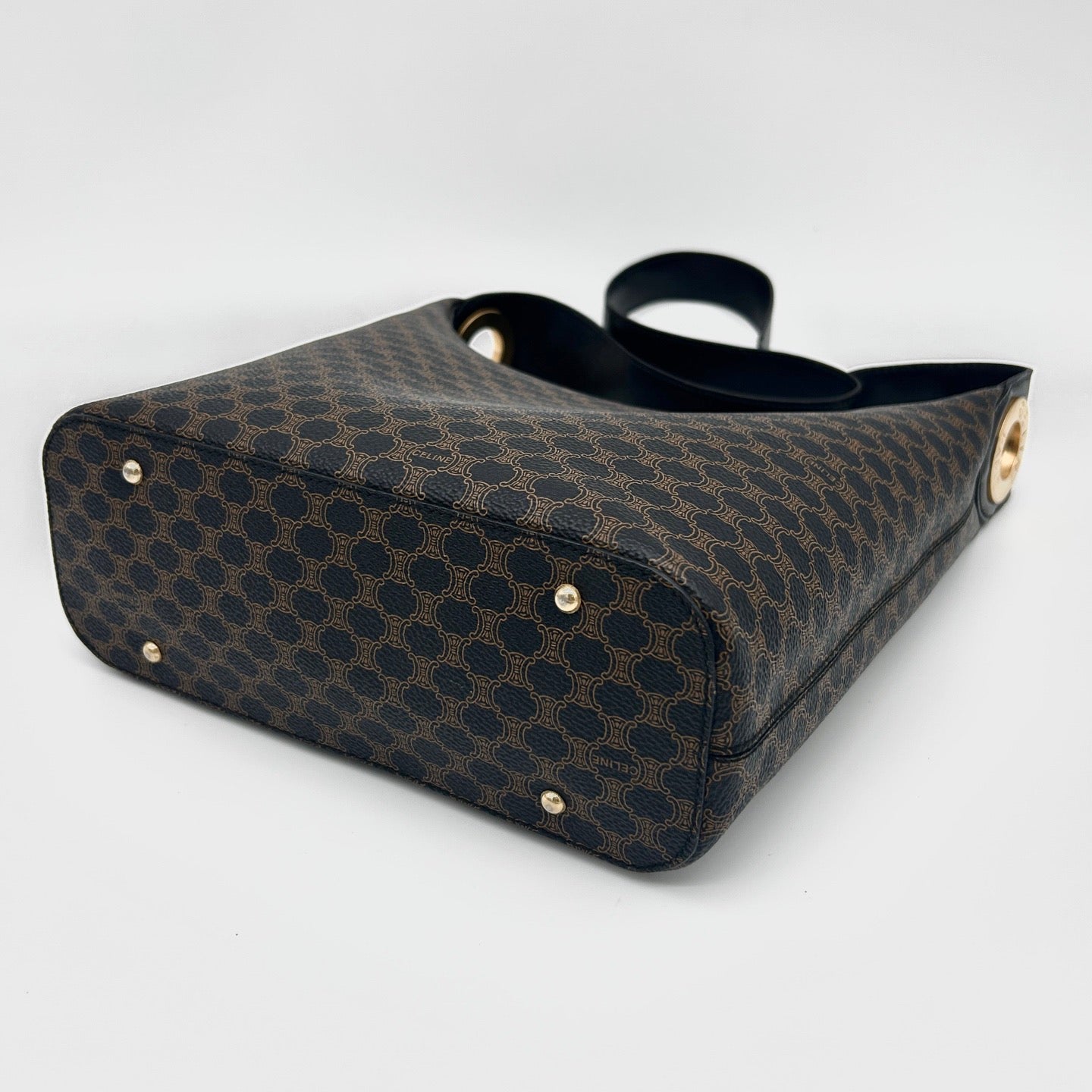 Celine – Sac cabas vintage à grand anneau doré en toile Triomphe noire et cuir