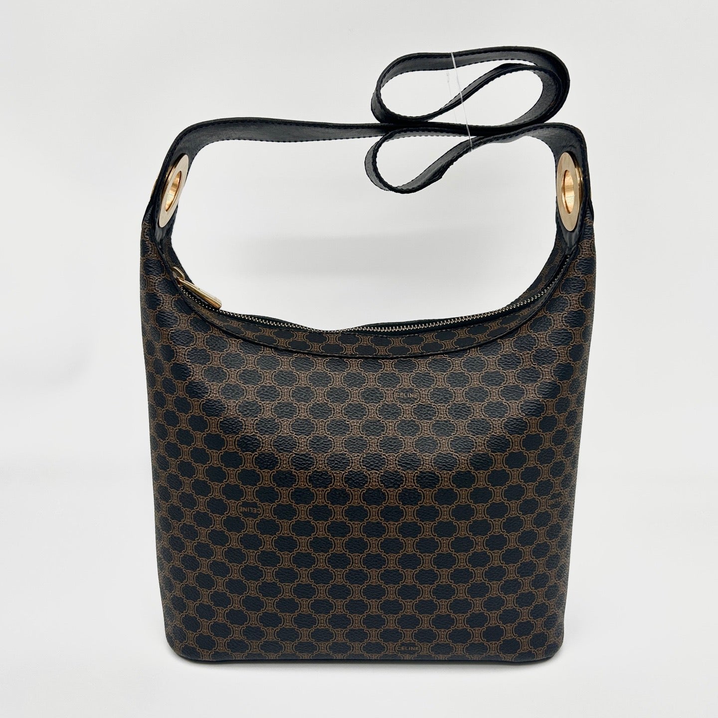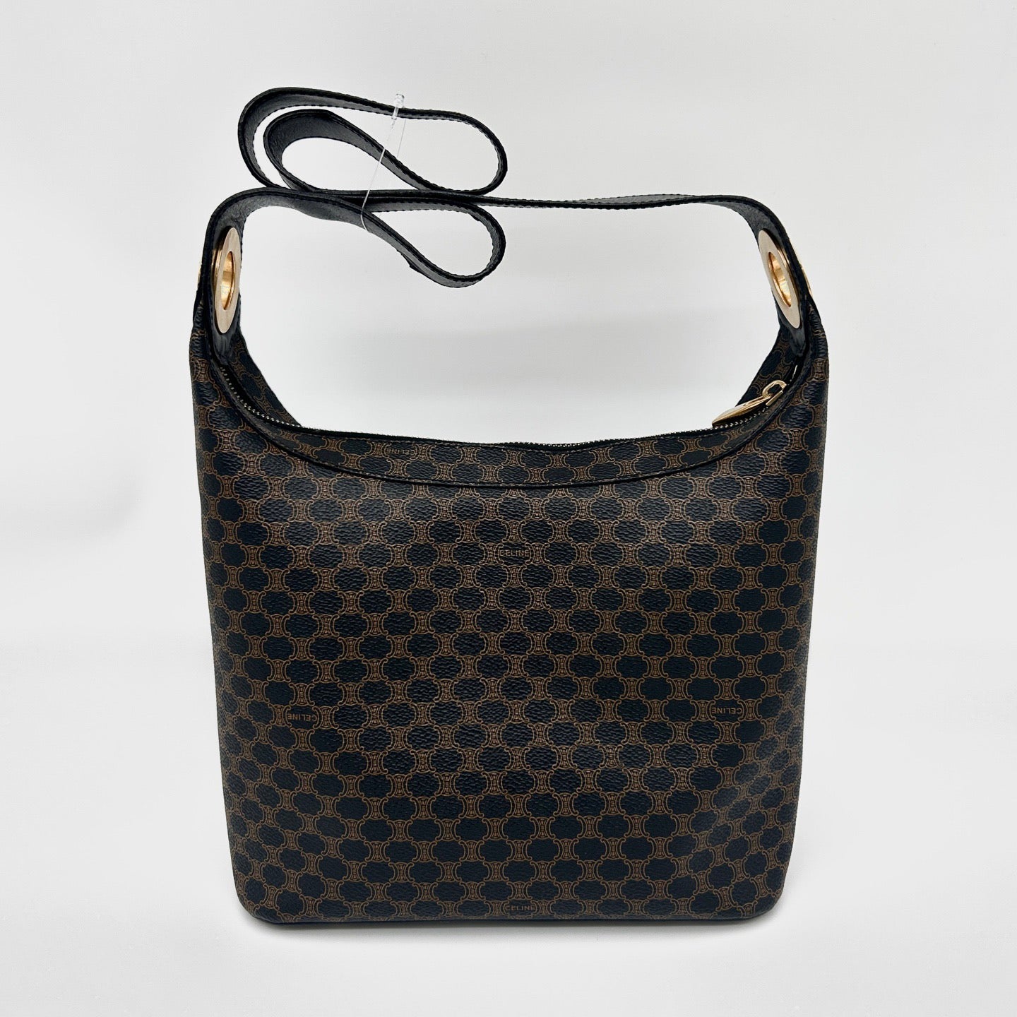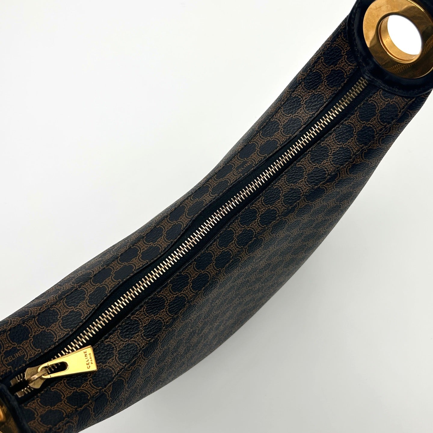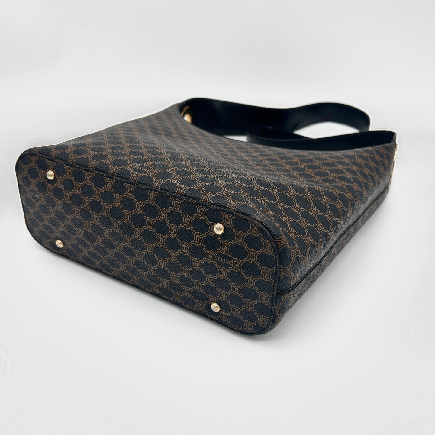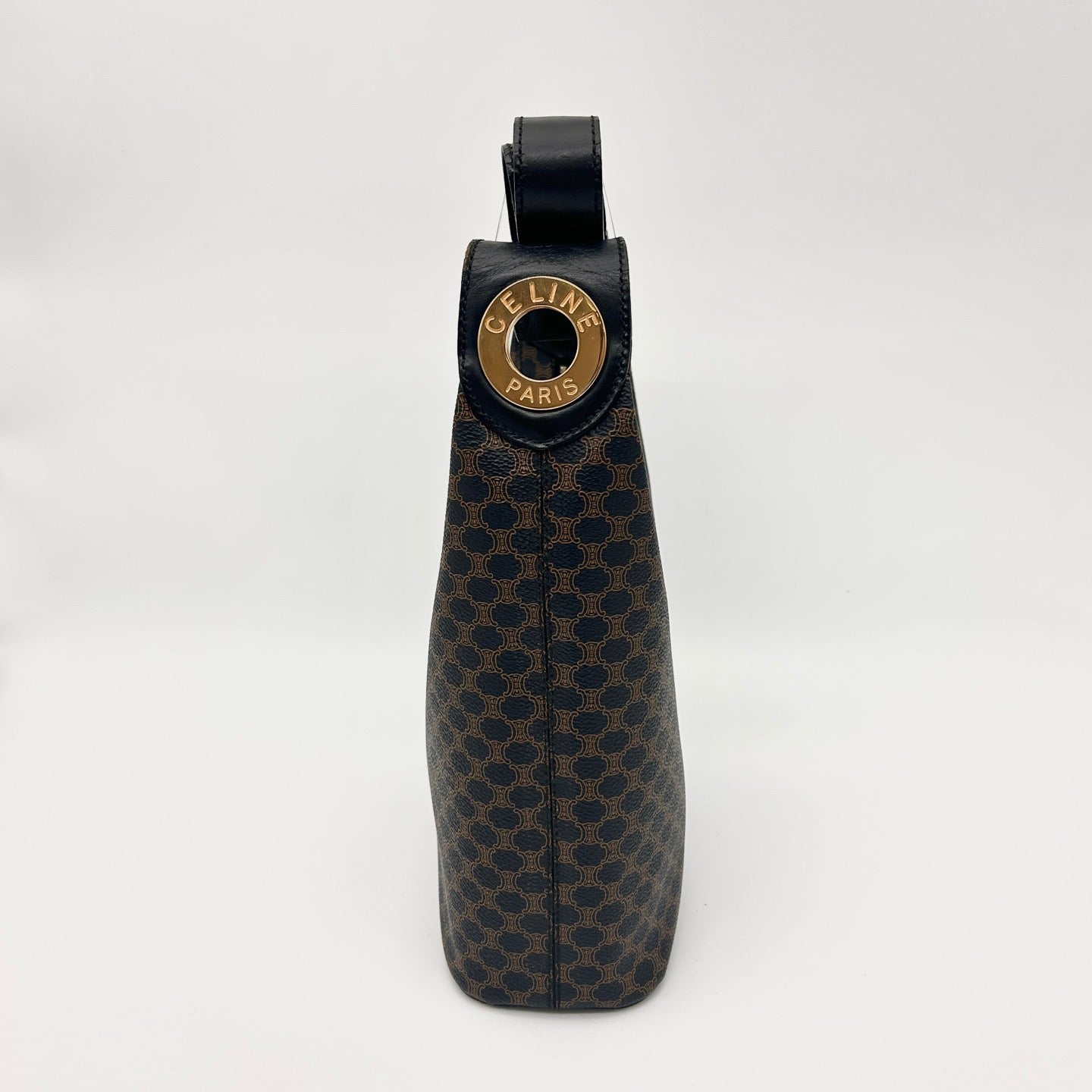 Celine – Sac cabas vintage à grand anneau doré en toile Triomphe noire et cuir
