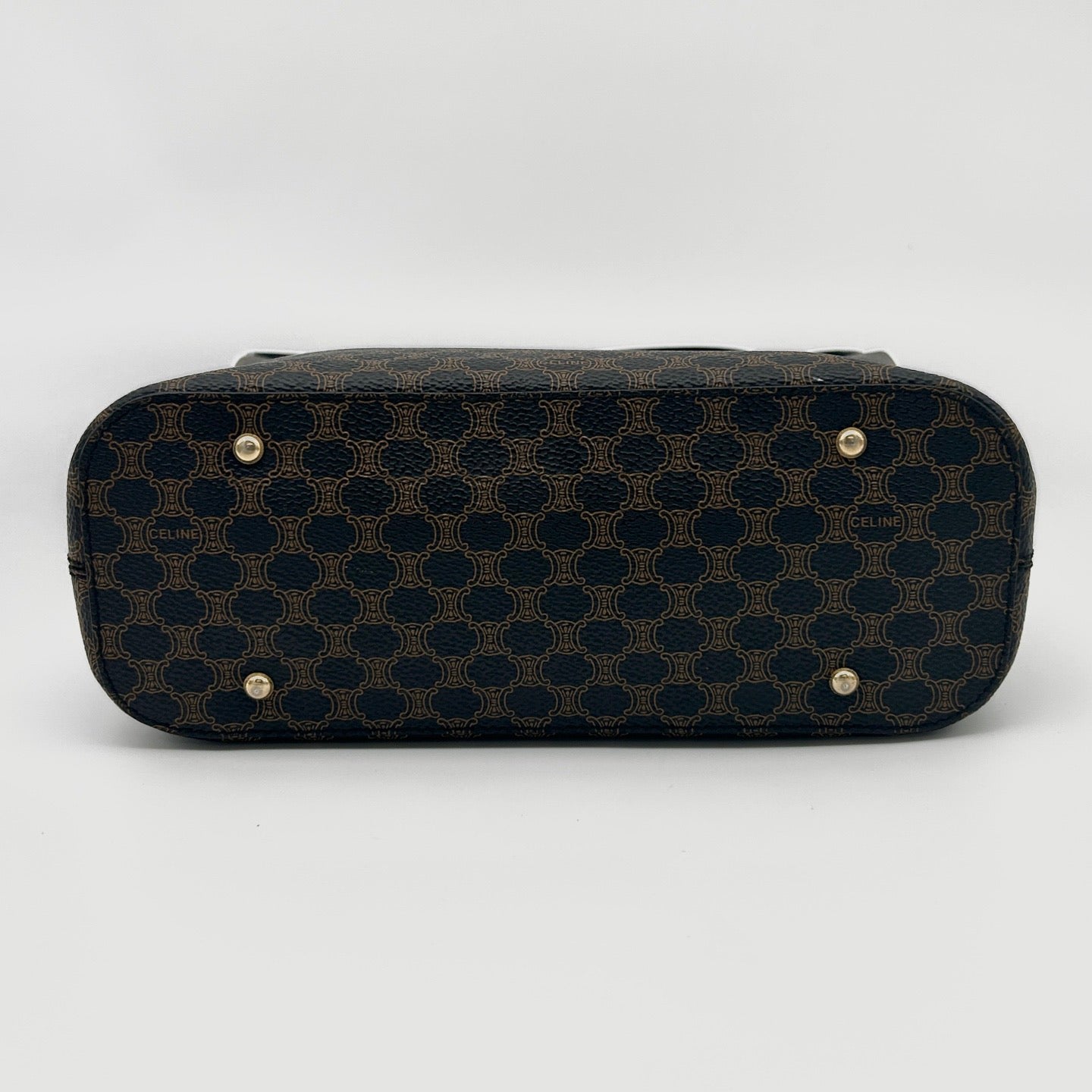 Élégant sac cabas Celine vintage, confectionné en toile Triomphe noire avec détails en cuir lisse et orné d’un grand anneau doré iconique.