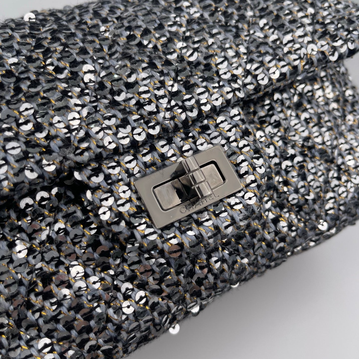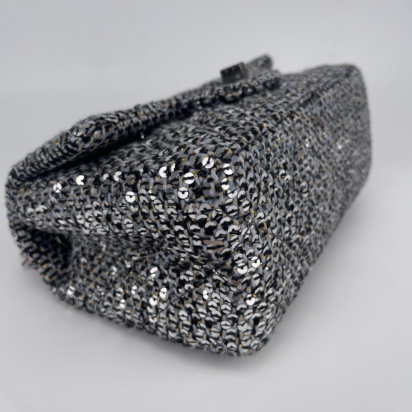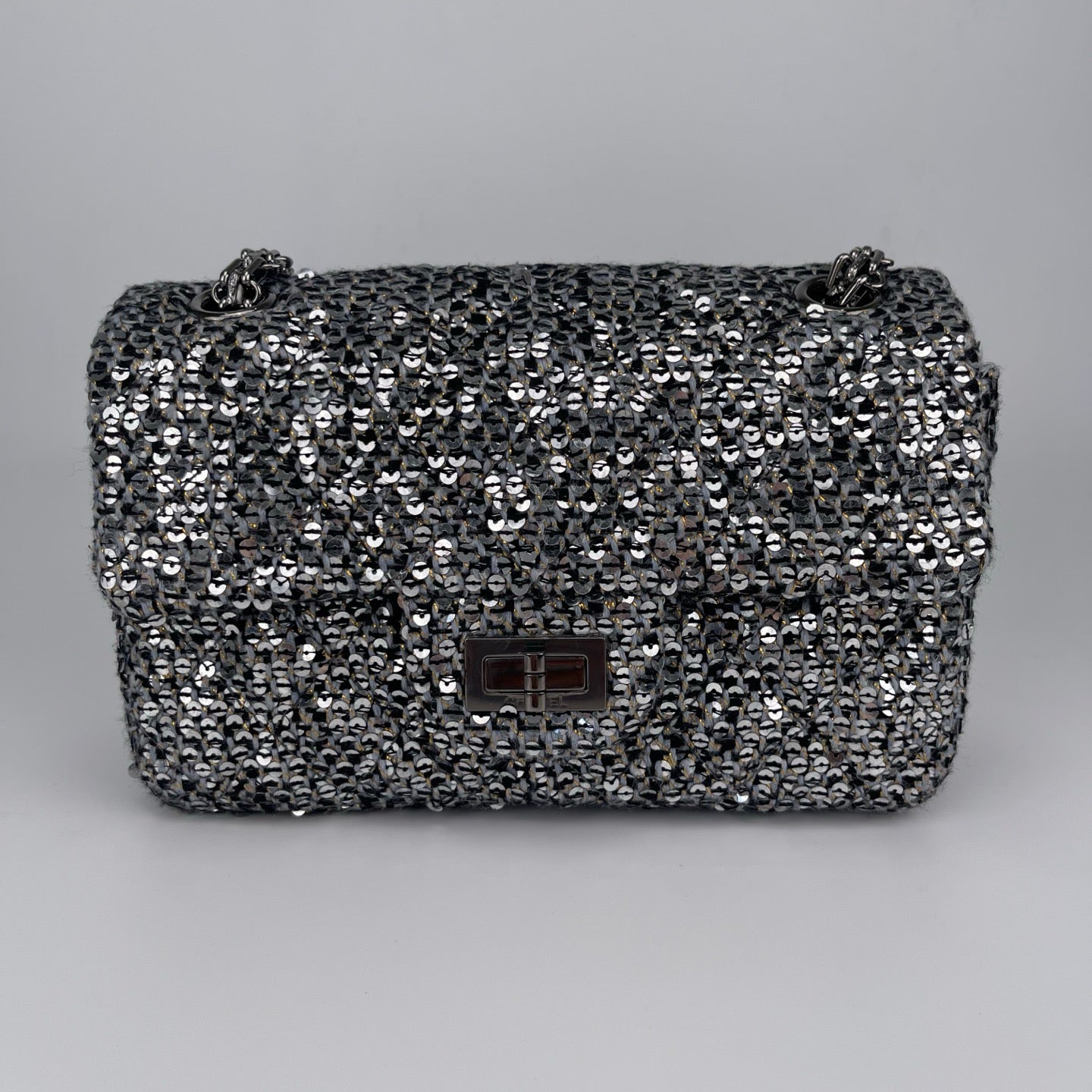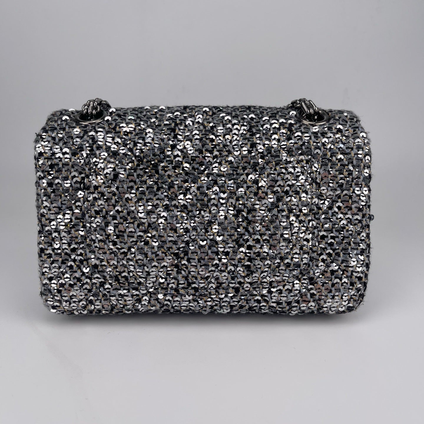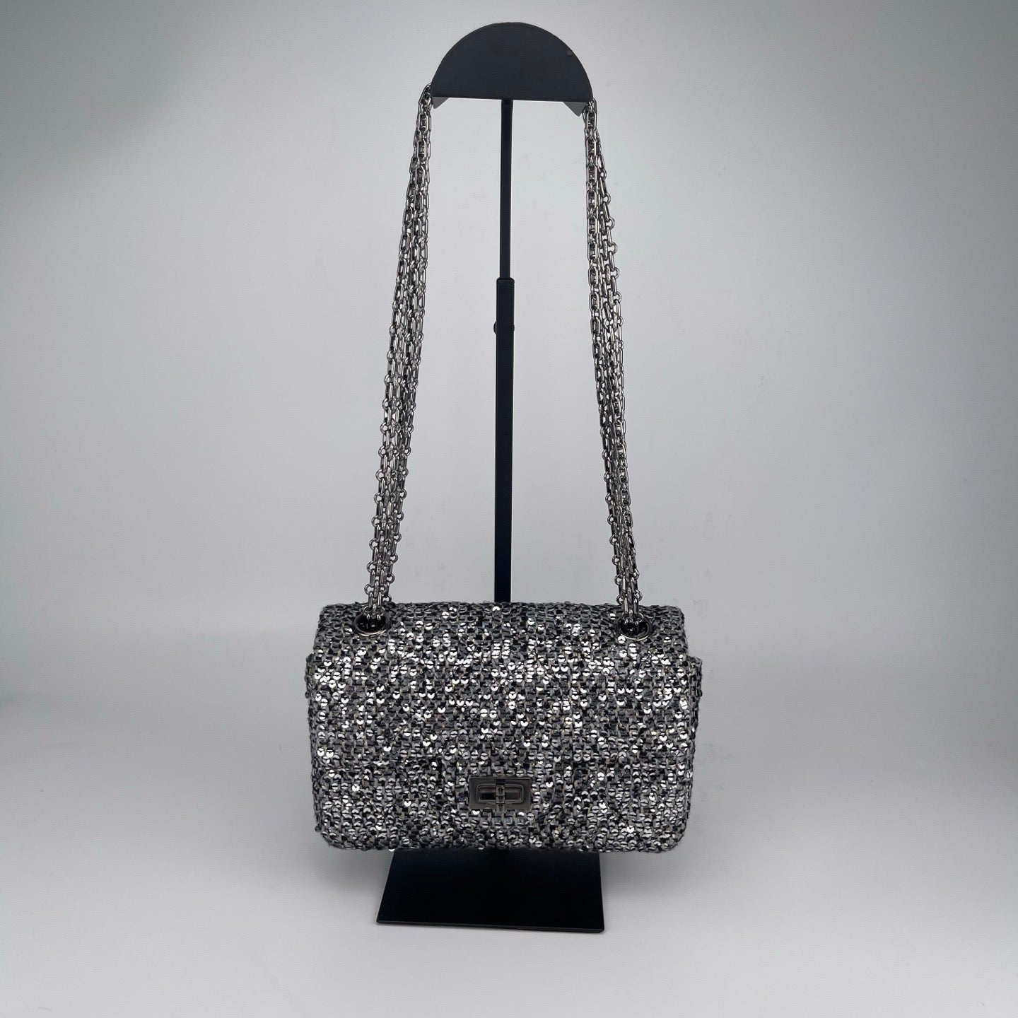 Pièce extrêmement rare de Chanel : le 2.55 Grand Mini Haute Couture, revisité en argent scintillant, perles métalliques et broderies luxueuses.