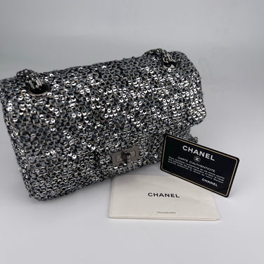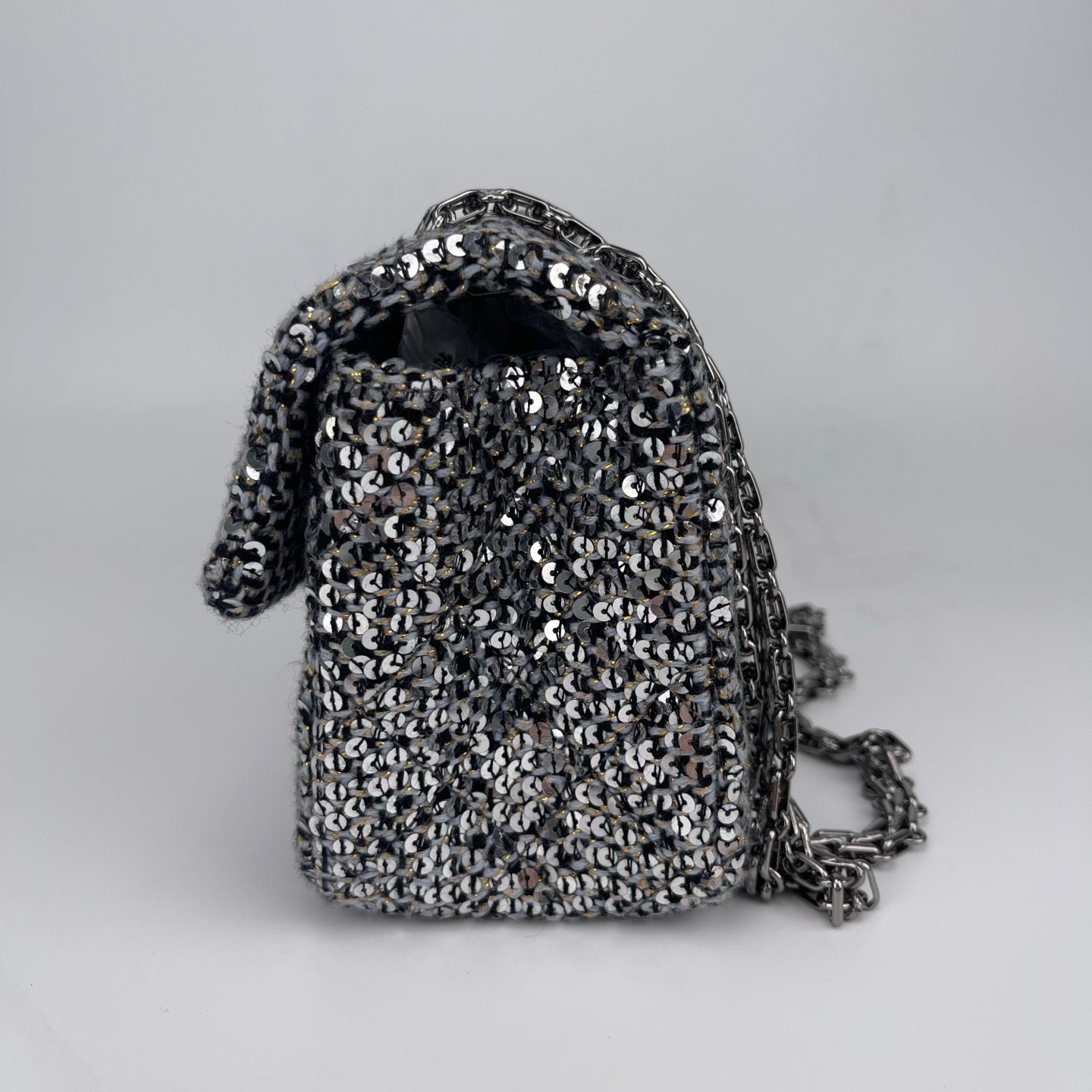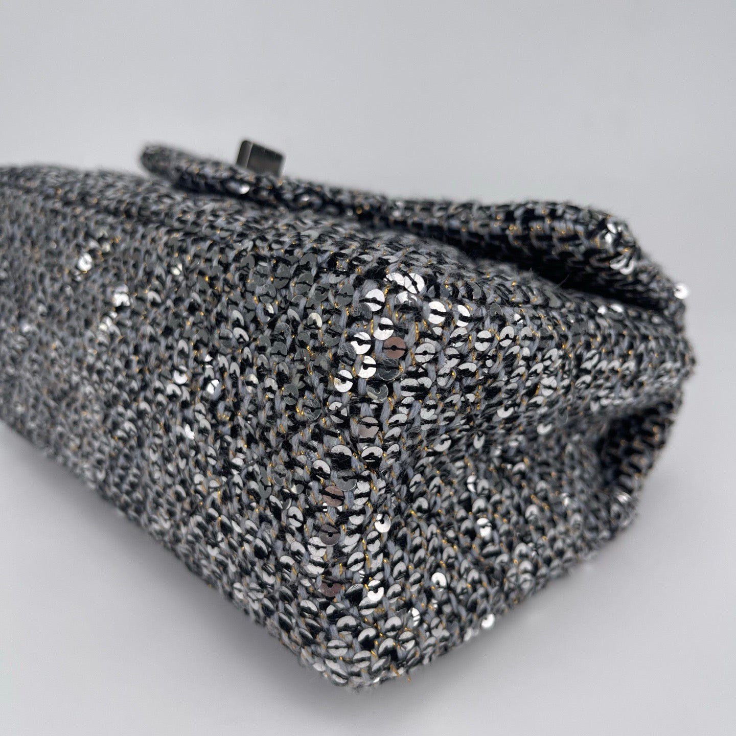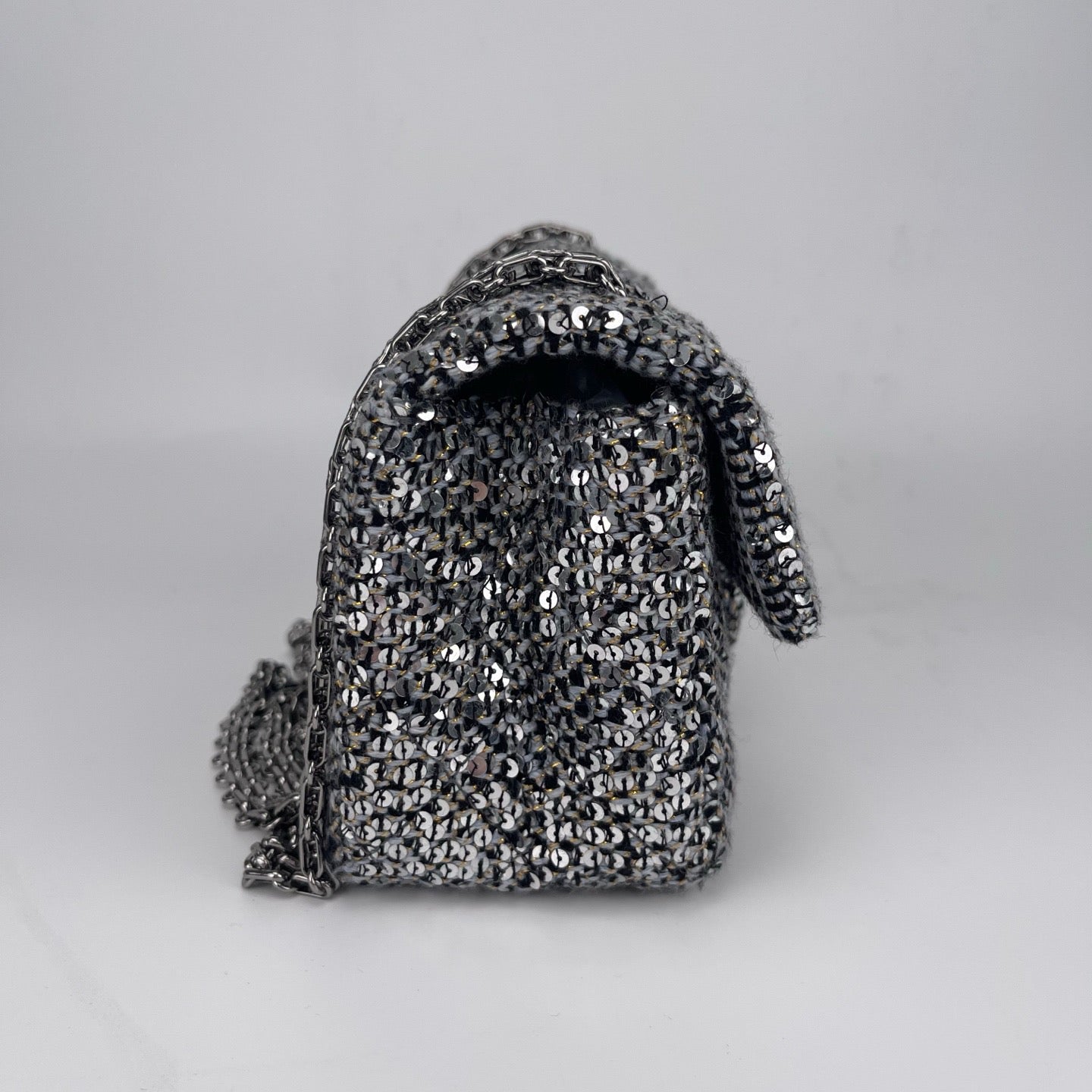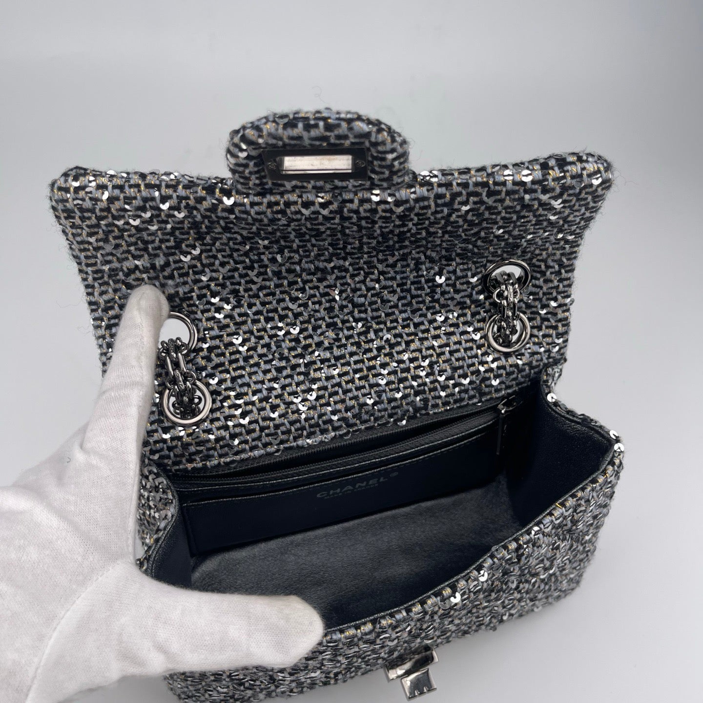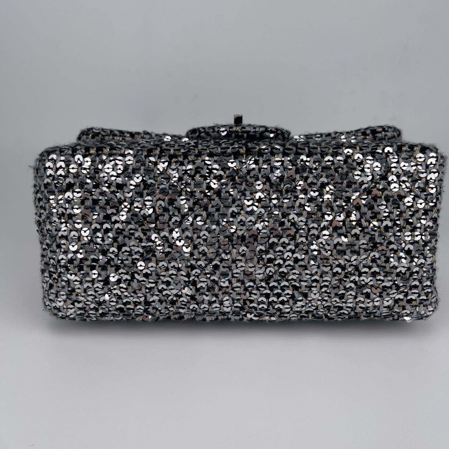 Pièce extrêmement rare de Chanel : le 2.55 Grand Mini Haute Couture, revisité en argent scintillant, perles métalliques et broderies luxueuses.