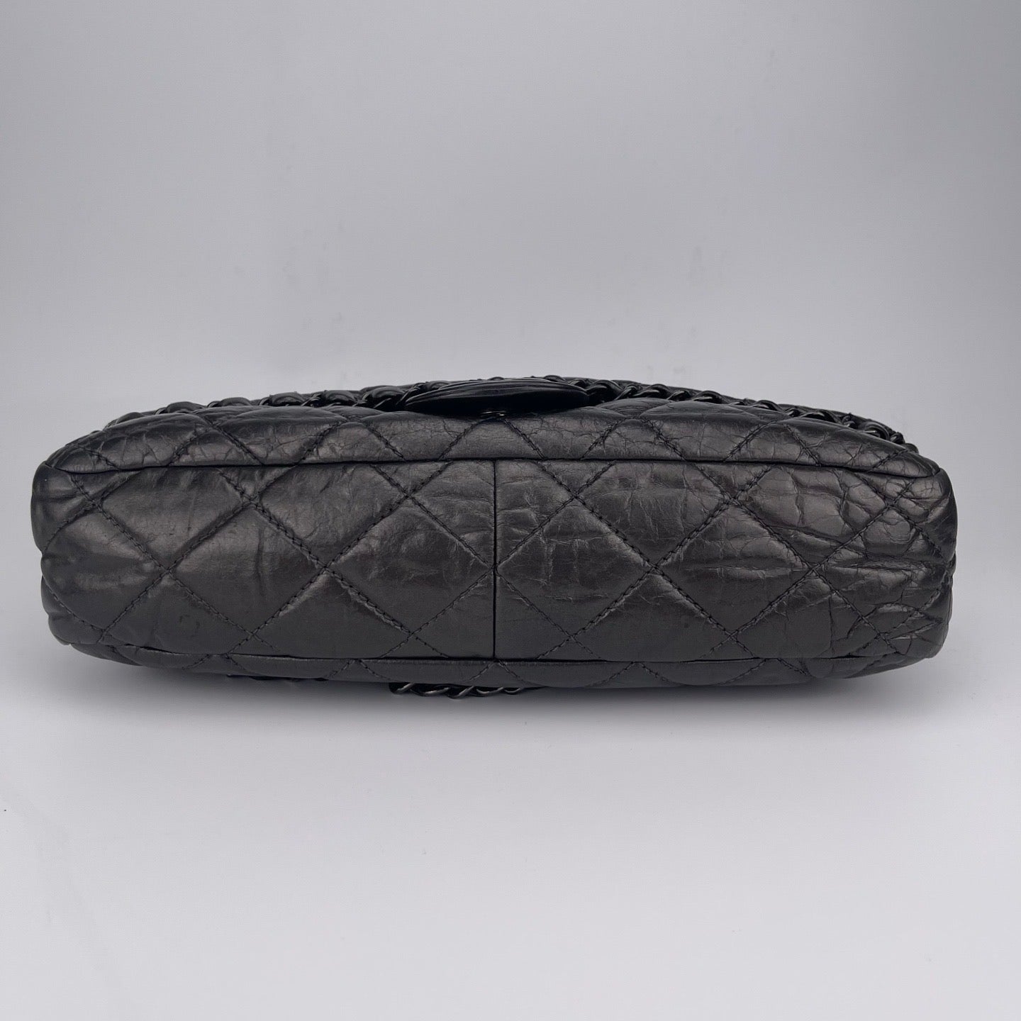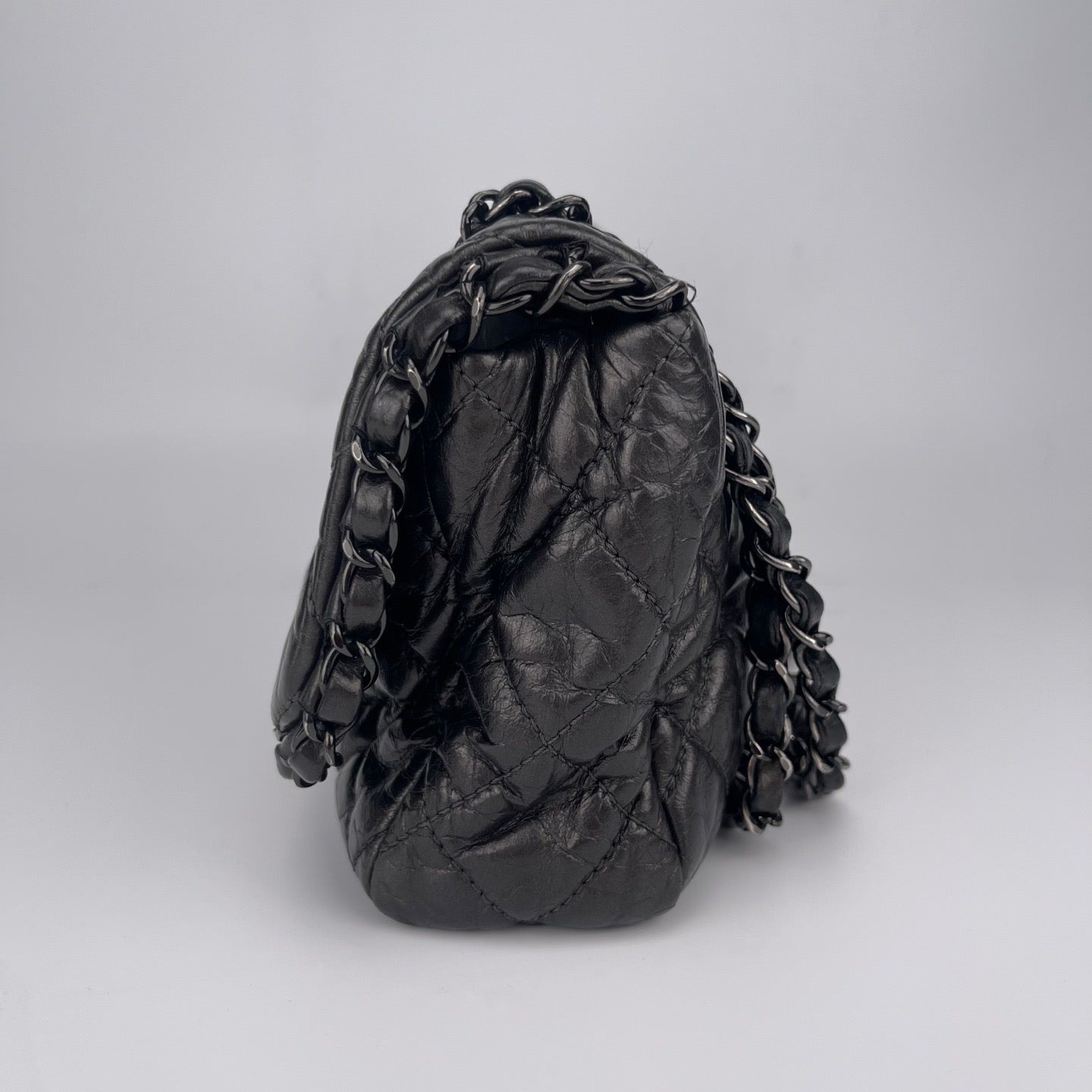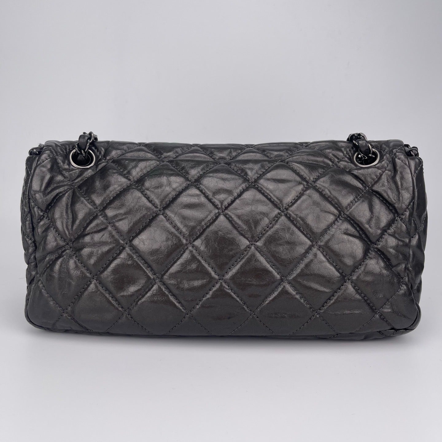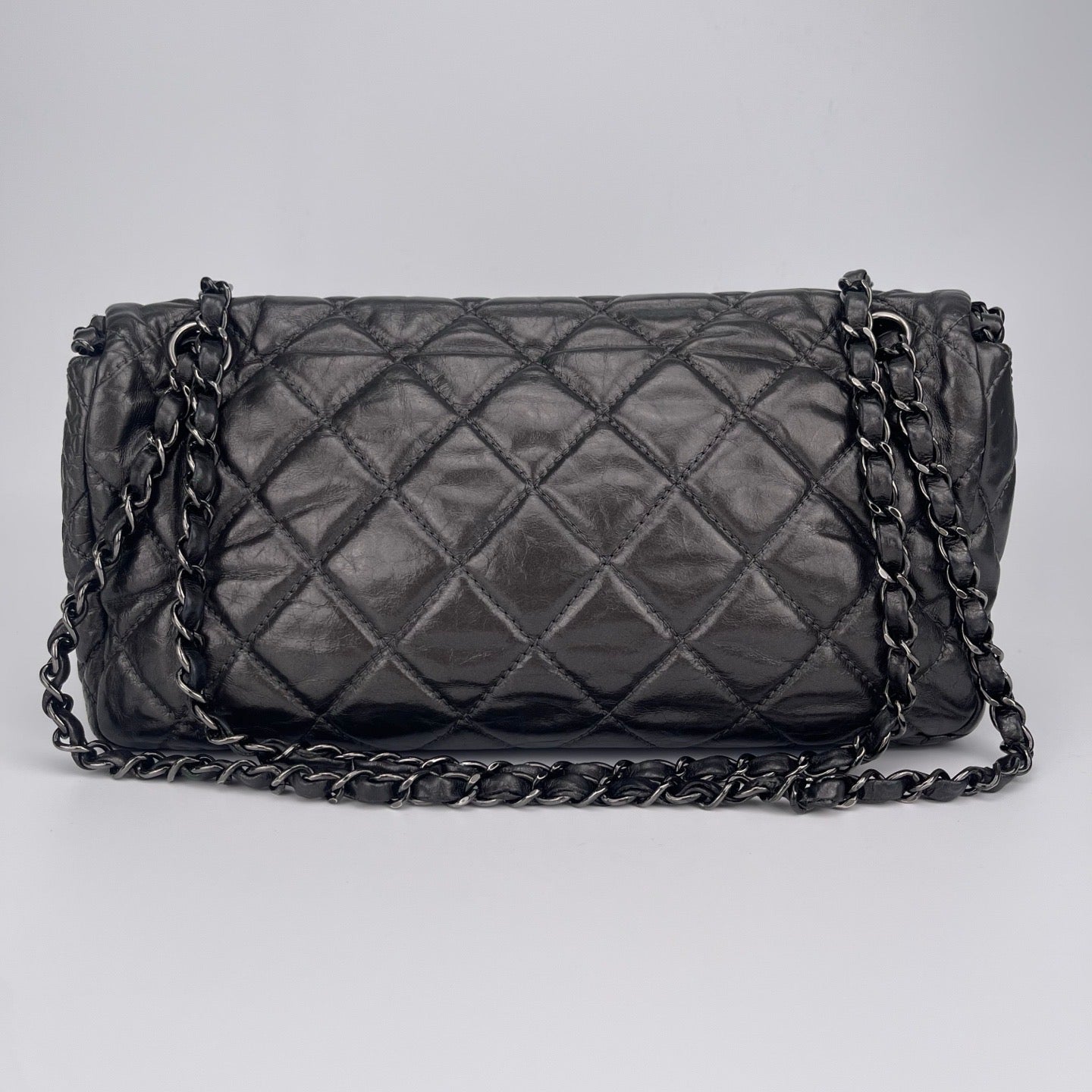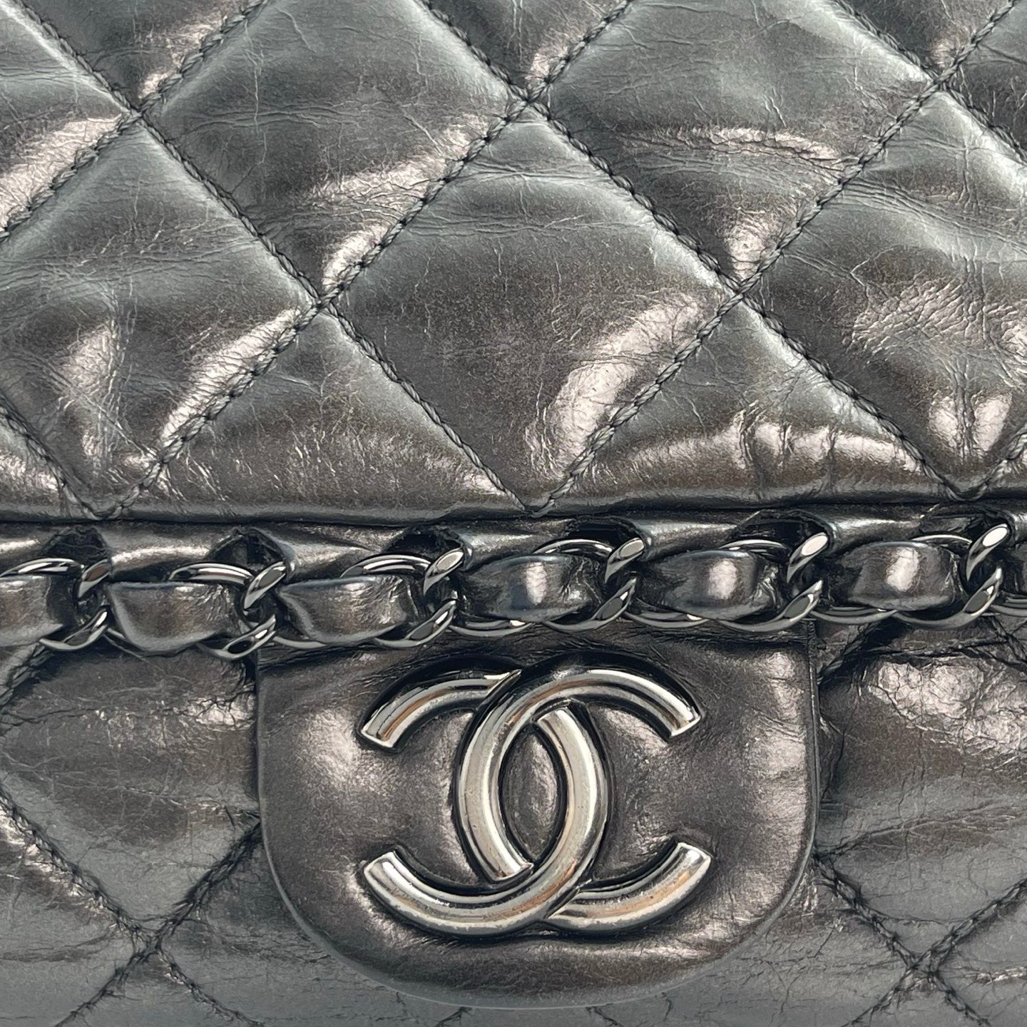 Sublime Chanel Classic Flap en cuir de veau gris carbone avec finition silver hardware, un modèle rare au caractère moderne et élégant. Confectionné en cuir huilé (oil wax leather) avec un liseré roulotté, il présente une texture vibrante et une patine naturelle recherchée en vintage.
