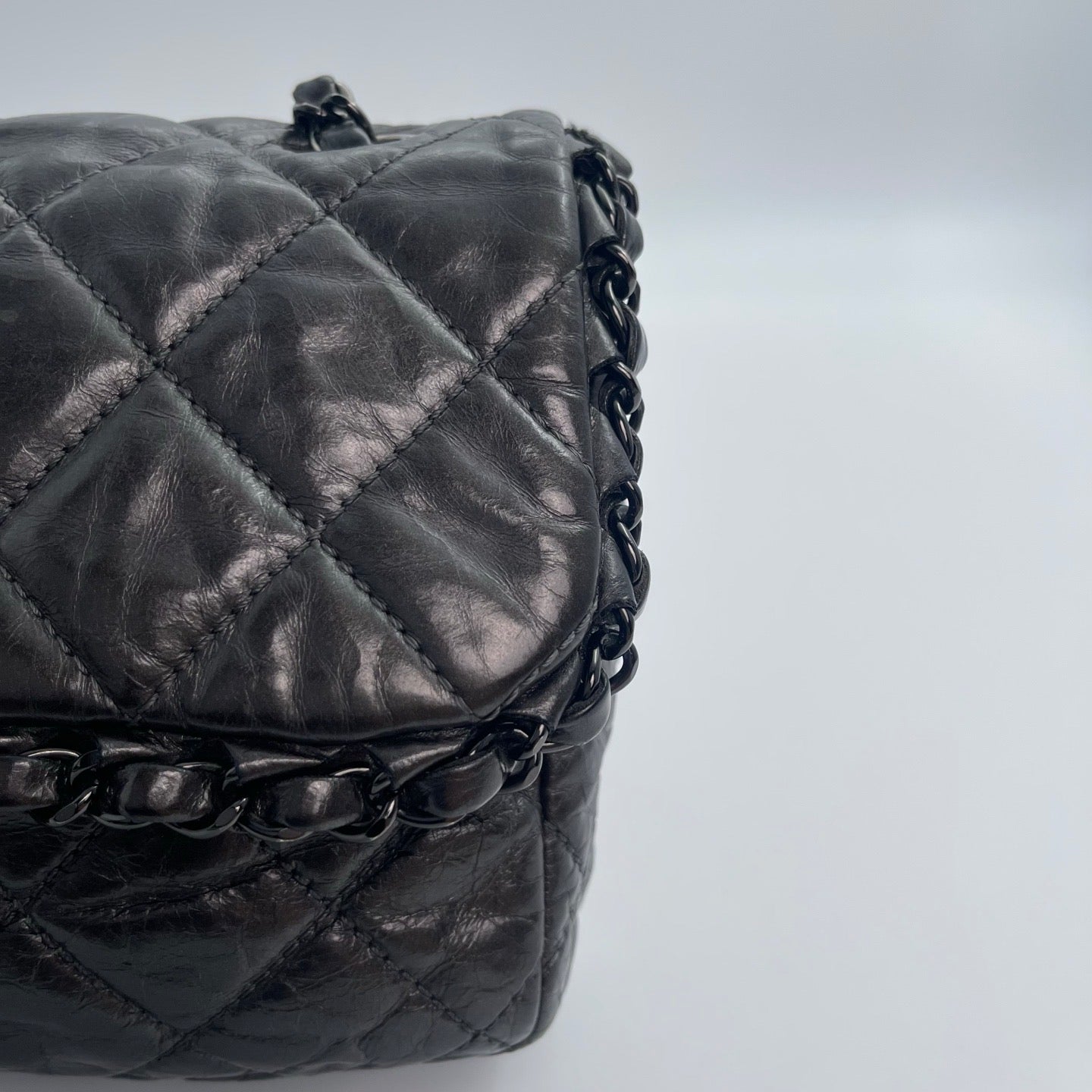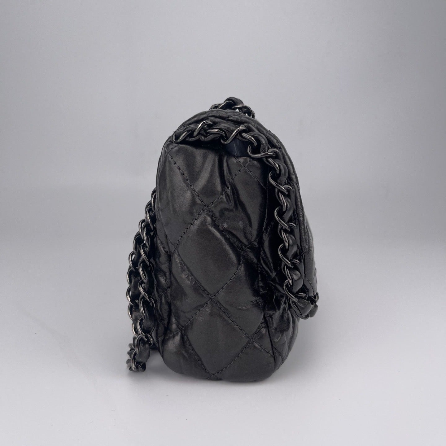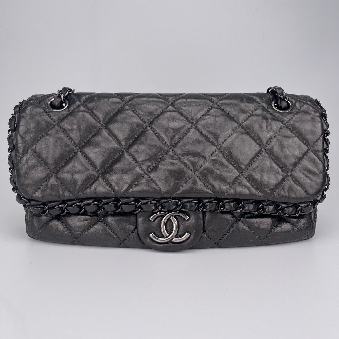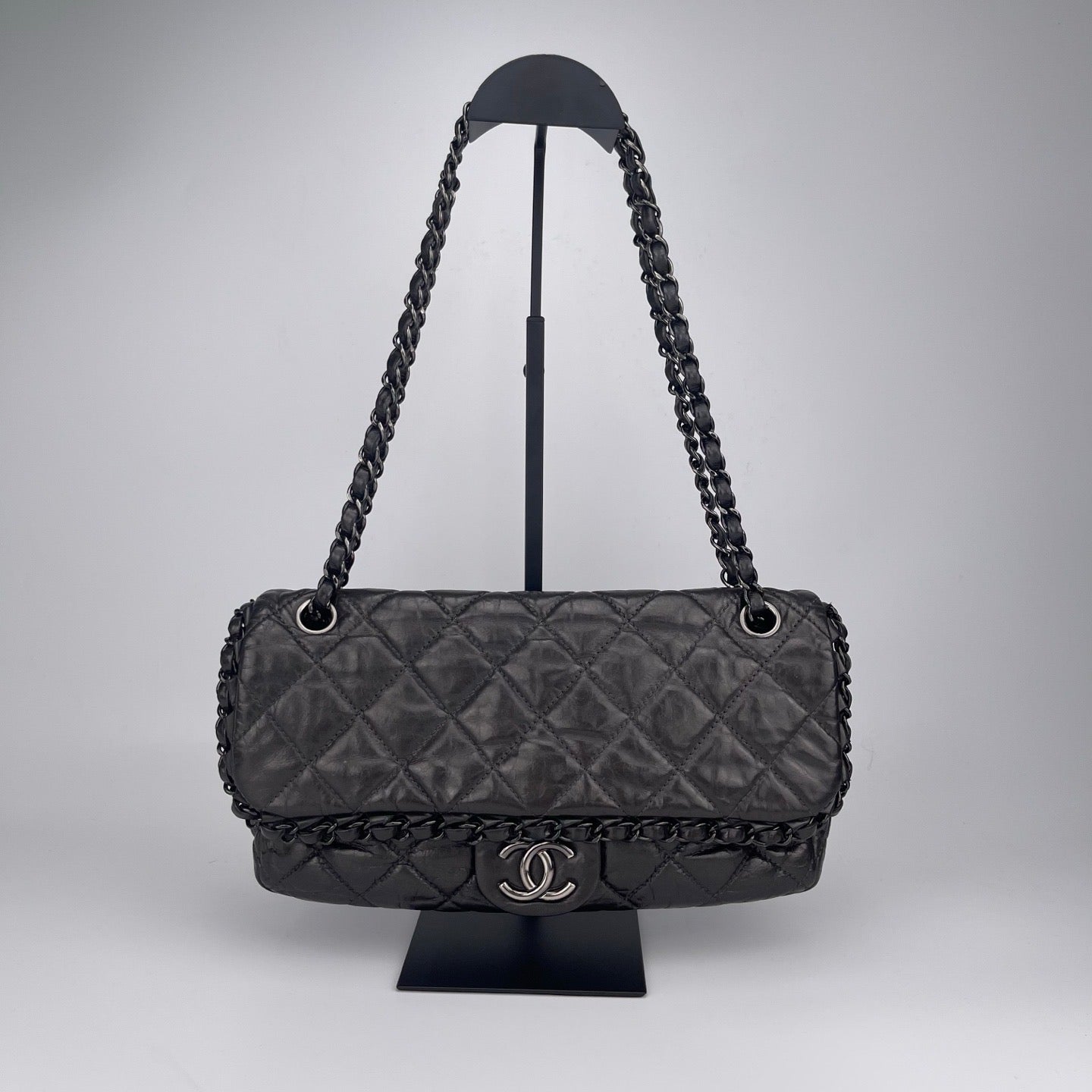 Sublime Chanel Classic Flap en cuir de veau gris carbone avec finition silver hardware, un modèle rare au caractère moderne et élégant. Confectionné en cuir huilé (oil wax leather) avec un liseré roulotté, il présente une texture vibrante et une patine naturelle recherchée en vintage.