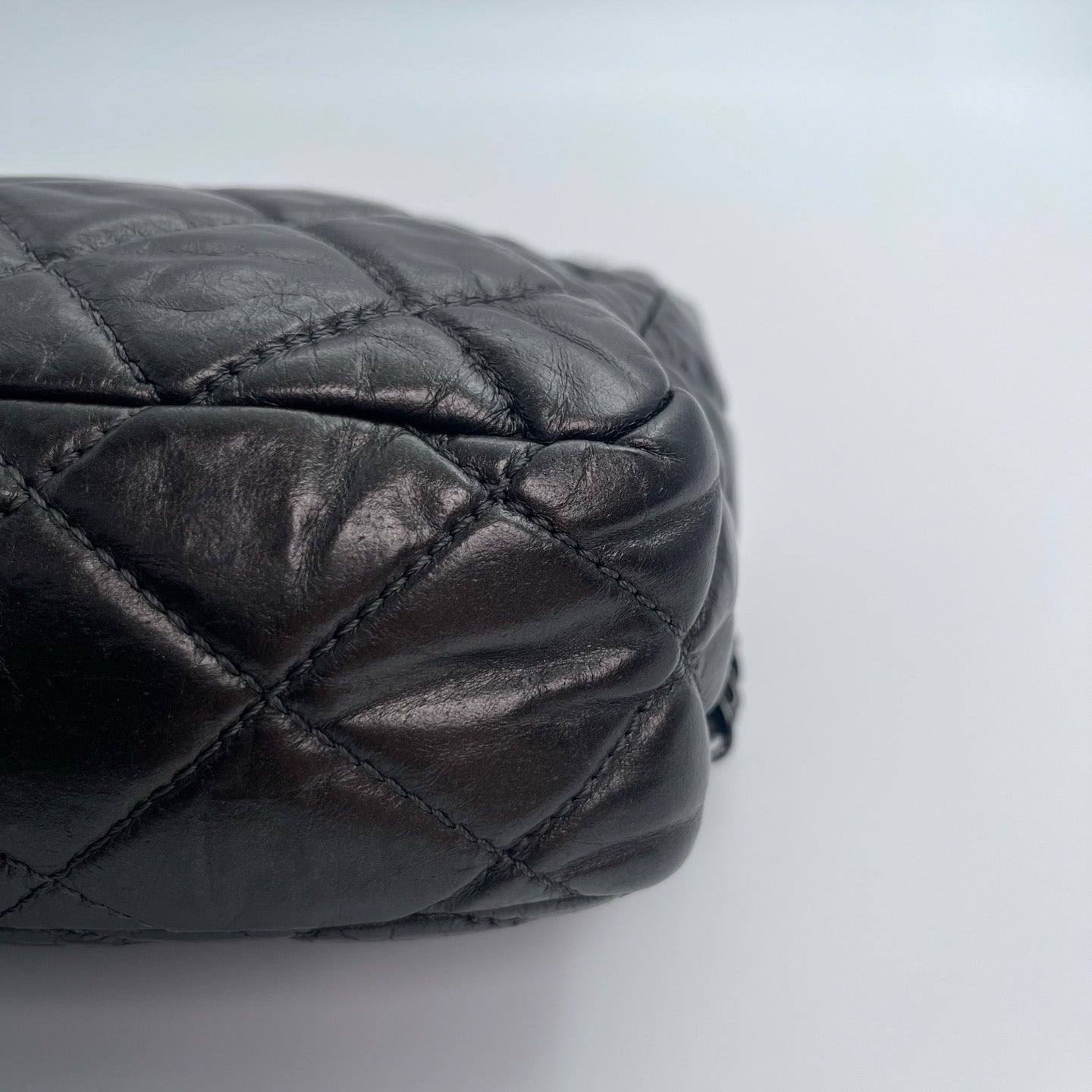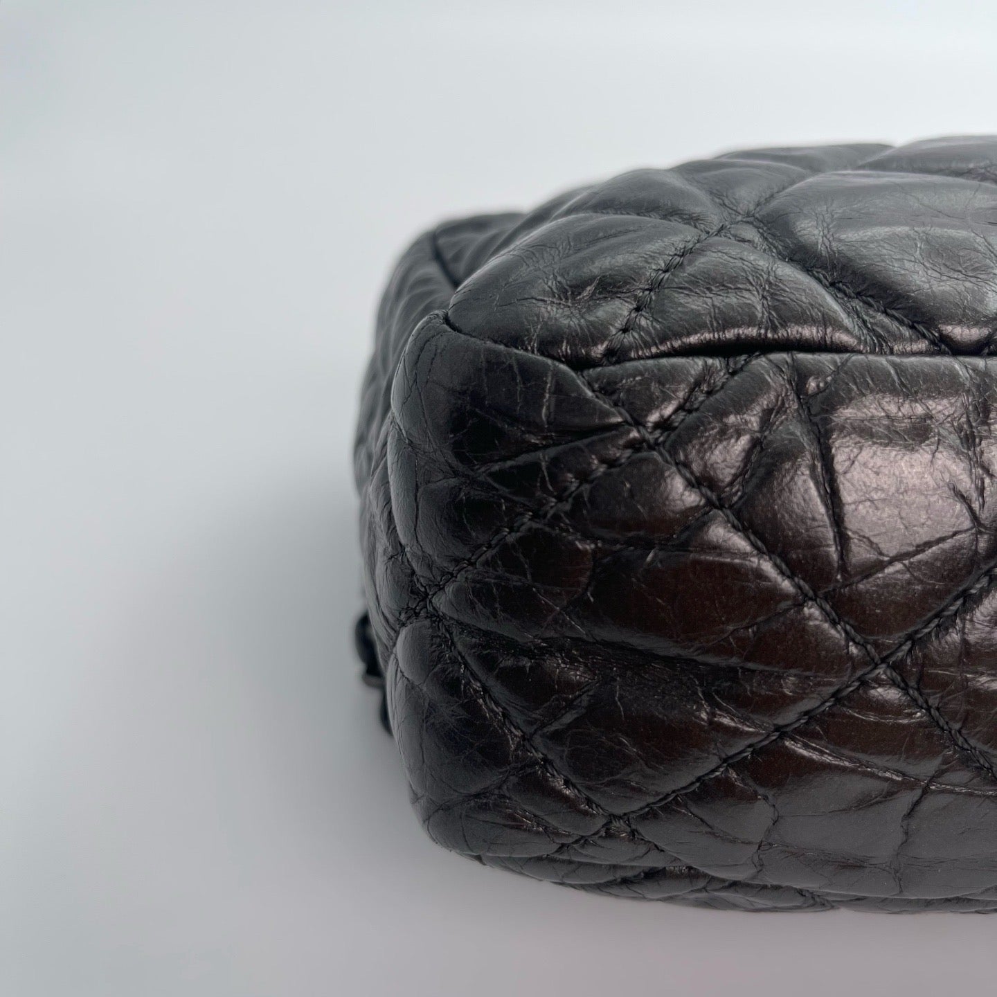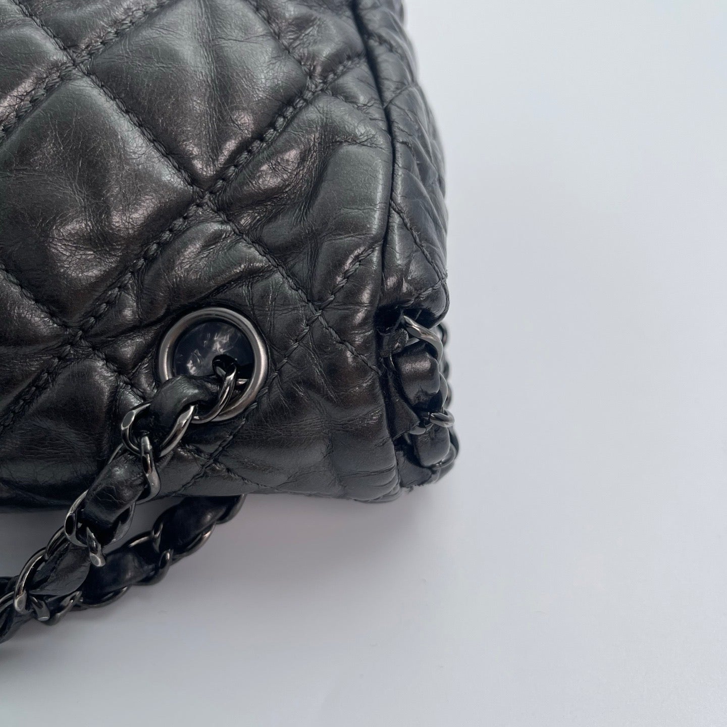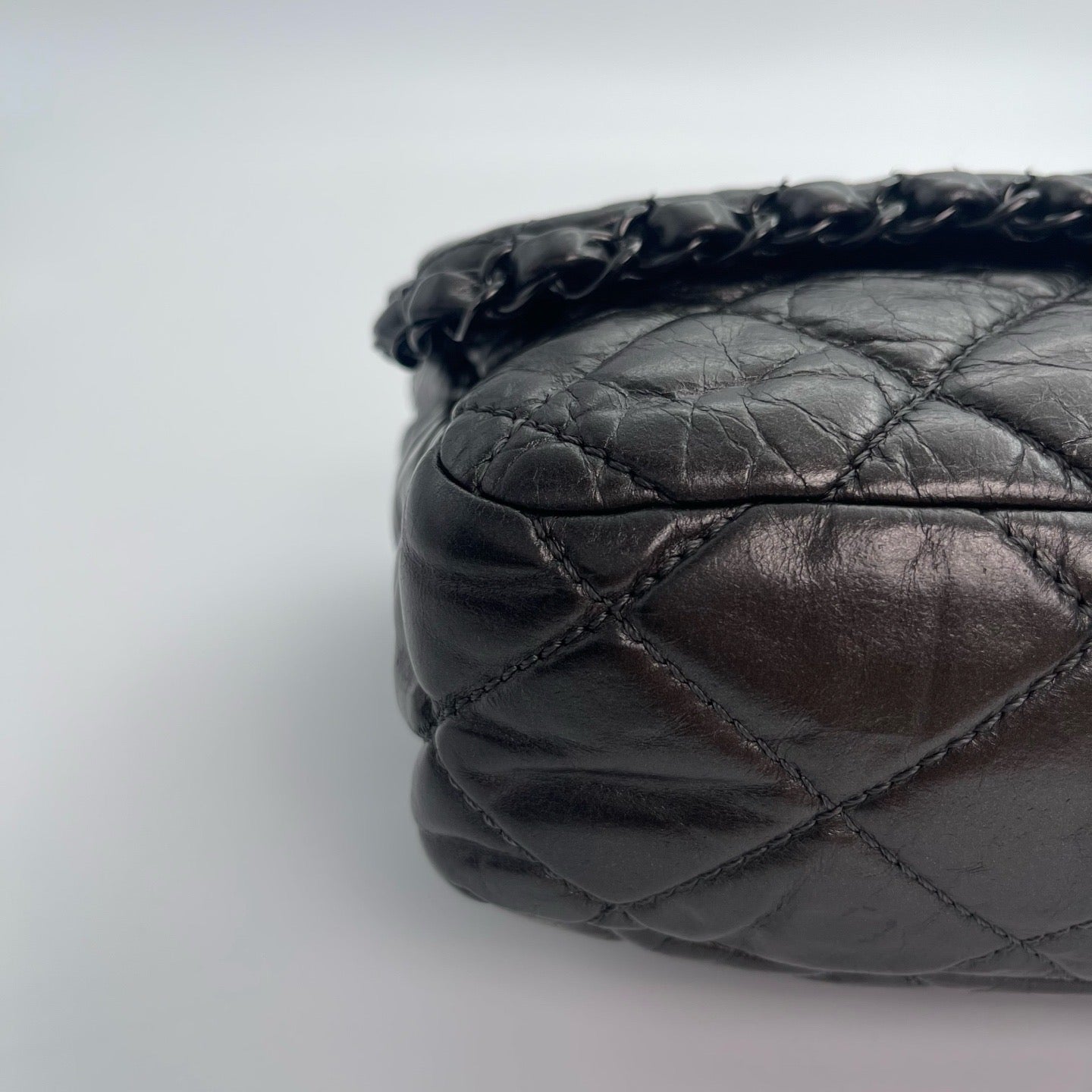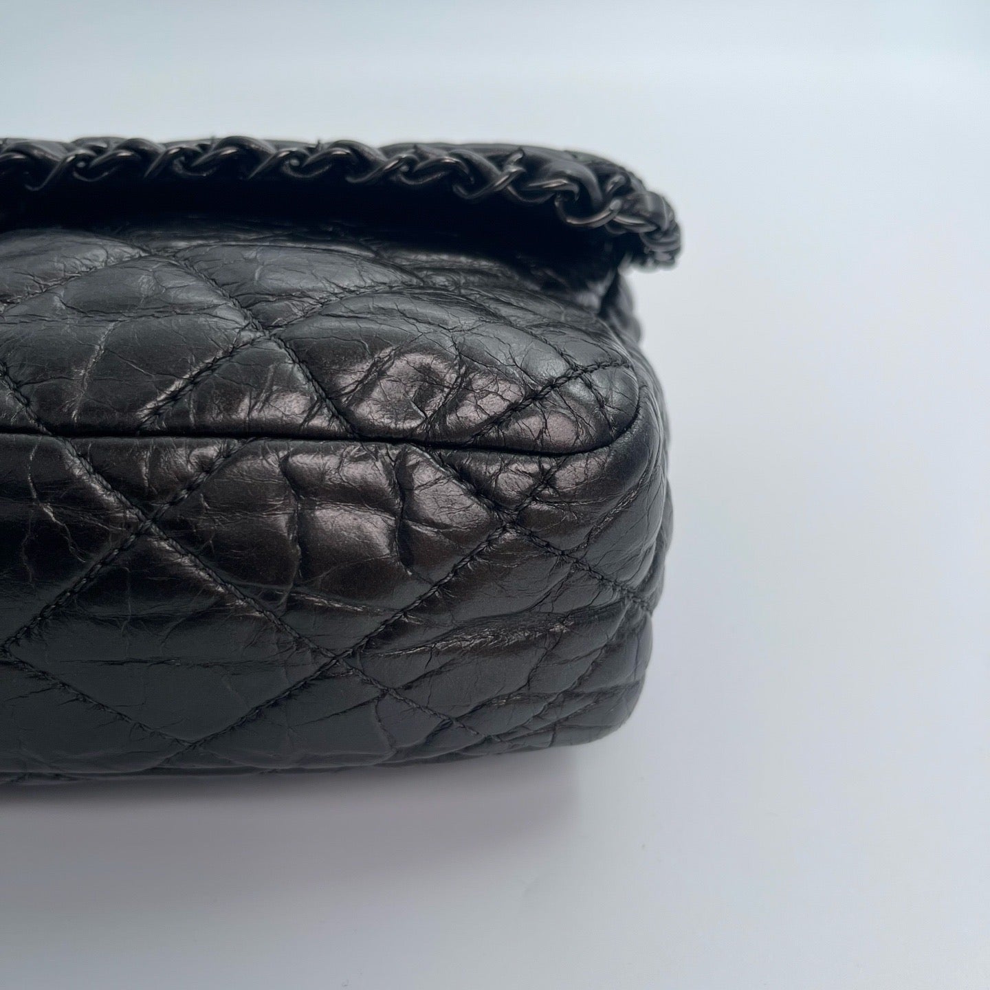 Sublime Chanel Classic Flap en cuir de veau gris carbone avec finition silver hardware, un modèle rare au caractère moderne et élégant. Confectionné en cuir huilé (oil wax leather) avec un liseré roulotté, il présente une texture vibrante et une patine naturelle recherchée en vintage.