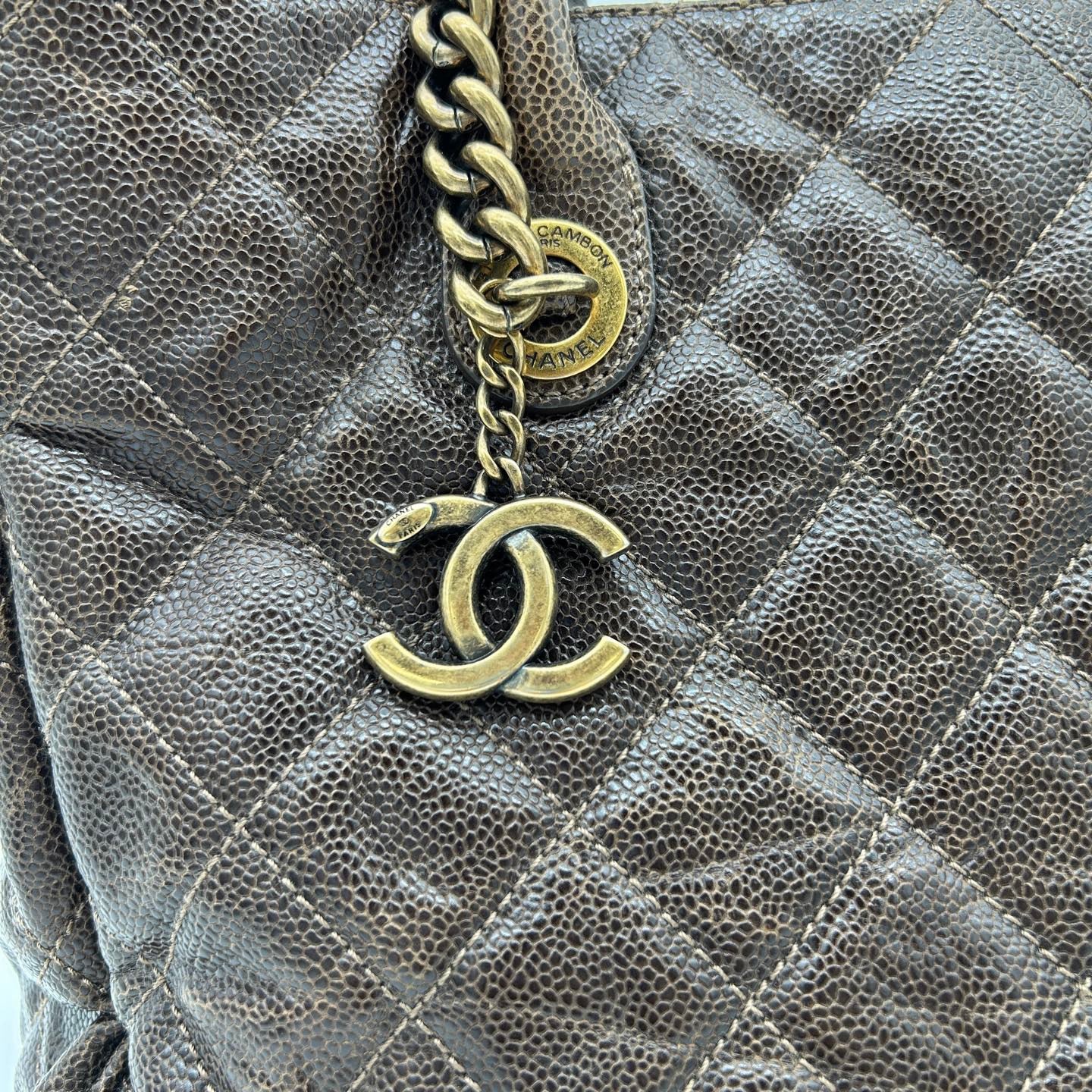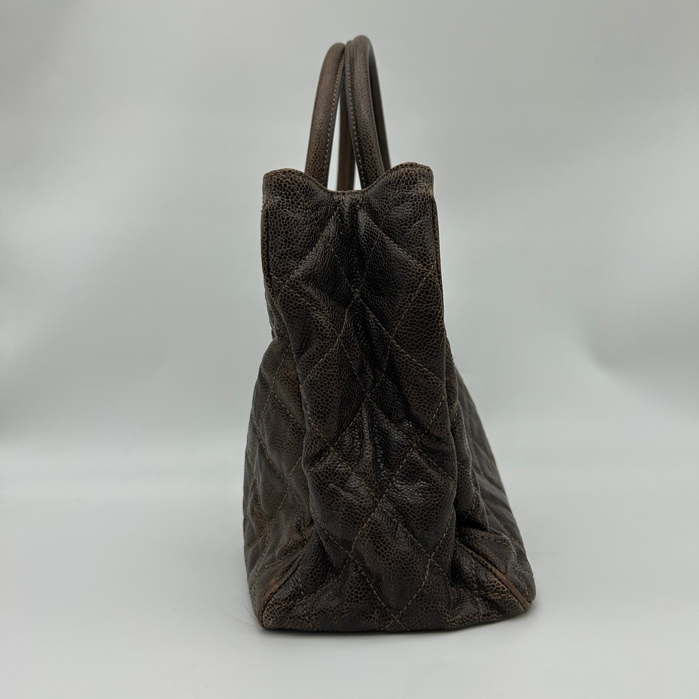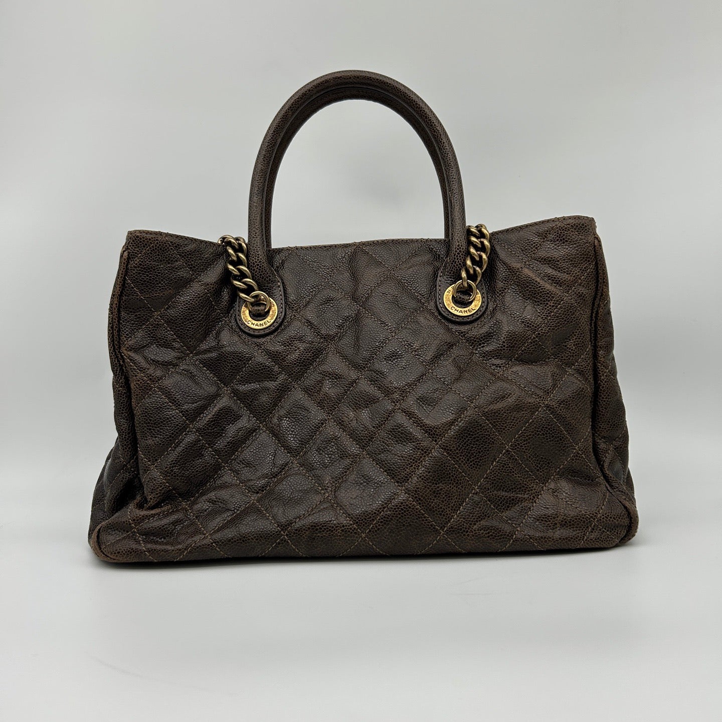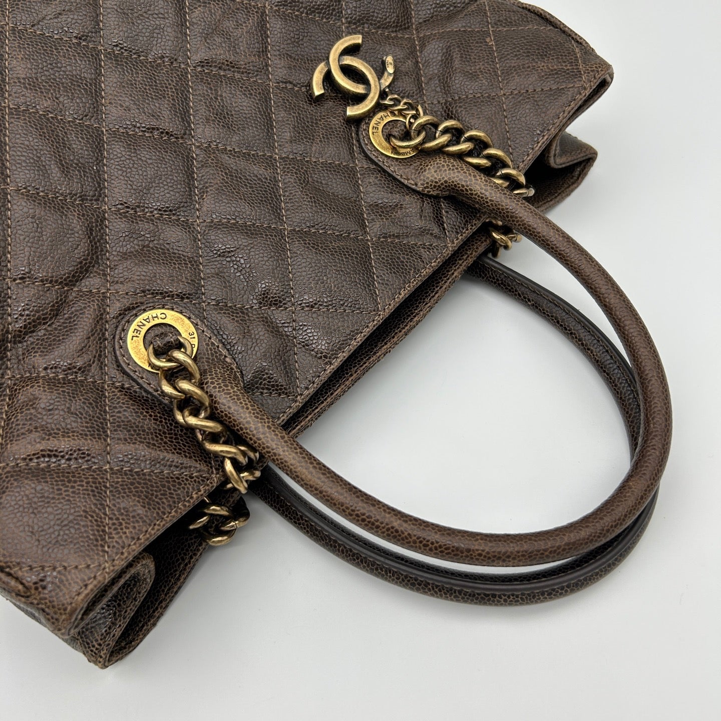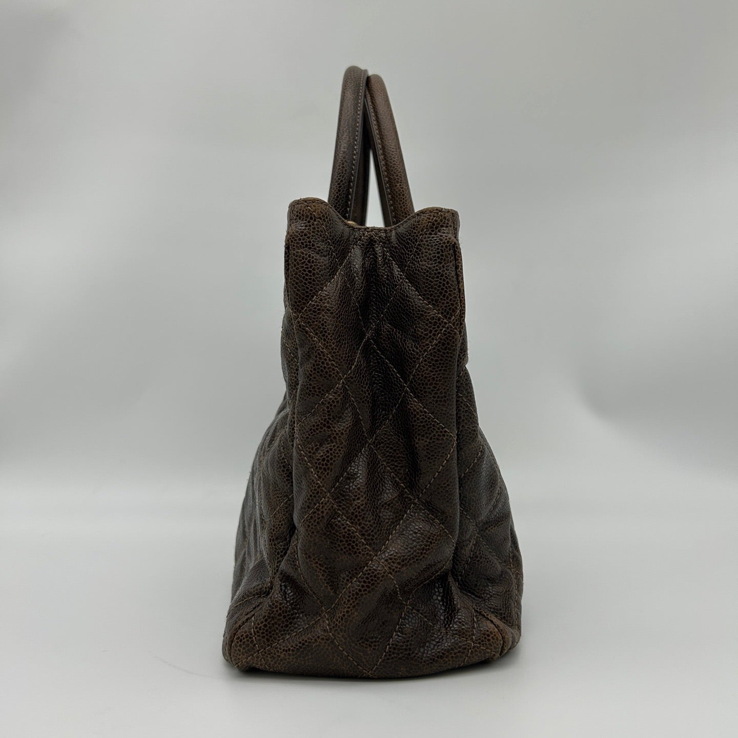 Chanel – Sac 2-Way Tote Vintage Marron Doré en Cuir Caviar
