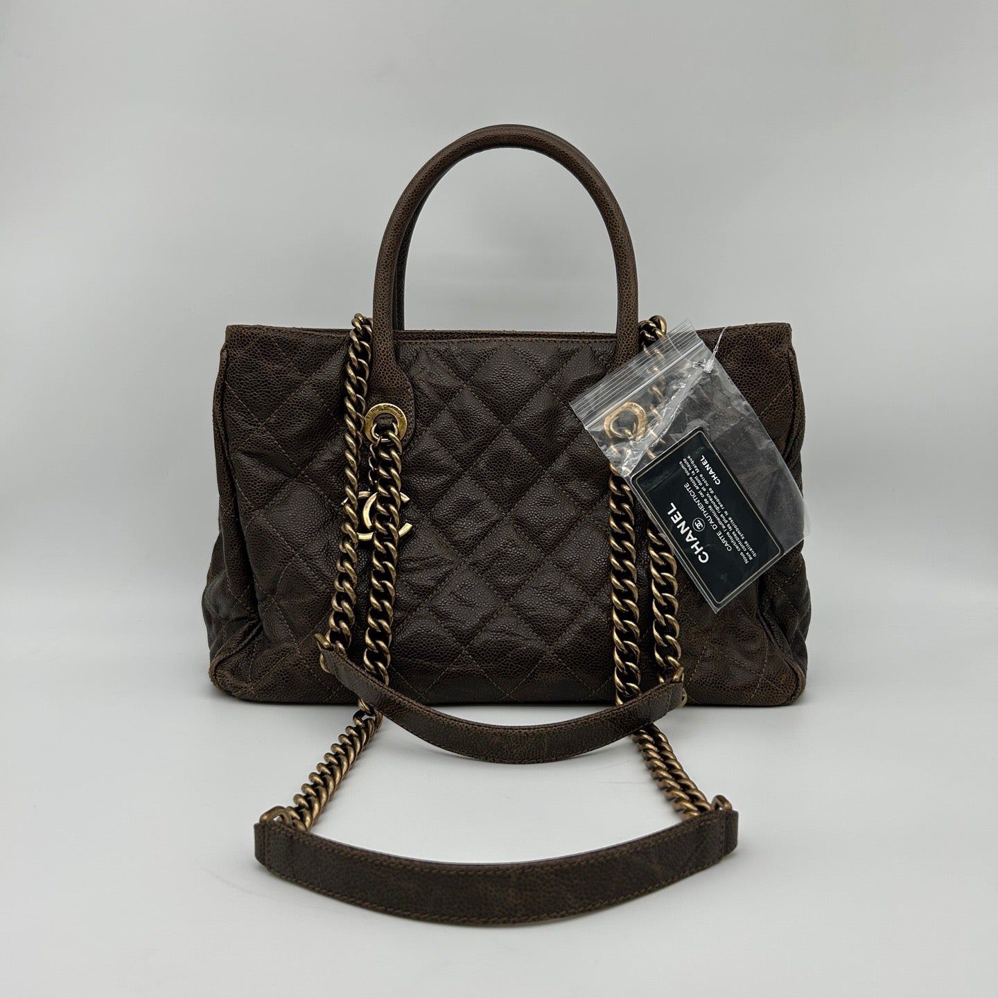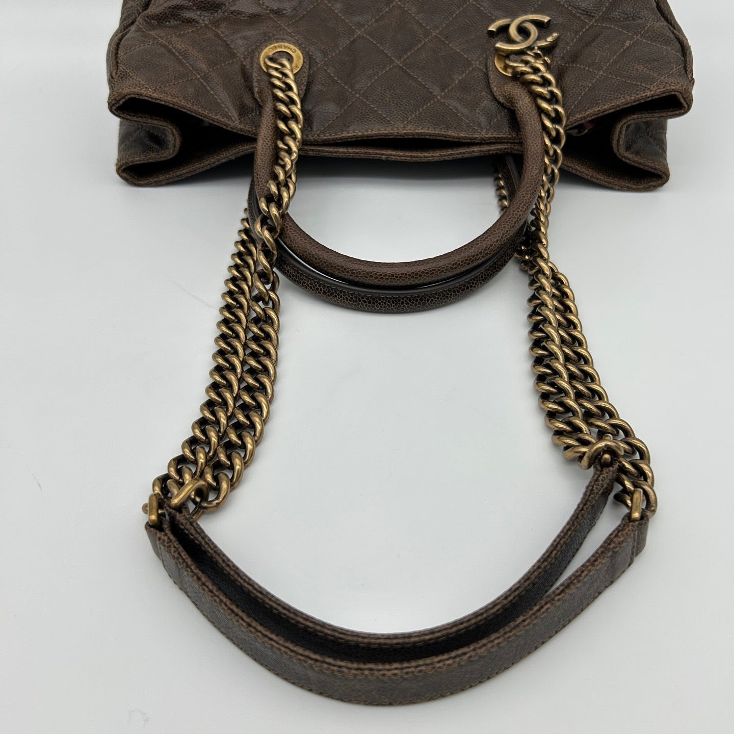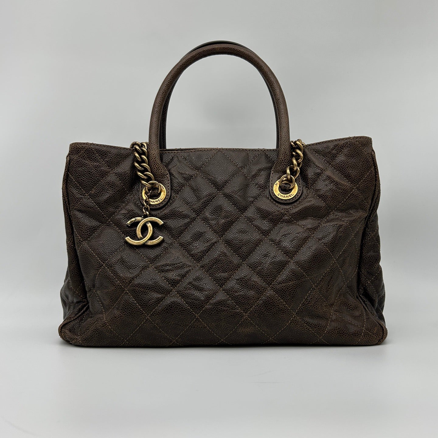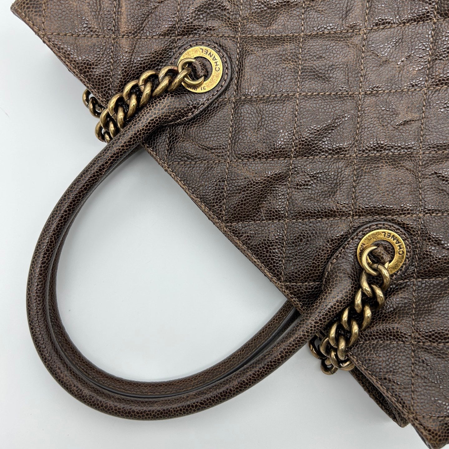 Chanel – Sac 2-Way Tote Vintage Marron Doré en Cuir Caviar