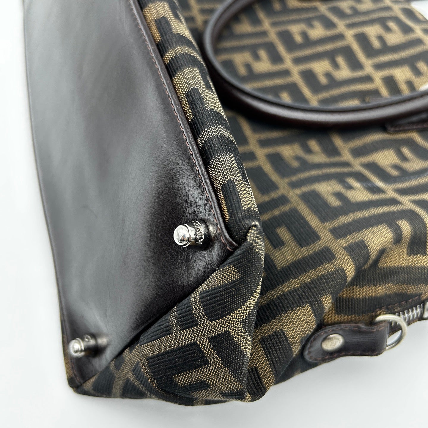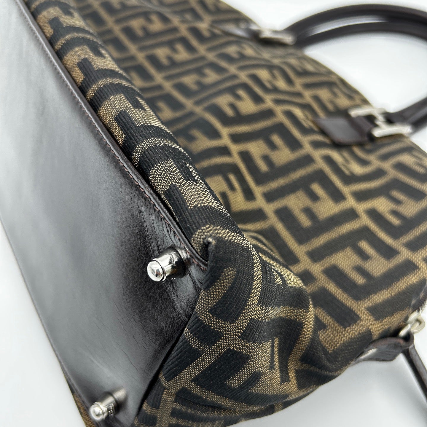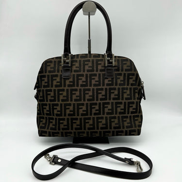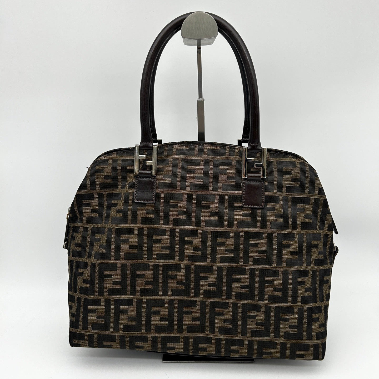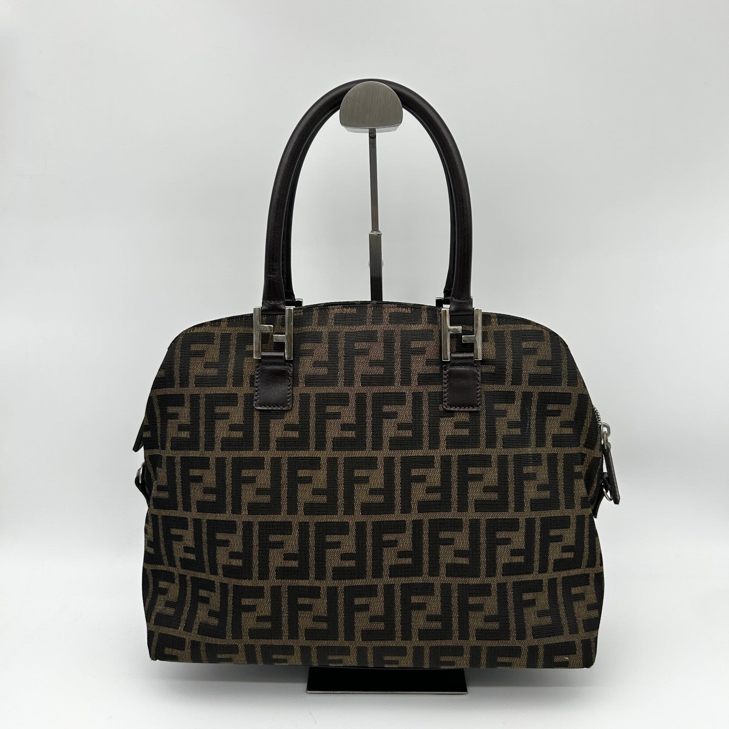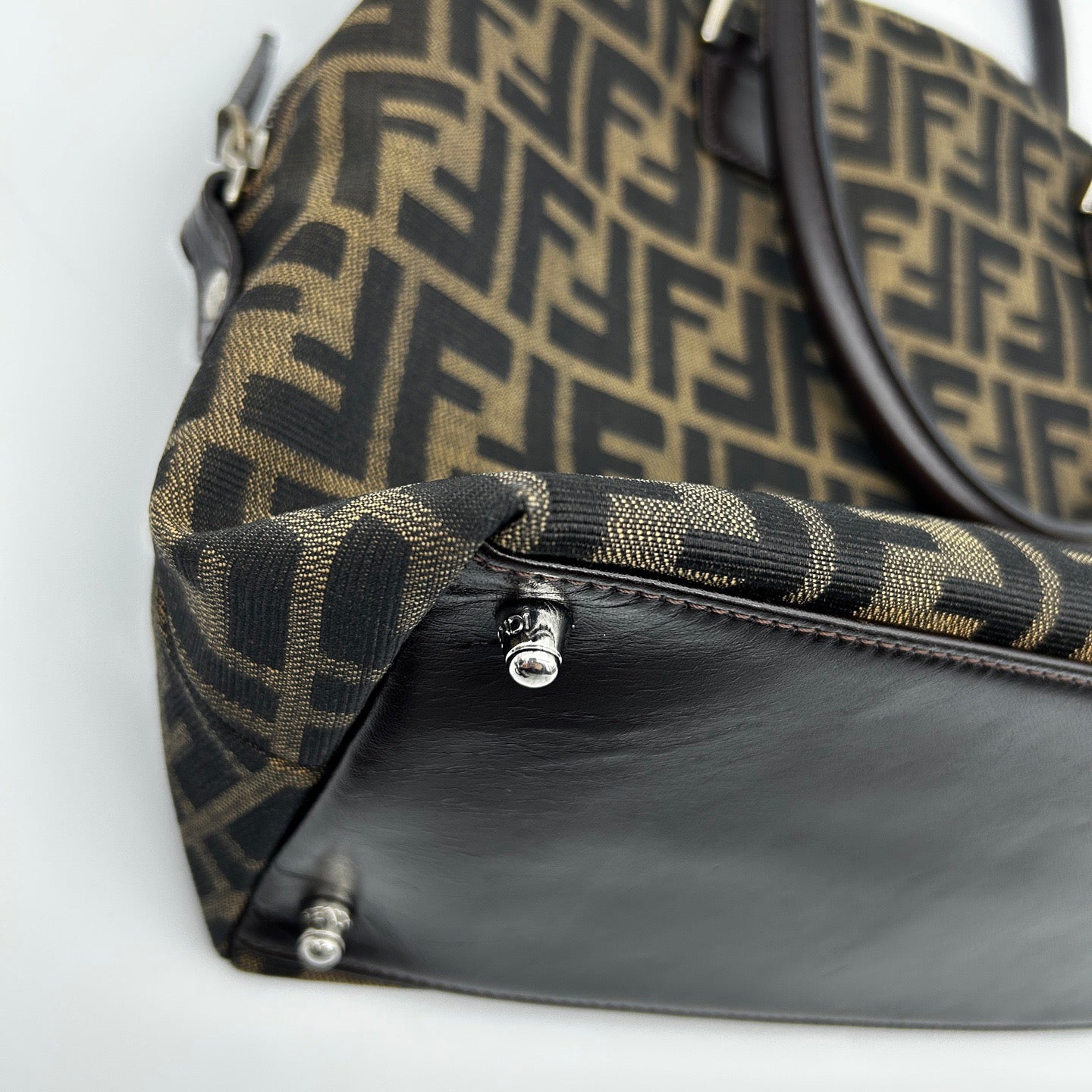 Sac Fendi Boston vintage en toile monogrammée Zucca, doté de poignées arrondies et d’une bandoulière amovible.