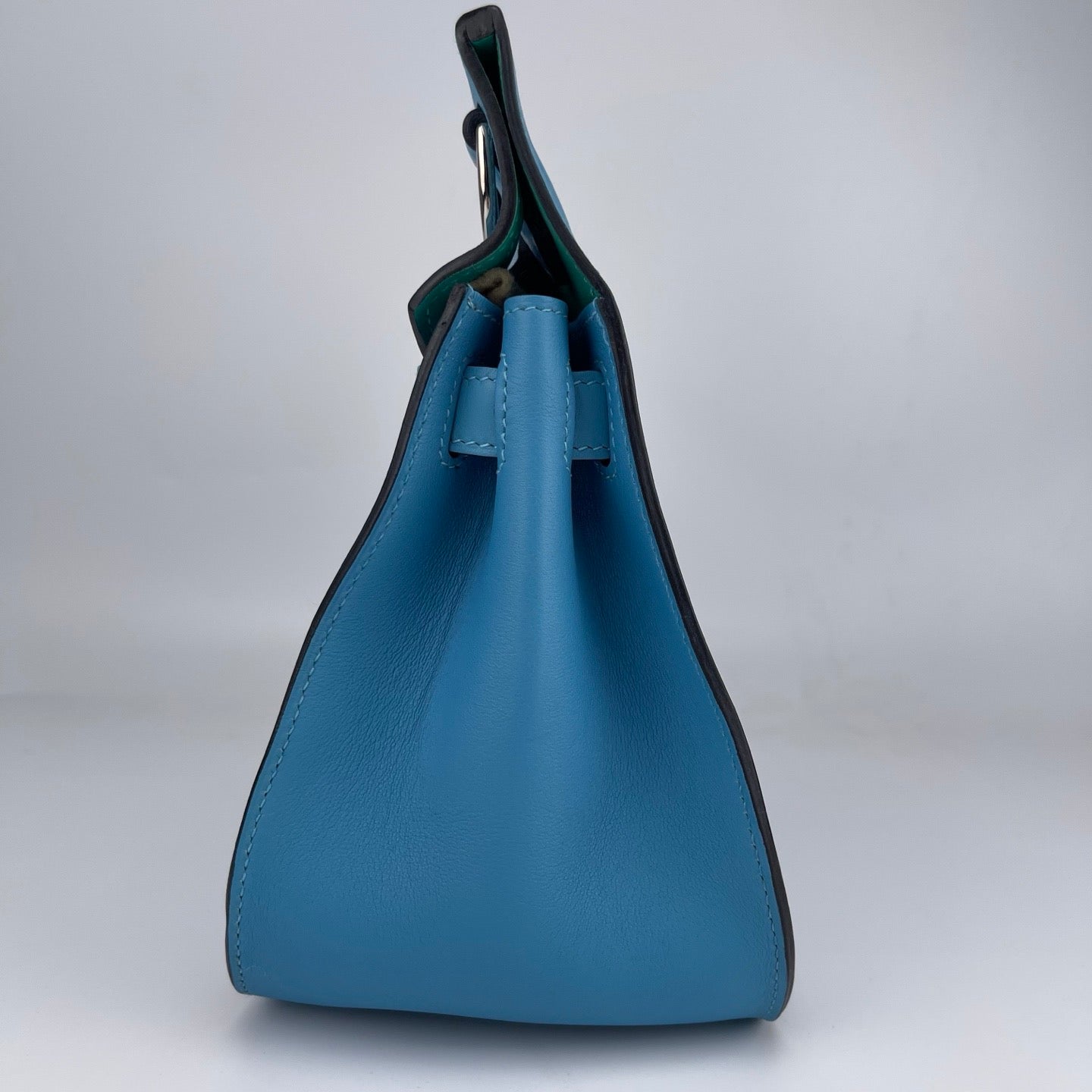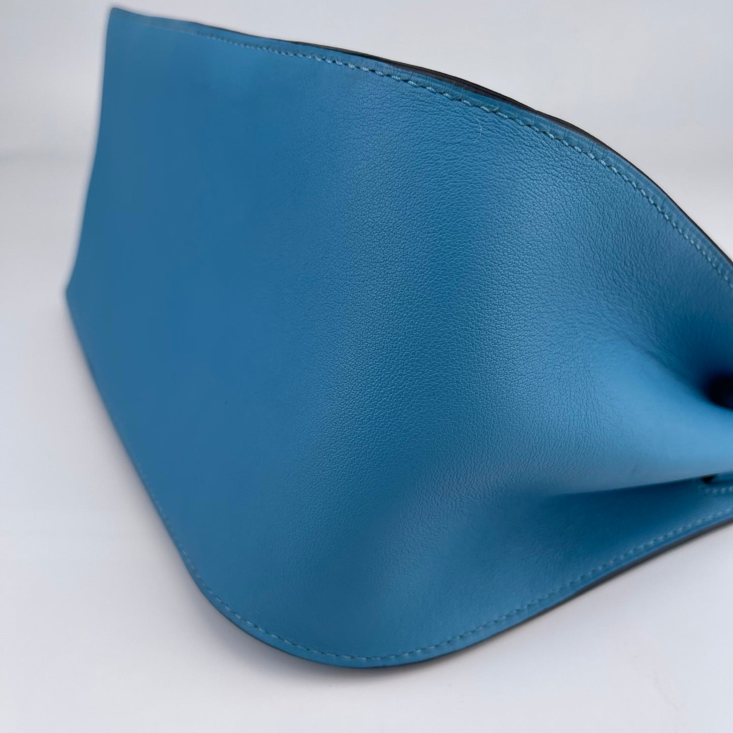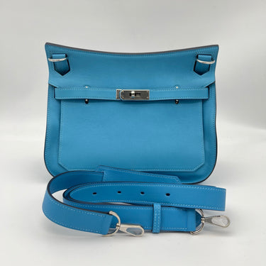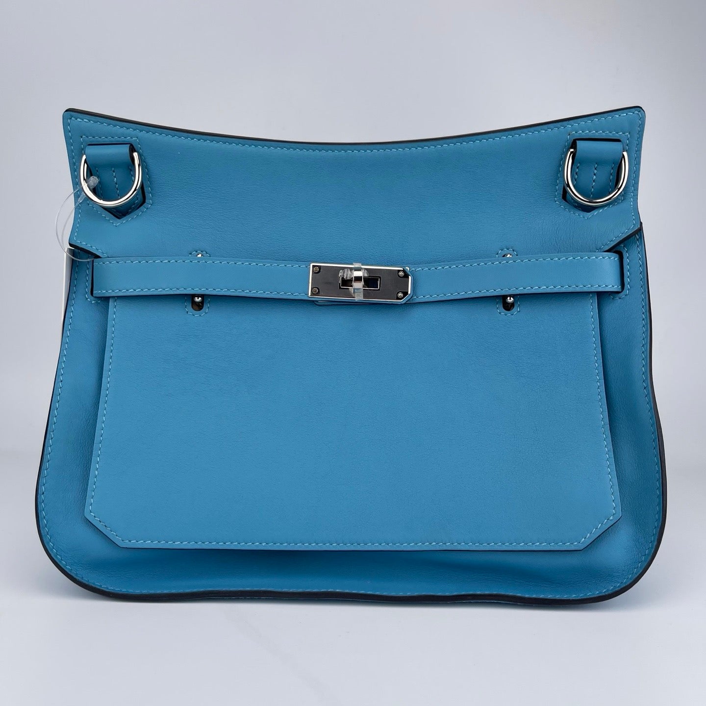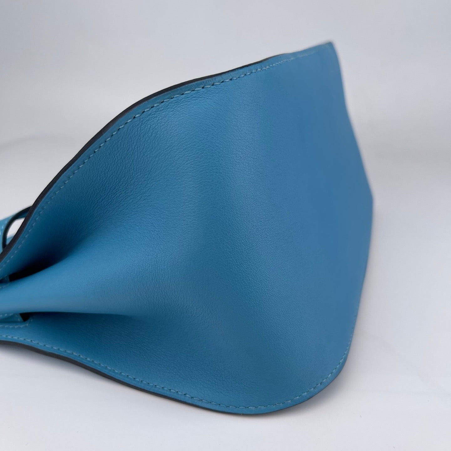Superbe Hermès Jypsière 28 en cuir bleu Amorgos (Aegean), finition argentée. Inspiré du Birkin mais pensé pour le quotidien, le Jypsière associe élégance intemporelle et praticité moderne.