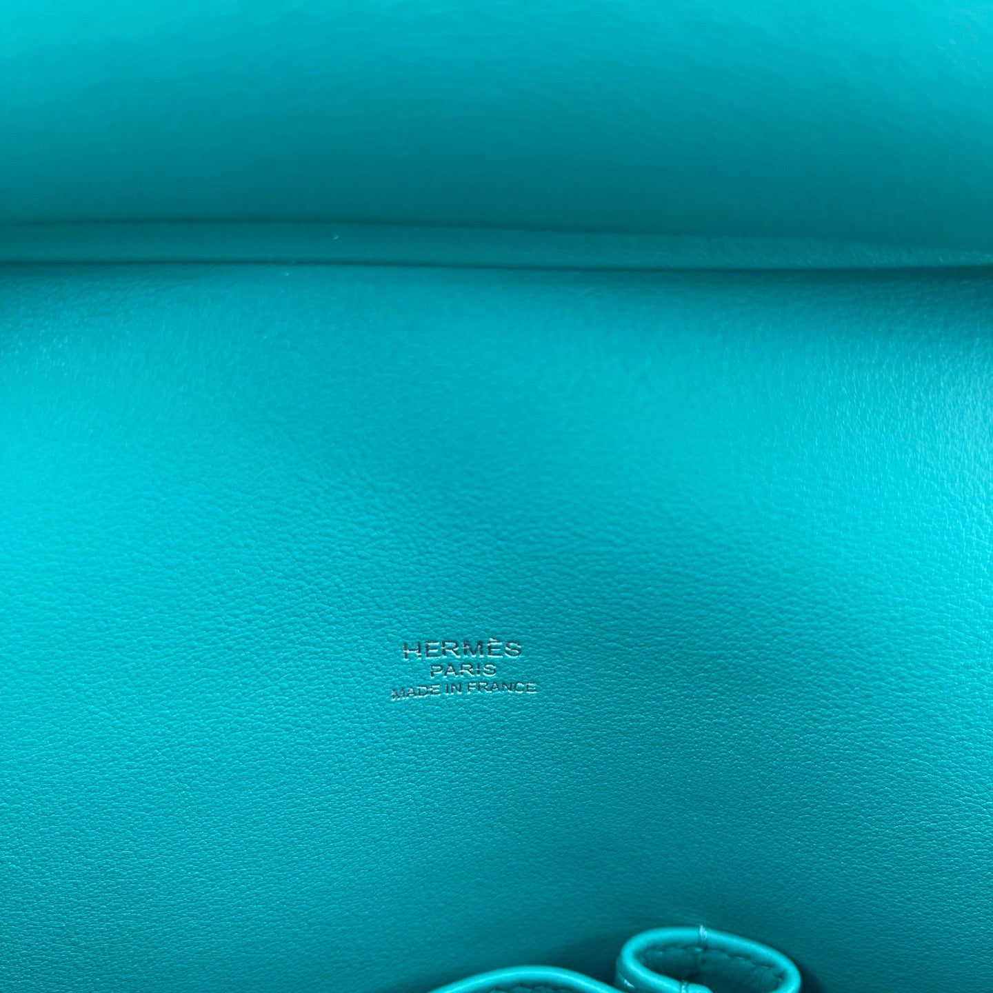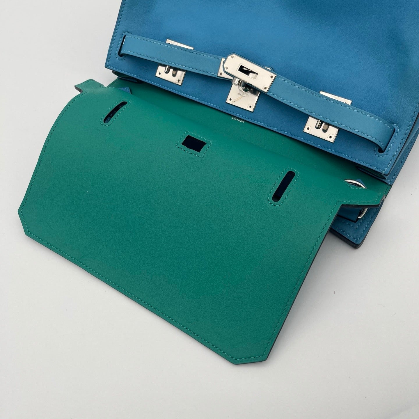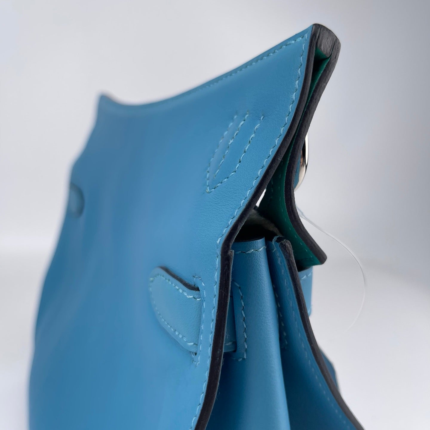 Superbe Hermès Jypsière 28 en cuir bleu Amorgos (Aegean), finition argentée. Inspiré du Birkin mais pensé pour le quotidien, le Jypsière associe élégance intemporelle et praticité moderne.