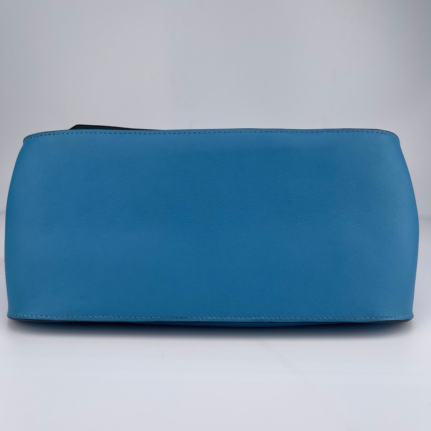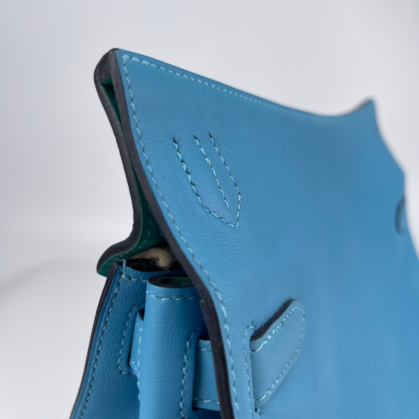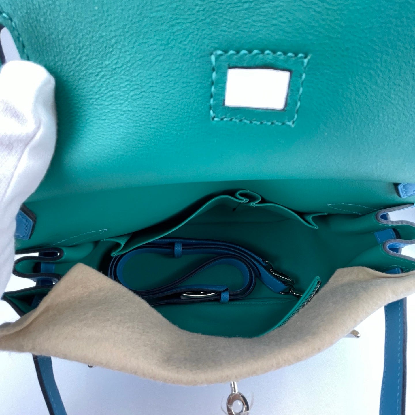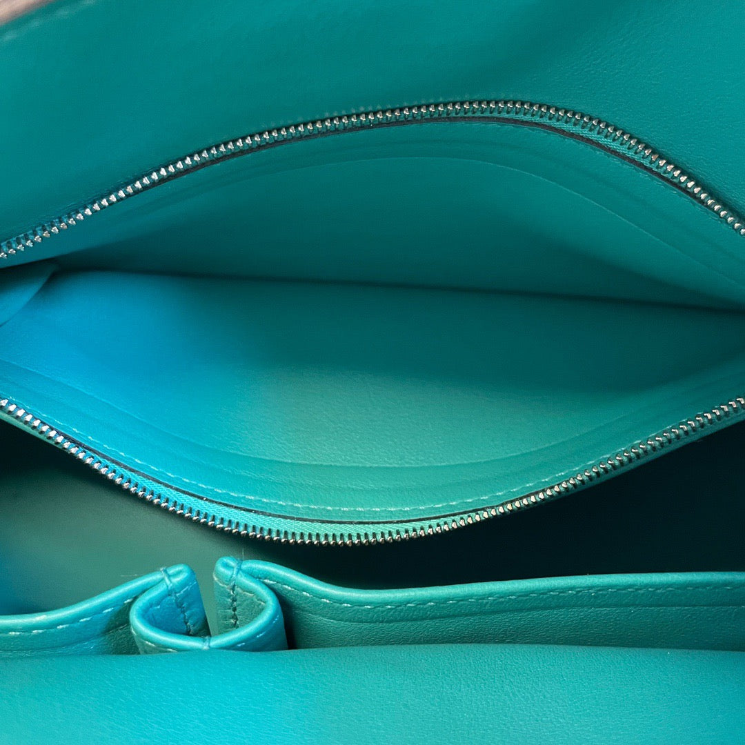 Superbe Hermès Jypsière 28 en cuir bleu Amorgos (Aegean), finition argentée. Inspiré du Birkin mais pensé pour le quotidien, le Jypsière associe élégance intemporelle et praticité moderne.
