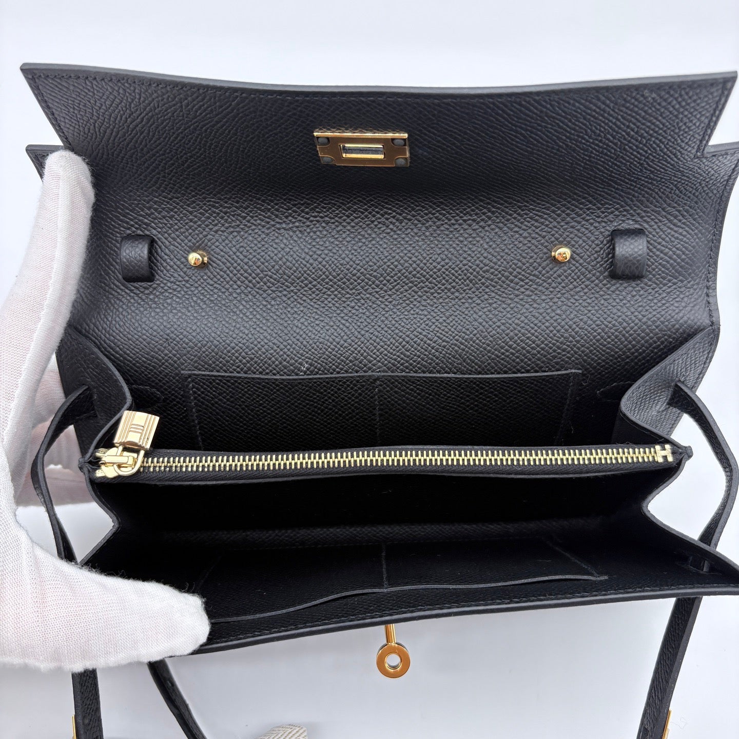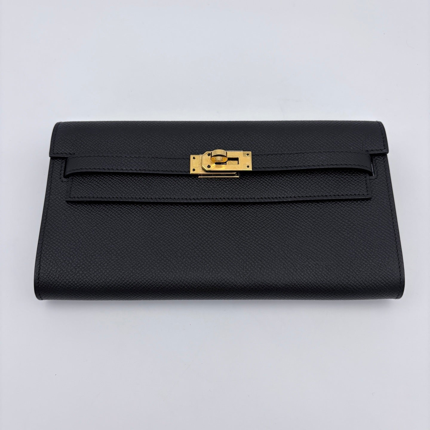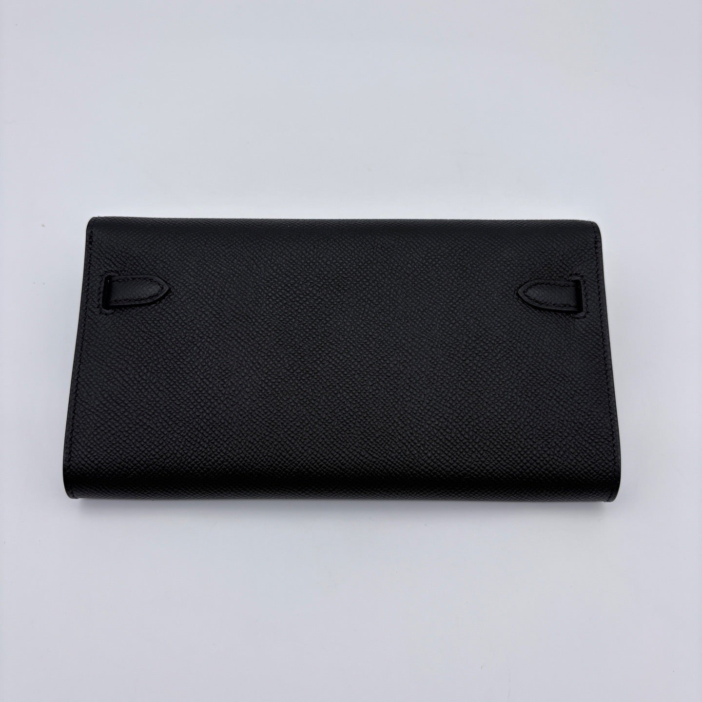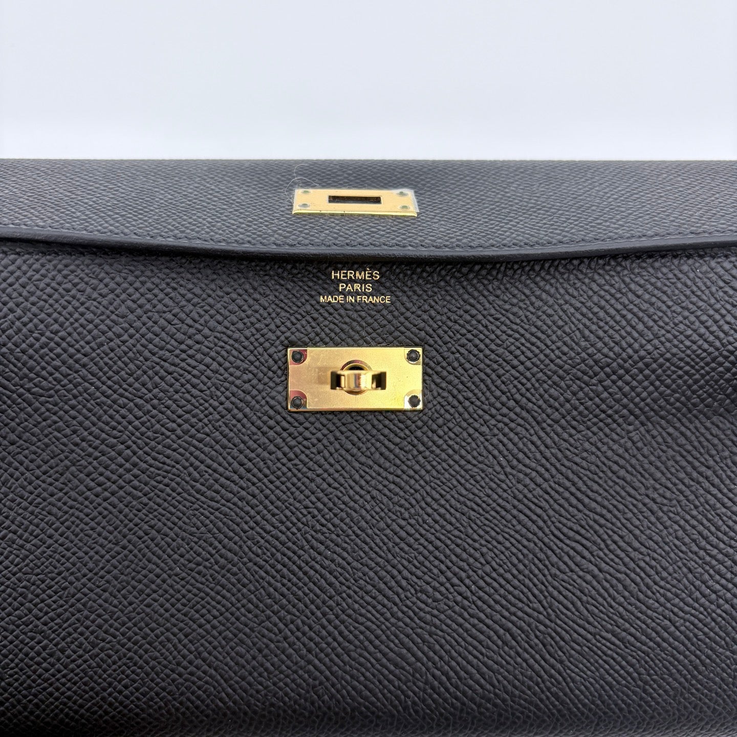 Pièce iconique de la maison Hermès, le Kelly Wallet To Go est une interprétation élégante et contemporaine du sac Kelly. Ce modèle en cuir Togo noir, associé à des finitions dorées, incarne le luxe intemporel et la sobriété absolue. Il est accompagné d’une bandoulière amovible en cuir Epsom, permettant un porté bandoulière, épaule ou clutch.