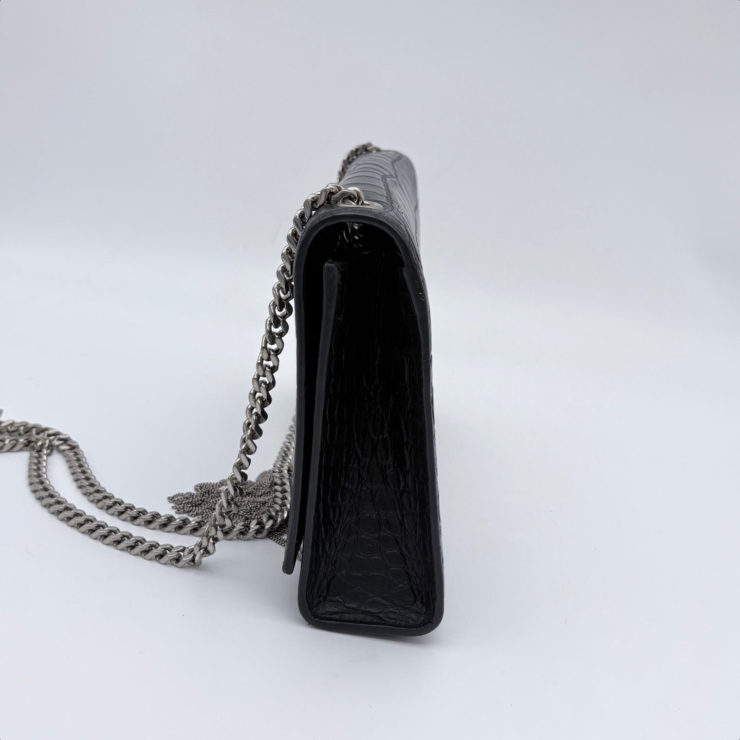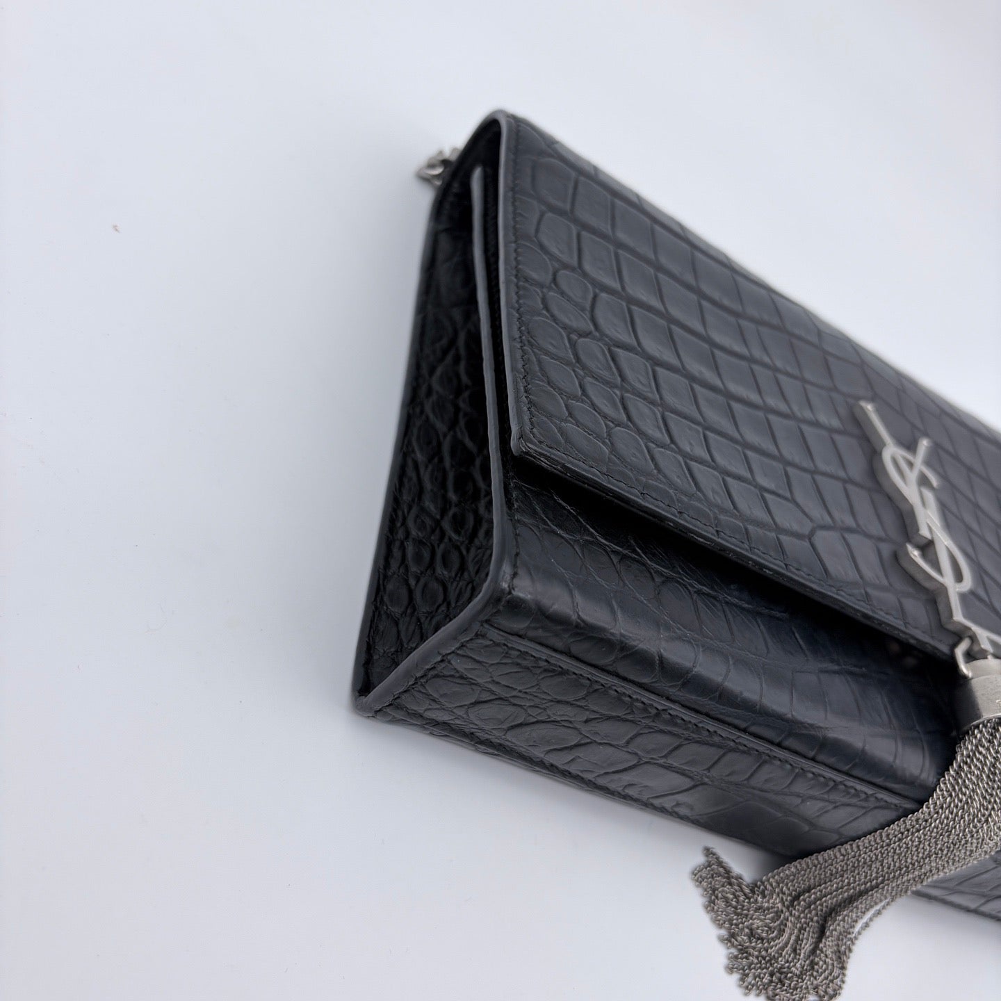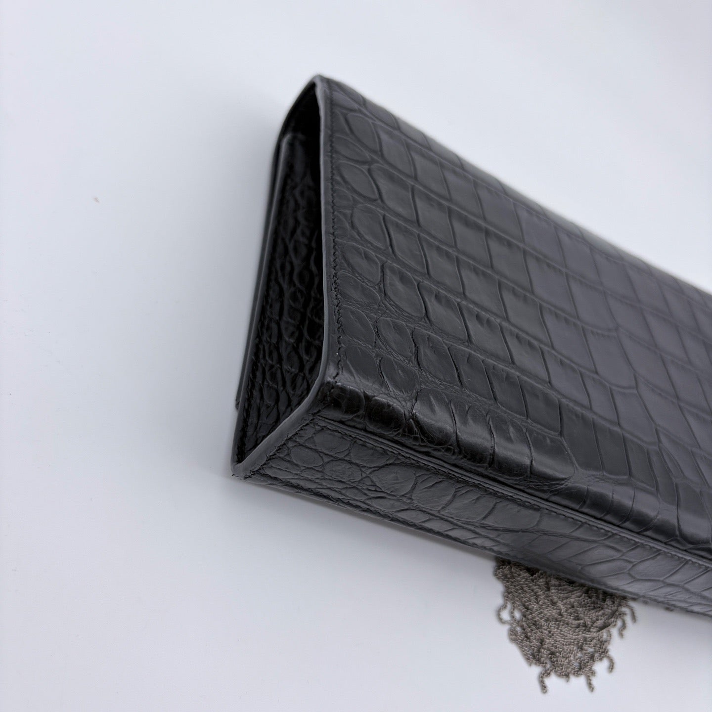 Sac iconique de la maison Saint Laurent, le Kate est reconnu pour son élégance intemporelle et son allure sophistiquée. Cette version enveloppe en cuir noir embossé effet crocodile est sublimée par des finitions argentées et la pampille (tassel) signature, emblème du modèle.